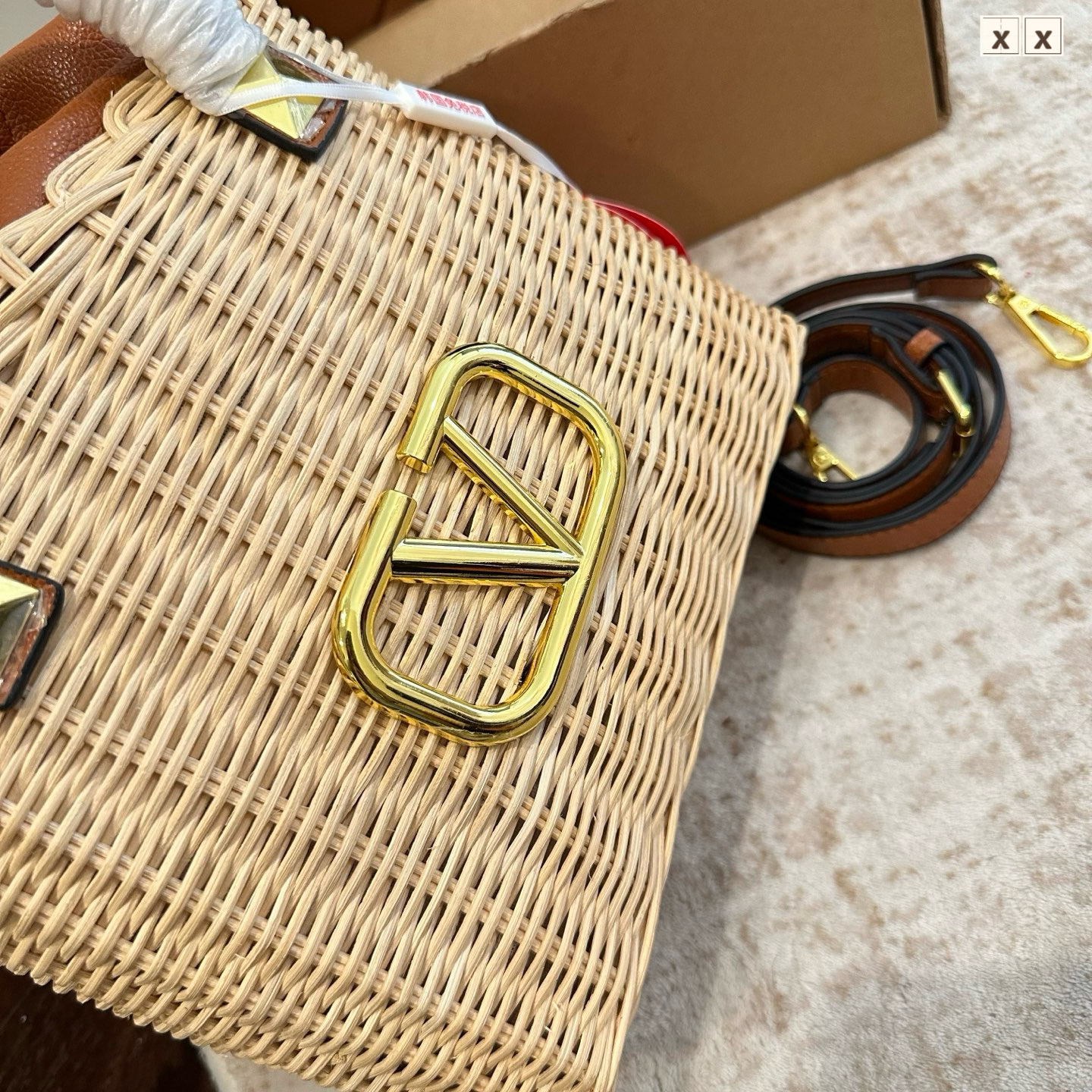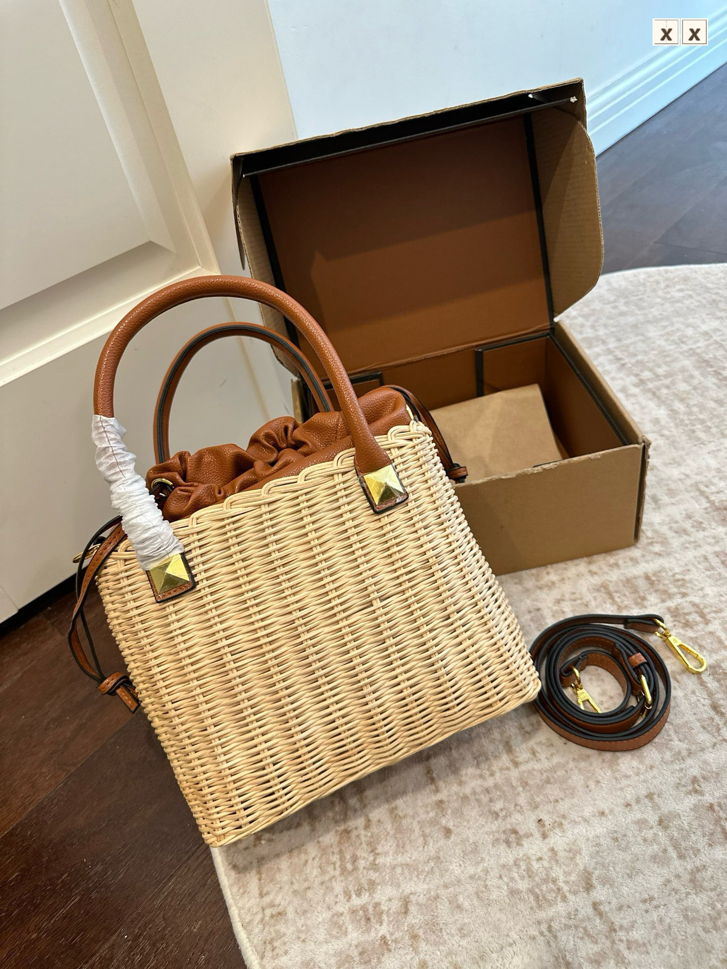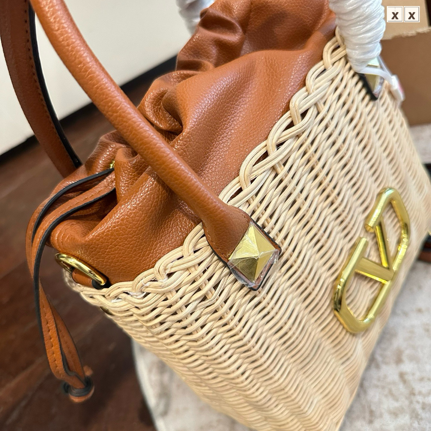 Valentino Garavani Gold VLogo Woven Raffia Leather Drawstring Lining Handle Basket Bucket Bag