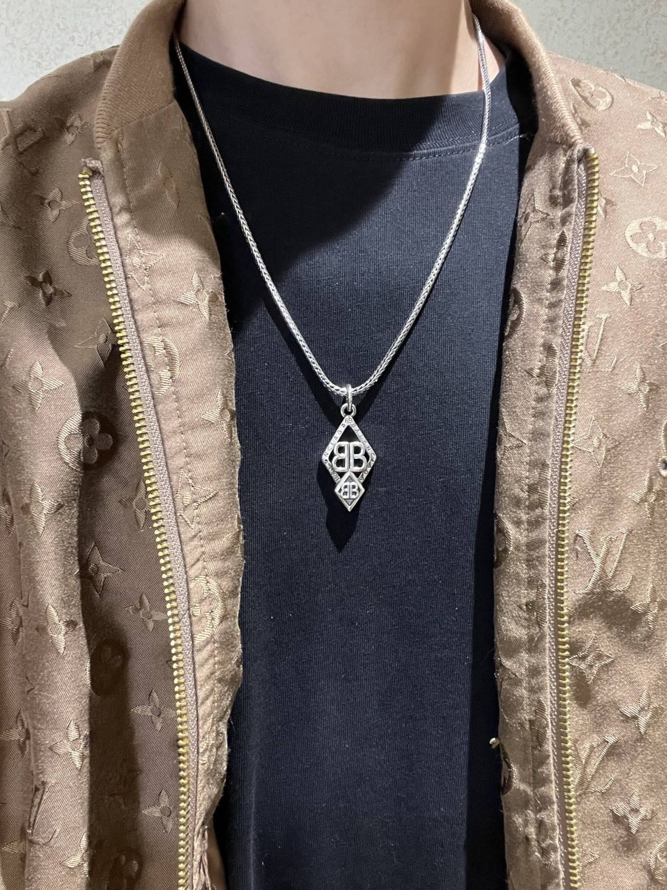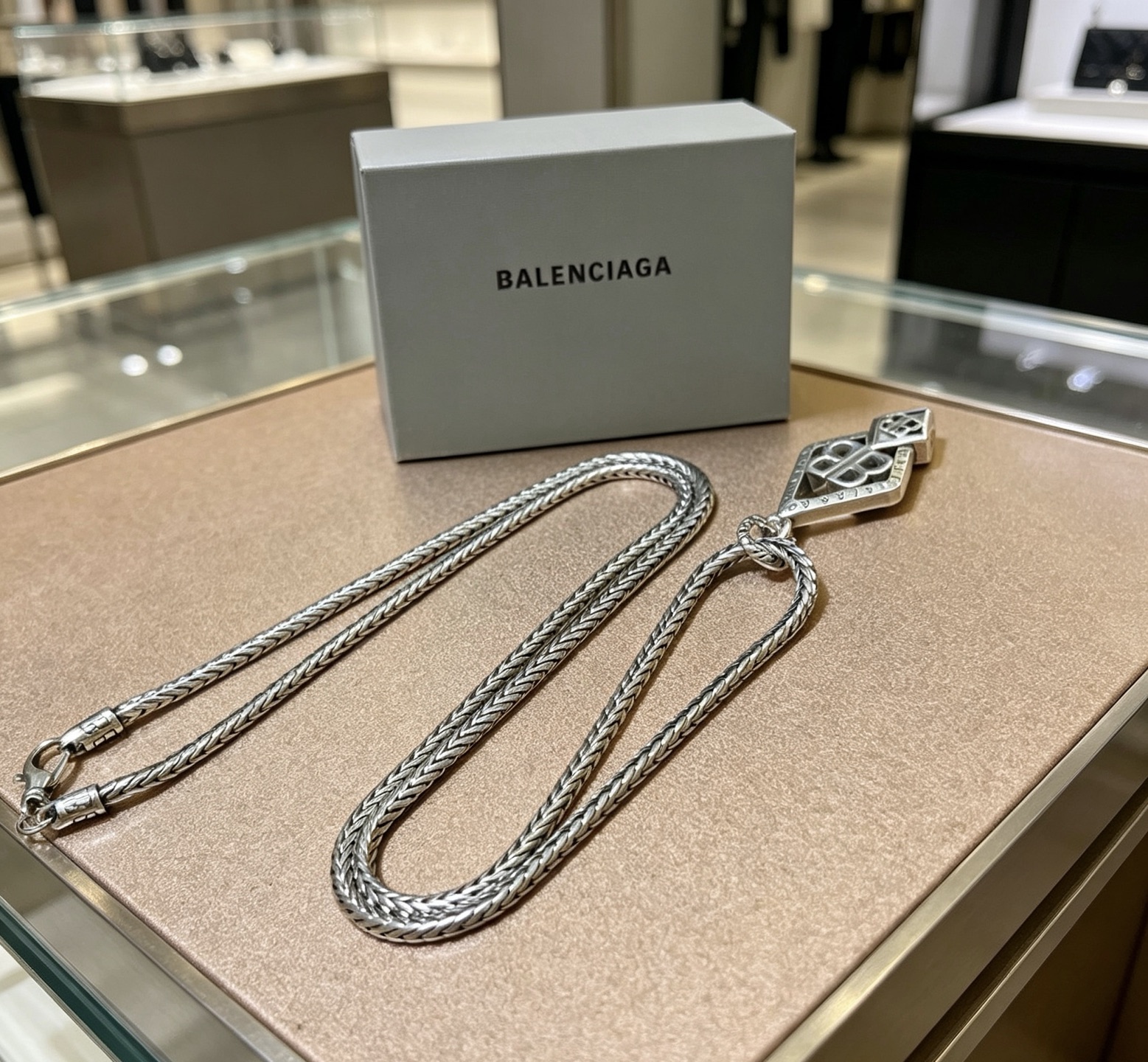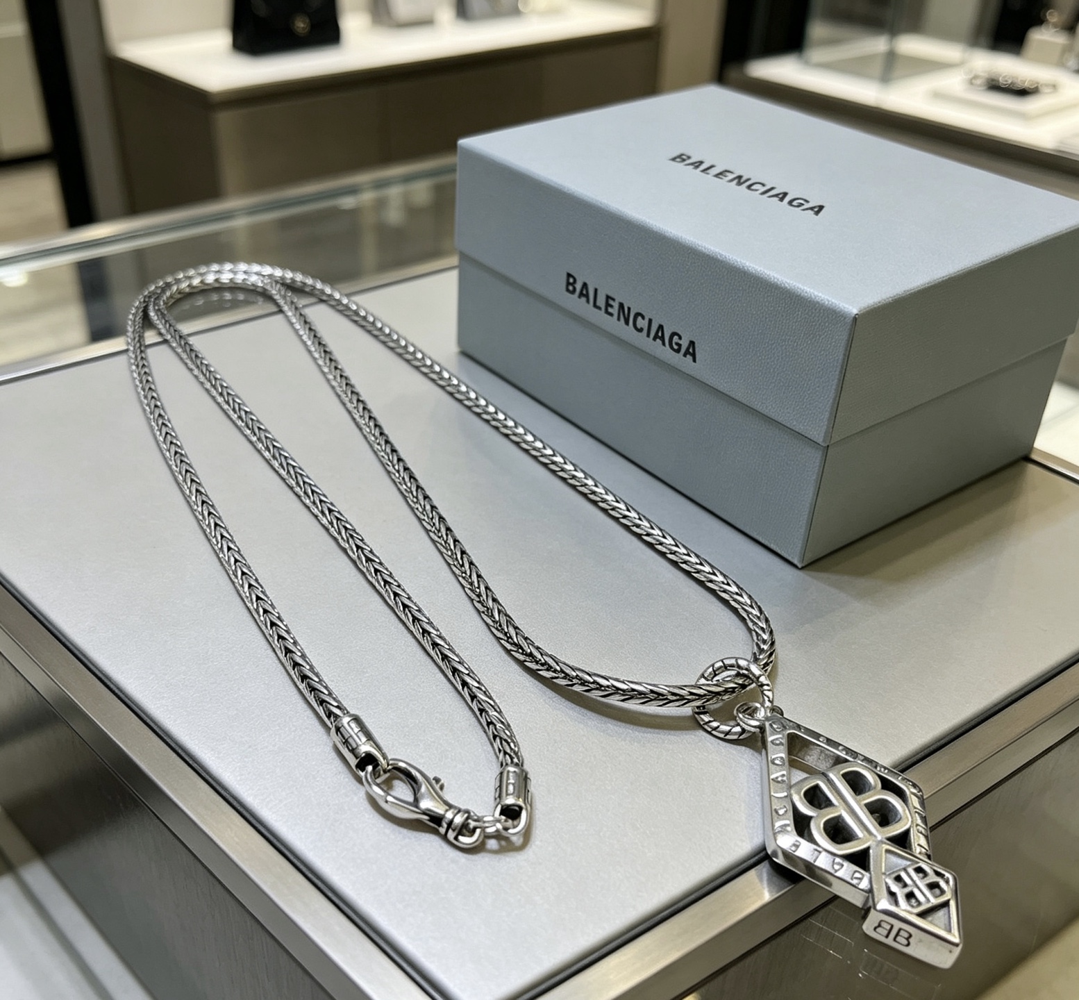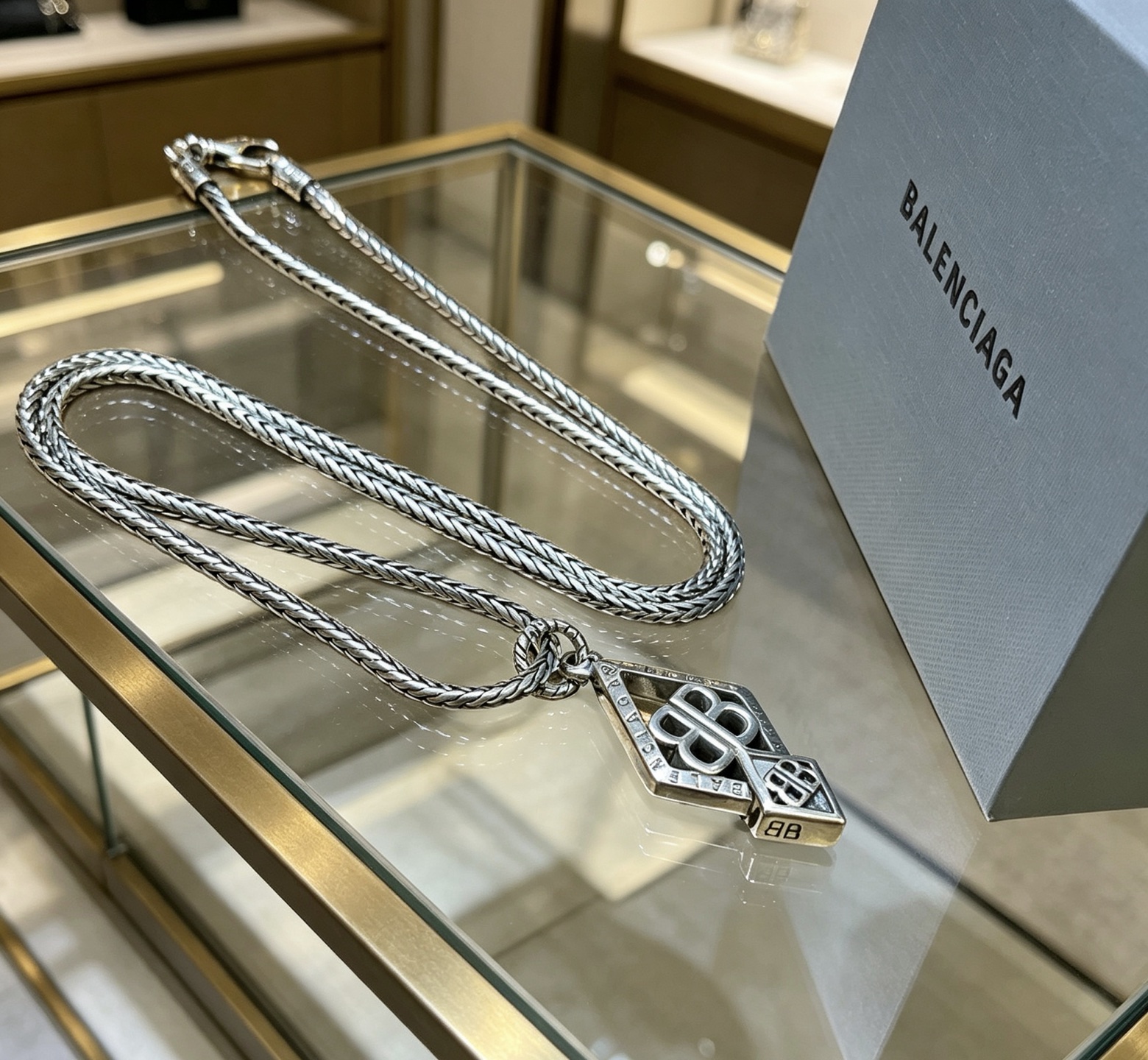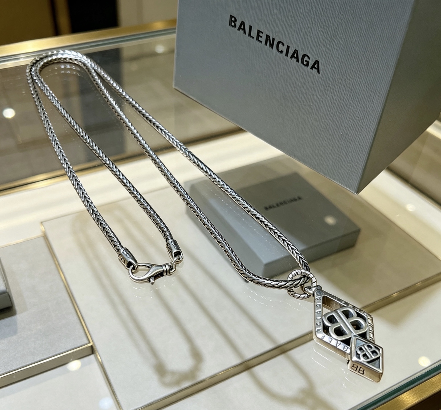 Balenciaga BB Icon Embossed Diamond Shaped Plaque Antique Silver Necklace