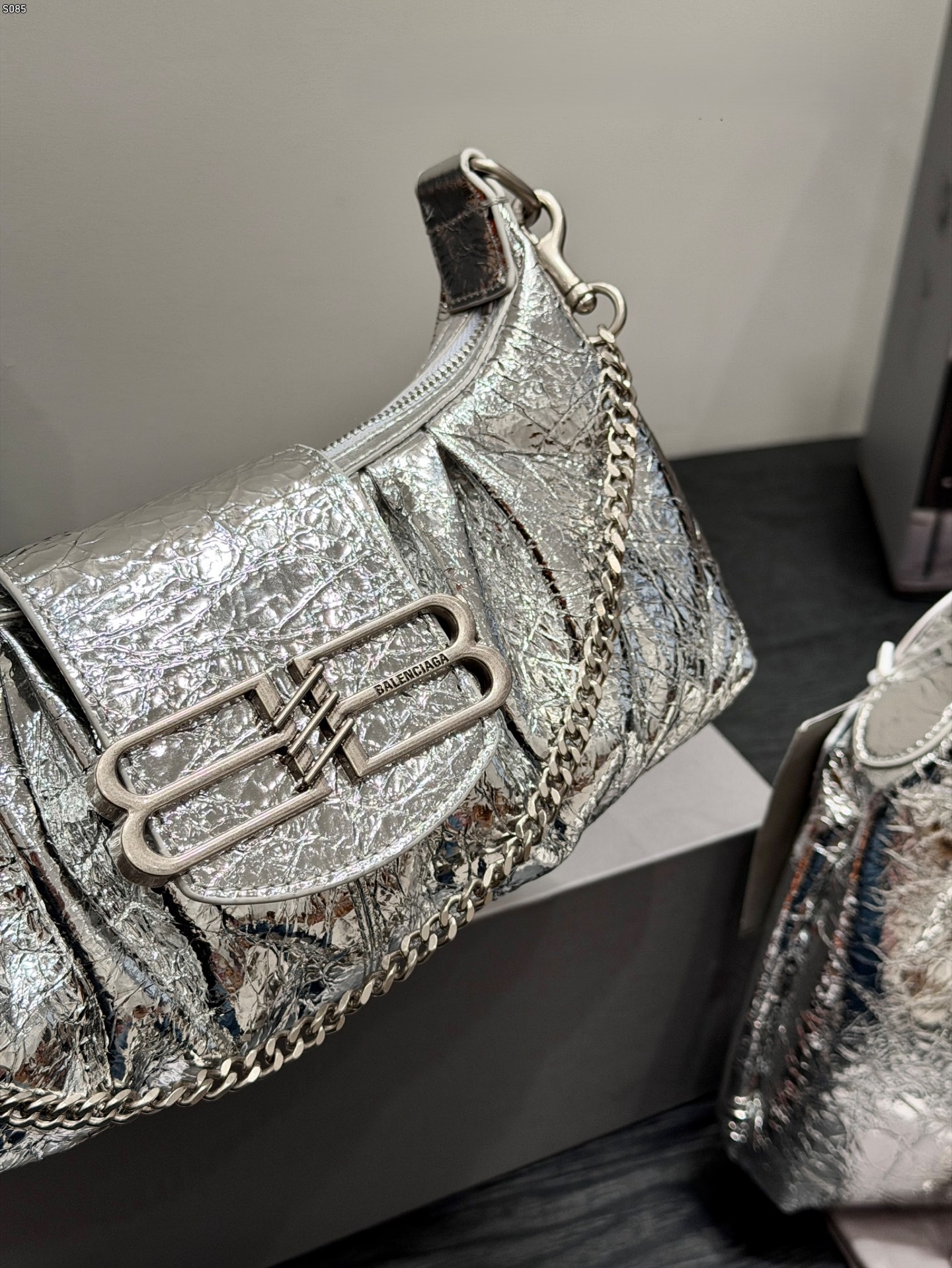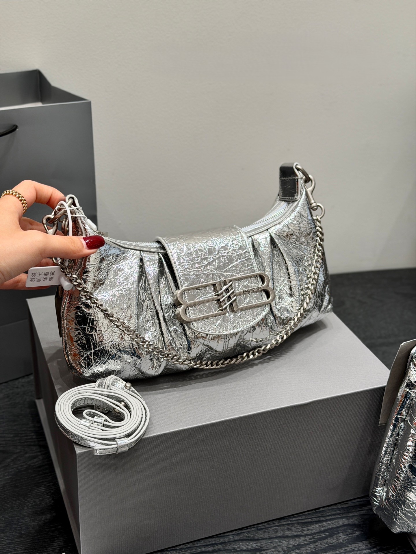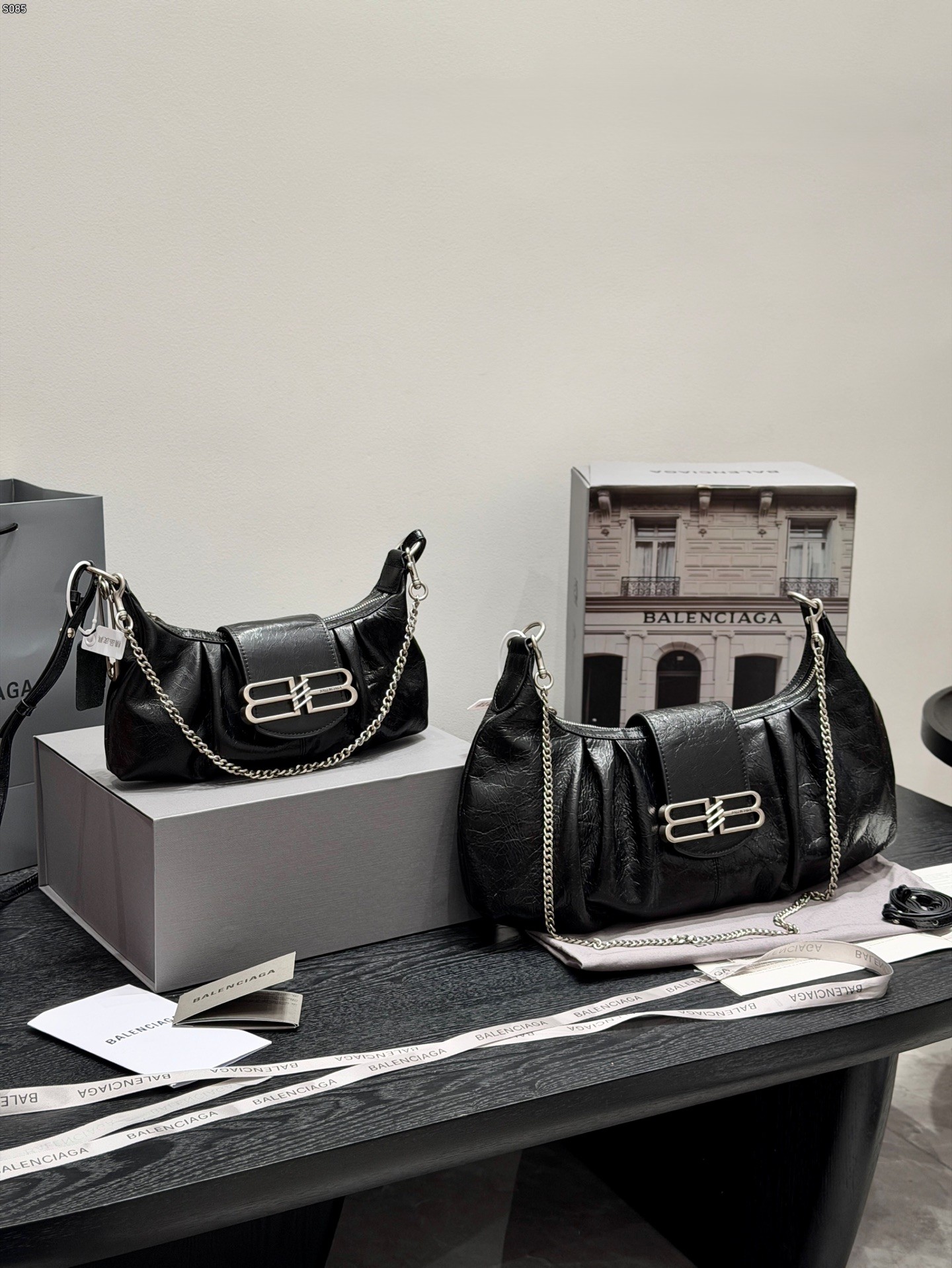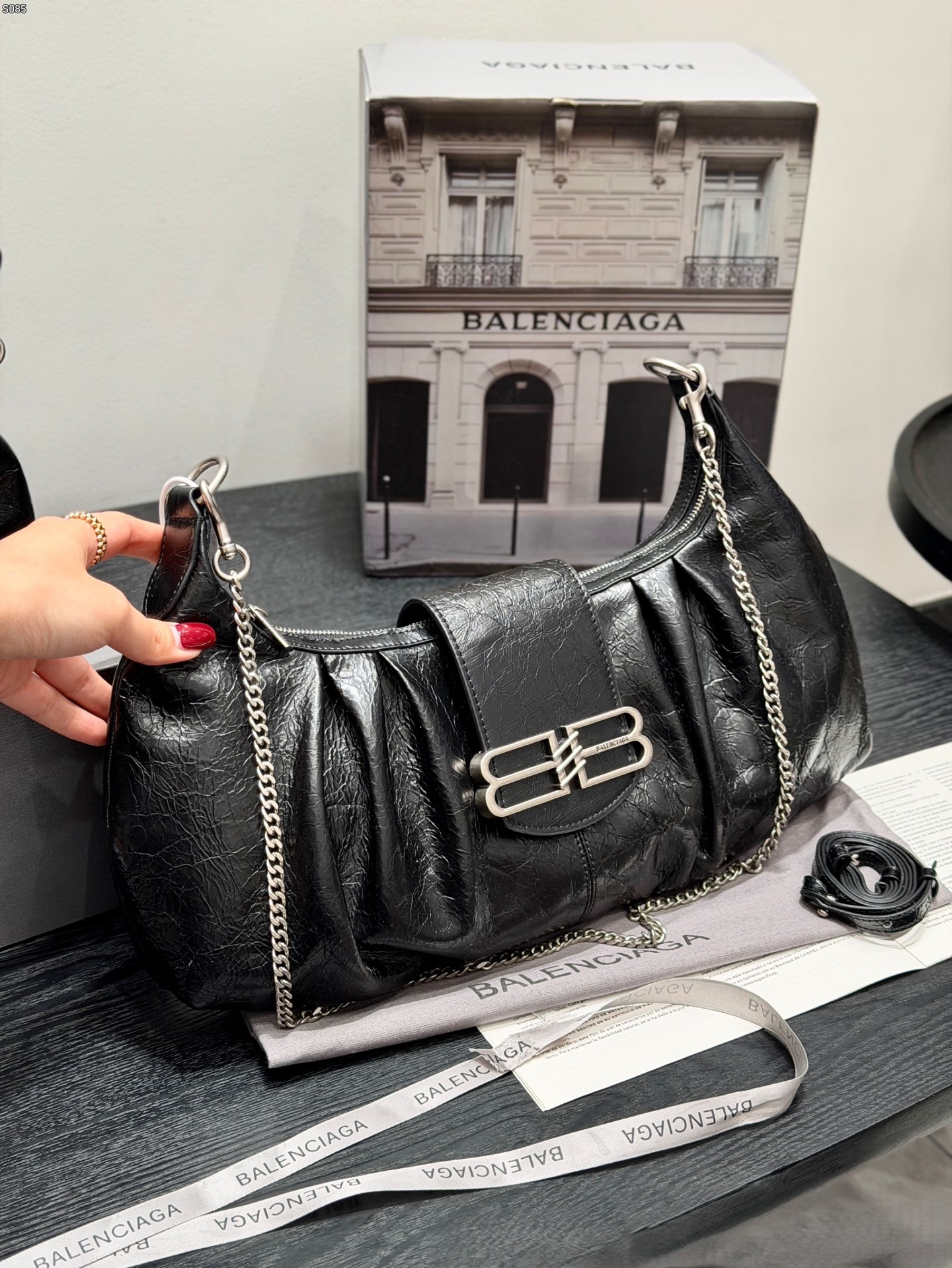 Balenciaga Black & Silver BB Logo Turn-Lock Soft Crinkled Leather Chain Pamela Safety Pin Shoulder Hobo Bag