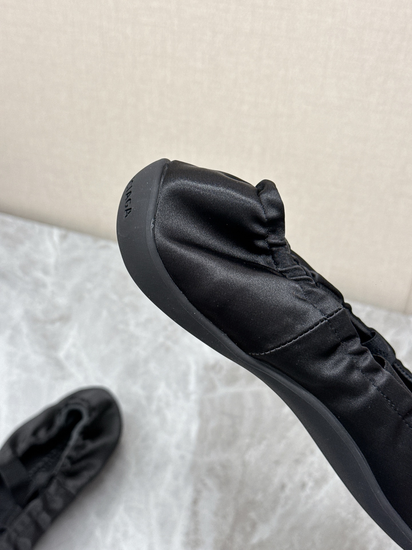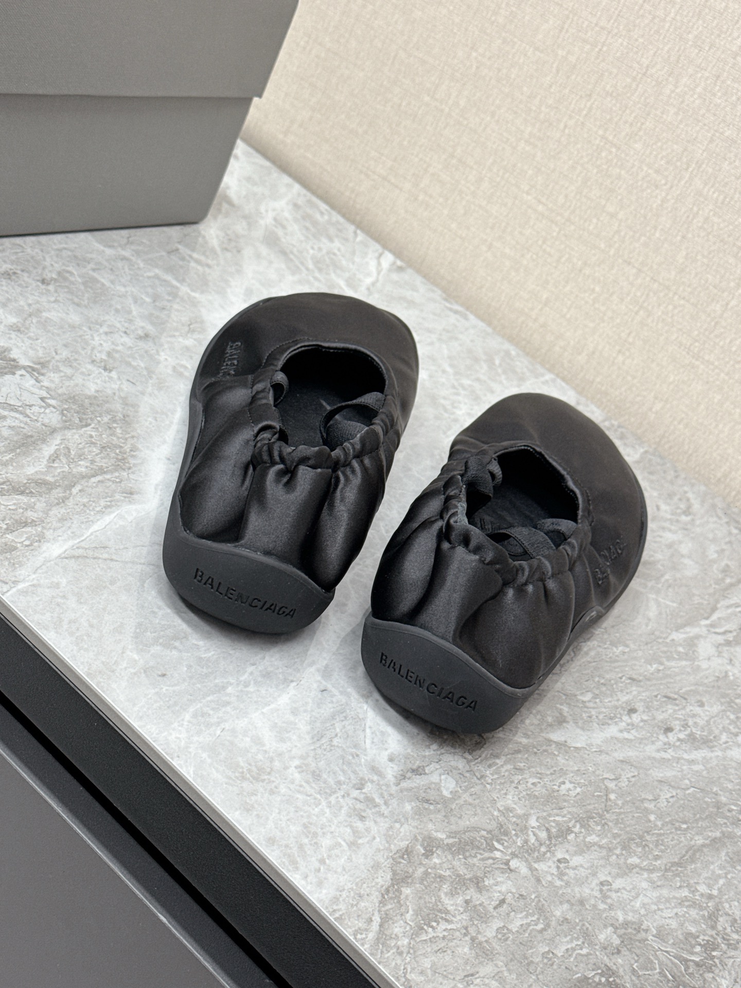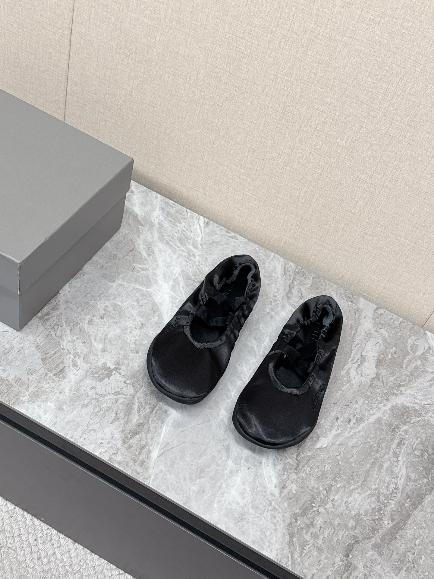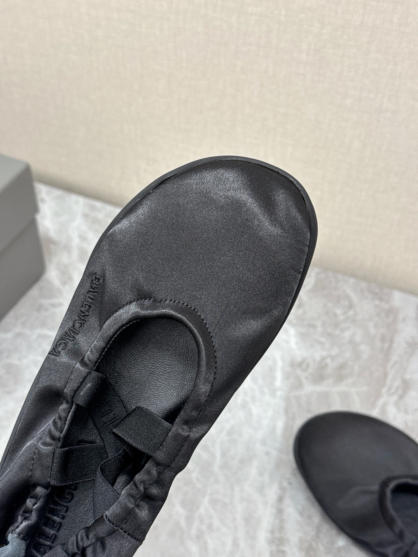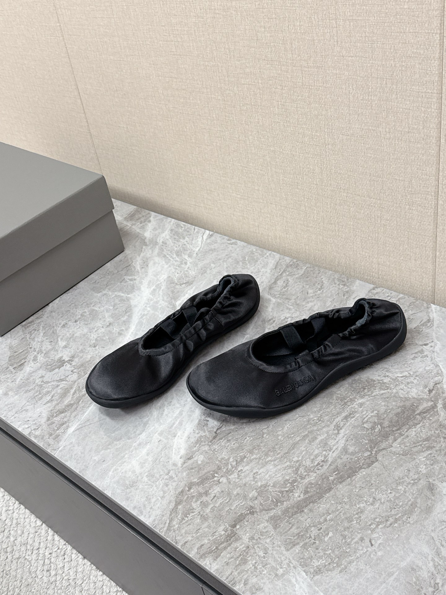 Balenciaga Leopold Black Satin Elastic Strap Side Embroidered Logo Round Toe Ballet Flats