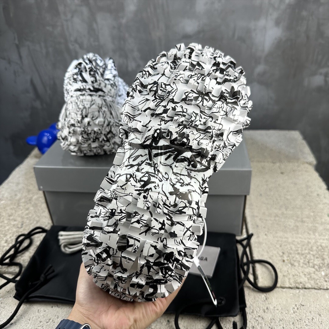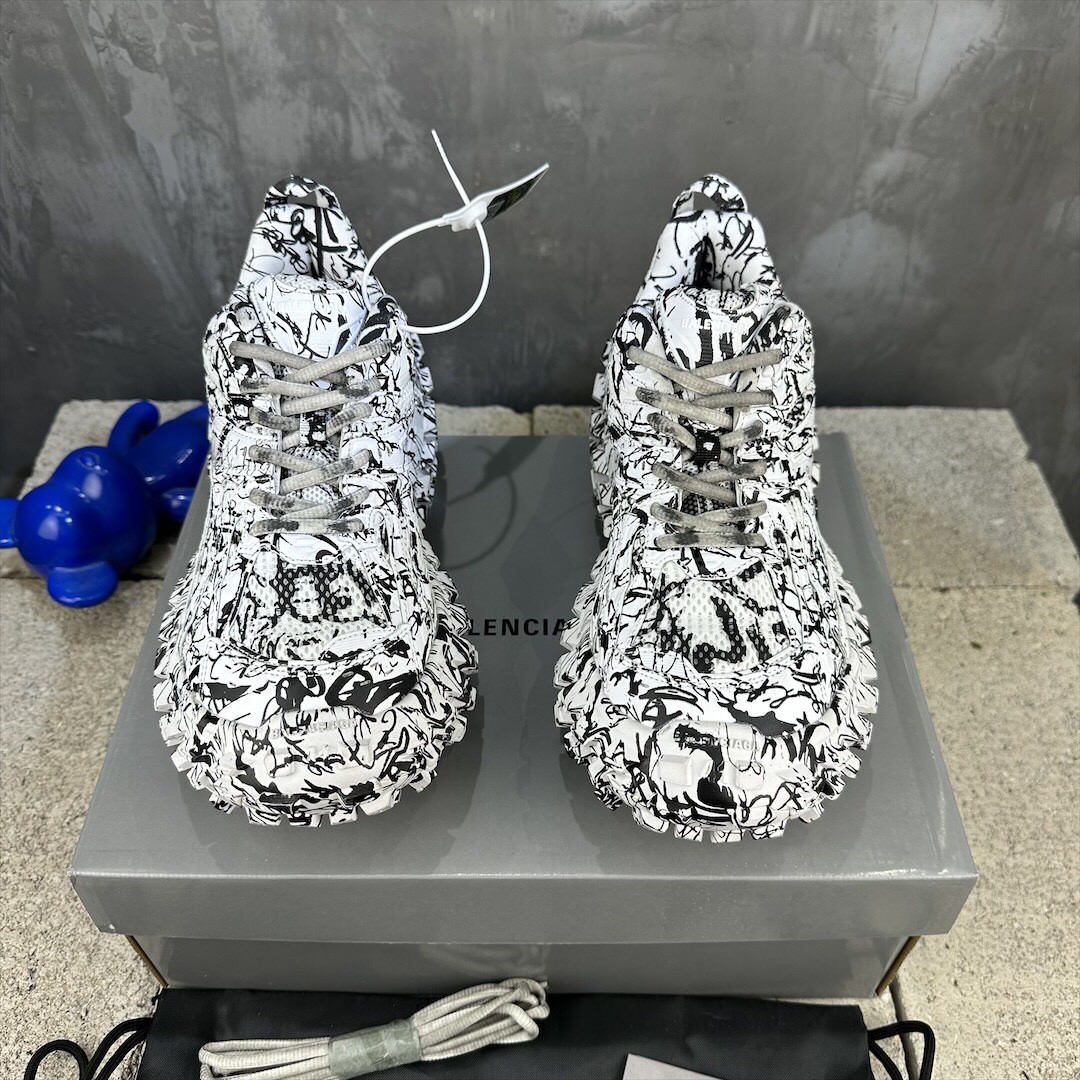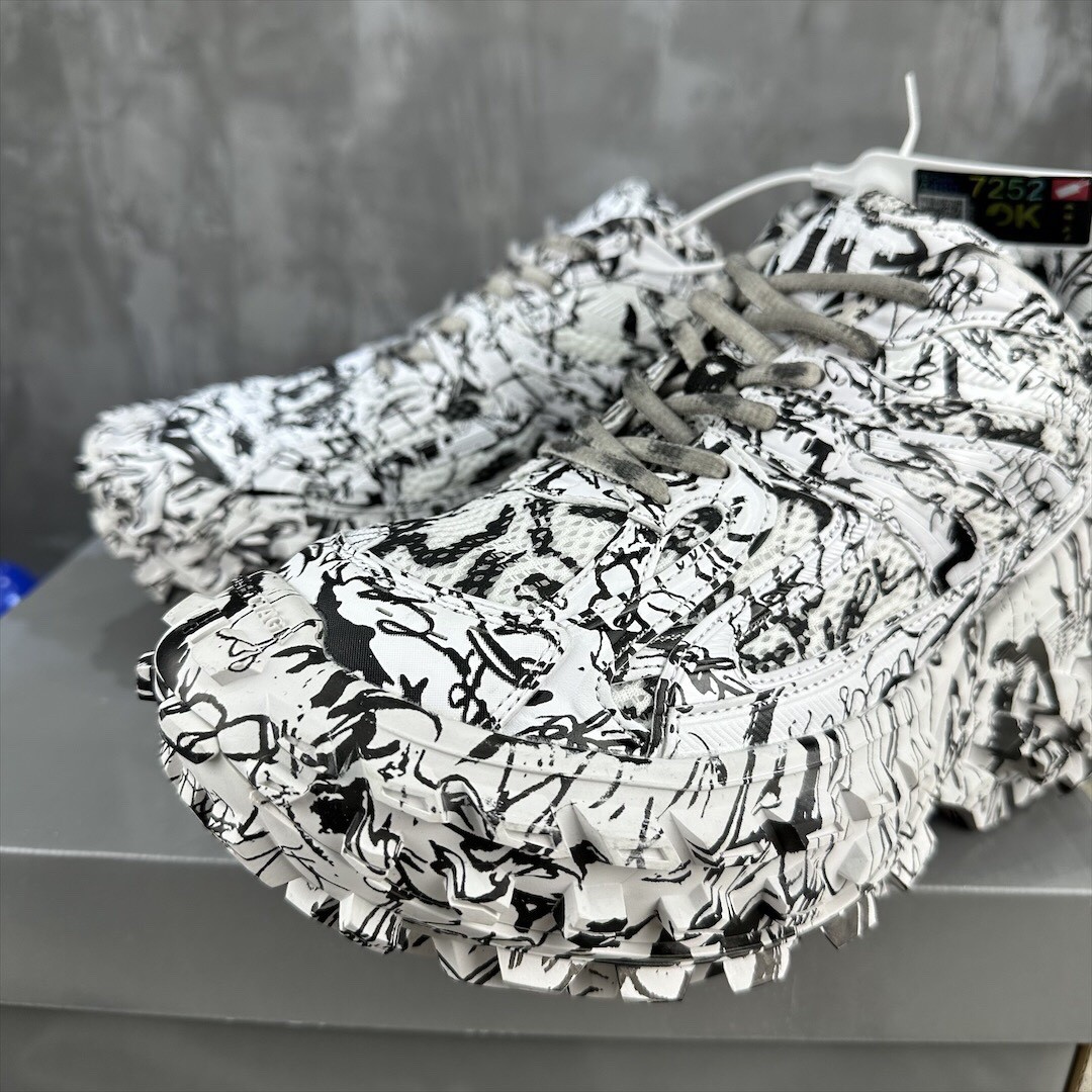 Balenciaga Bouncer Defender White Graffiti Scribble Muddy Mesh Nylon Rounded Chunky Tire Sole Sneakers /10A
