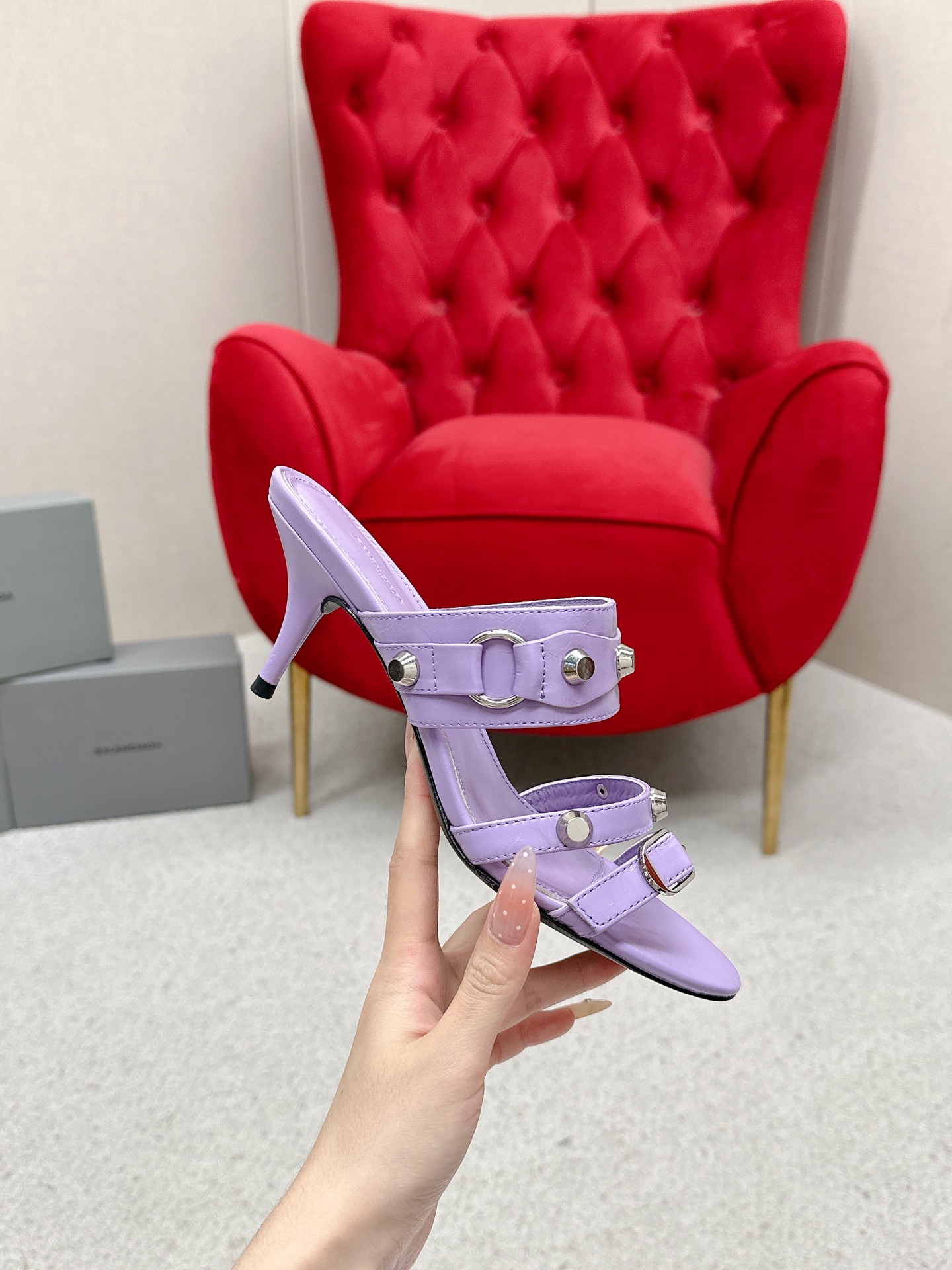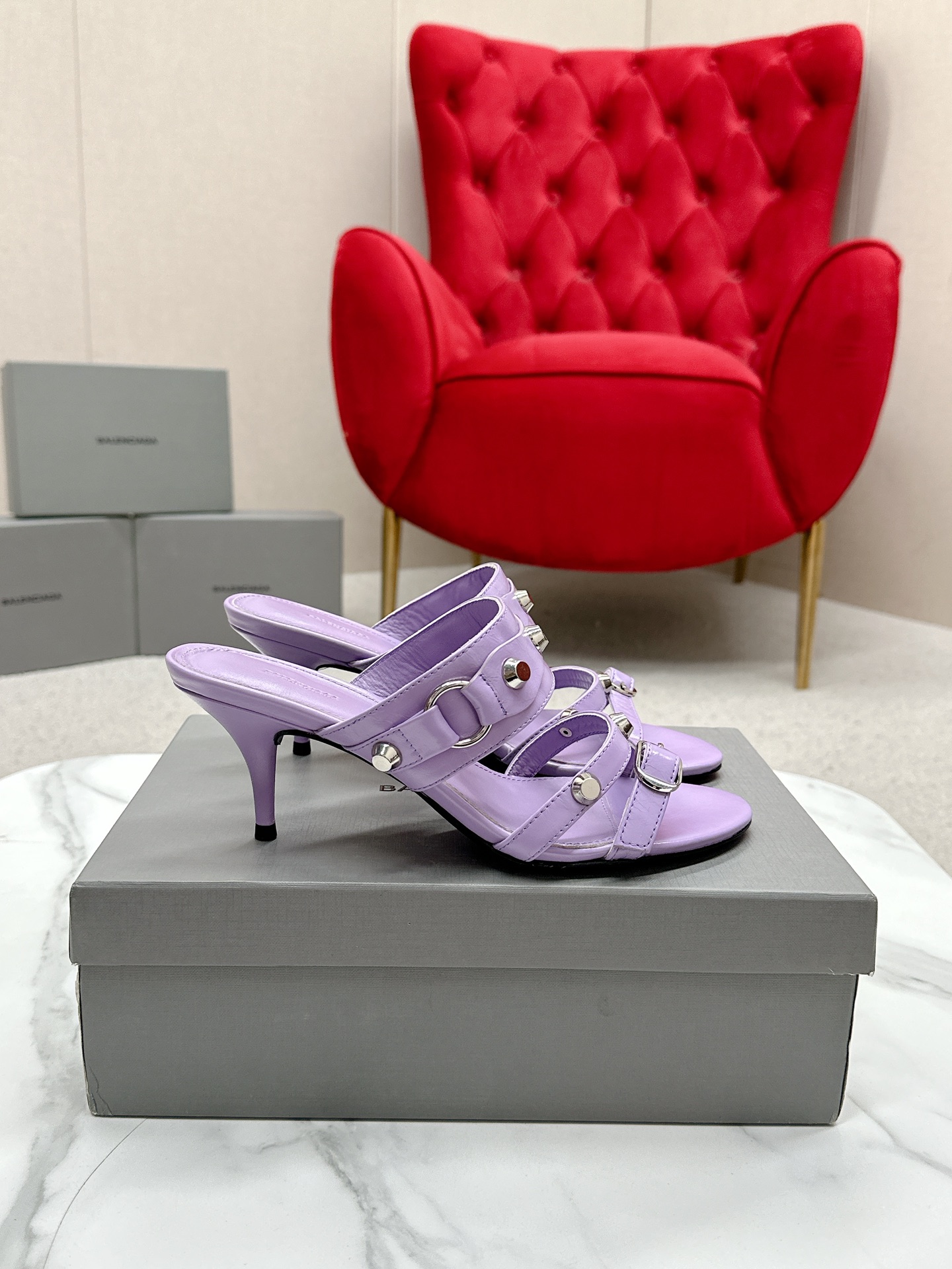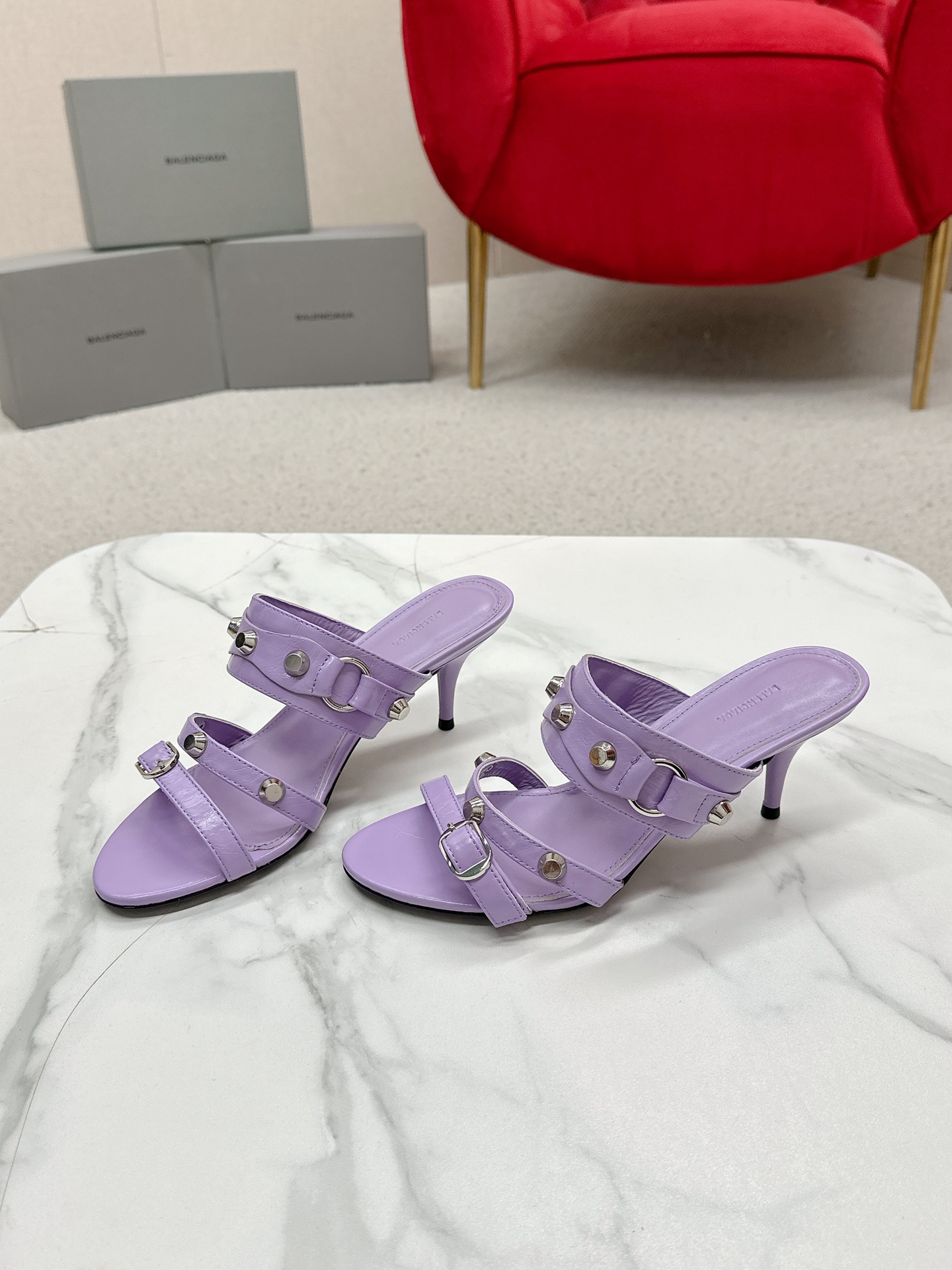Balenciaga Cagole Purple Leather Studded Buckle Strap Pointed Toe Kitten Mules Heels /Top Version