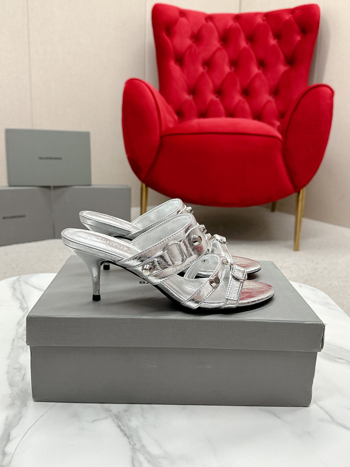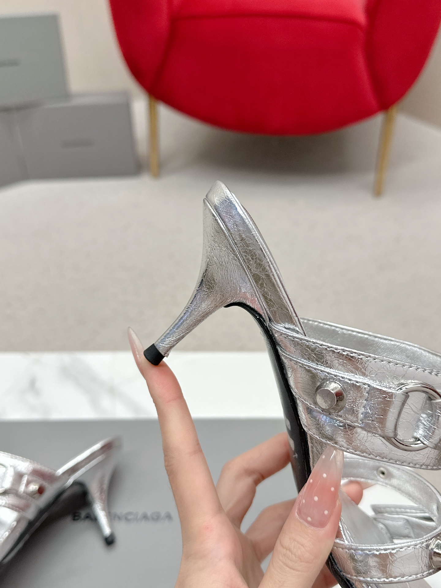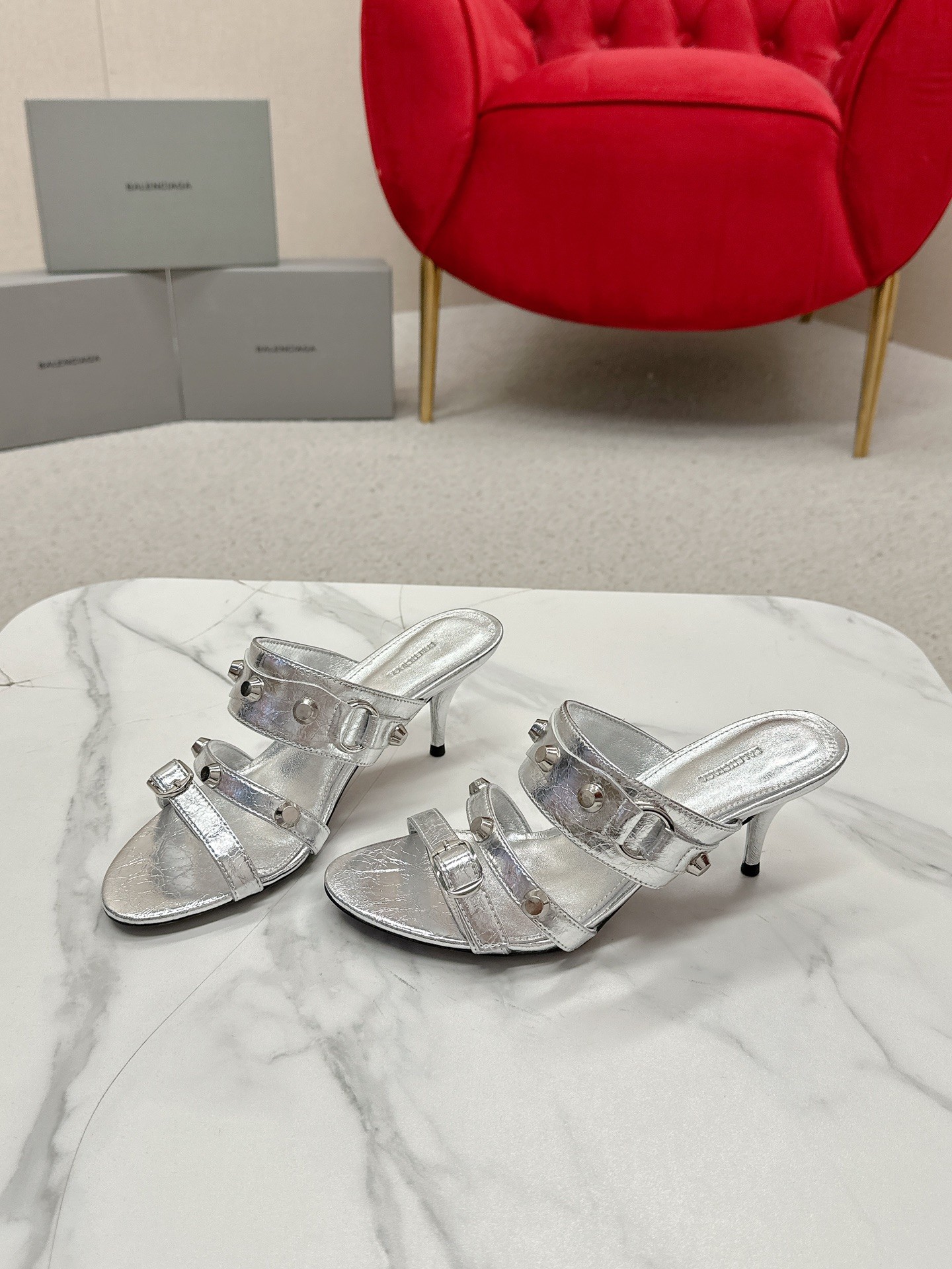 Balenciaga Cagole Silver Leather Studded Buckle Strap Pointed Toe Kitten Mules Heels /Top Version