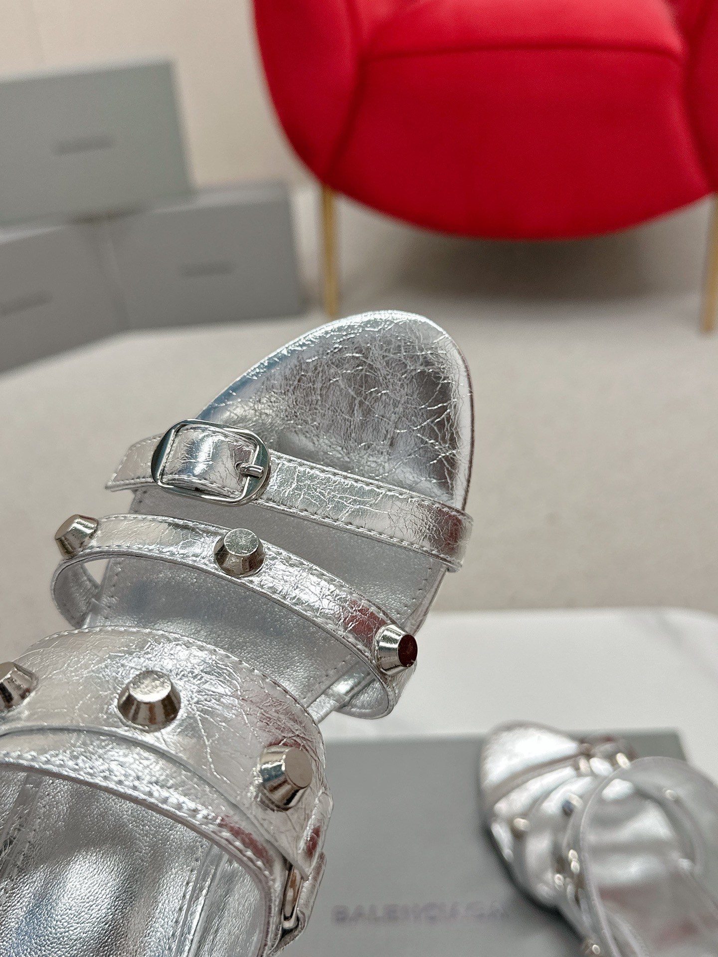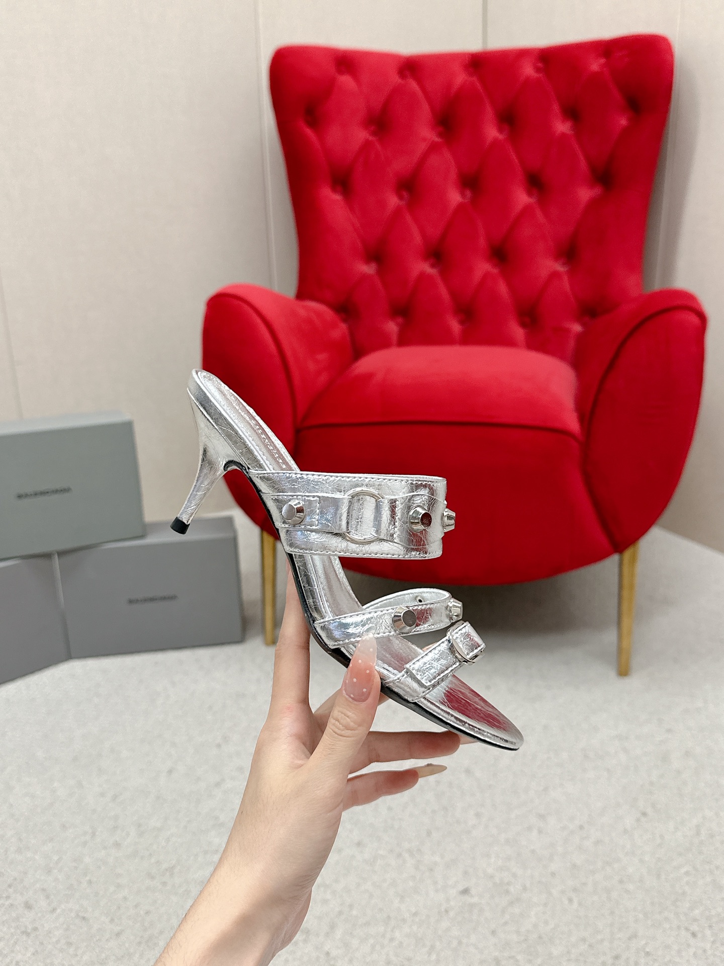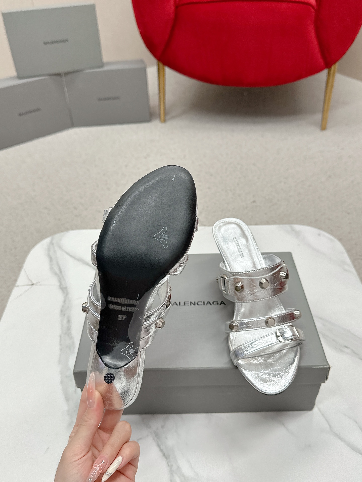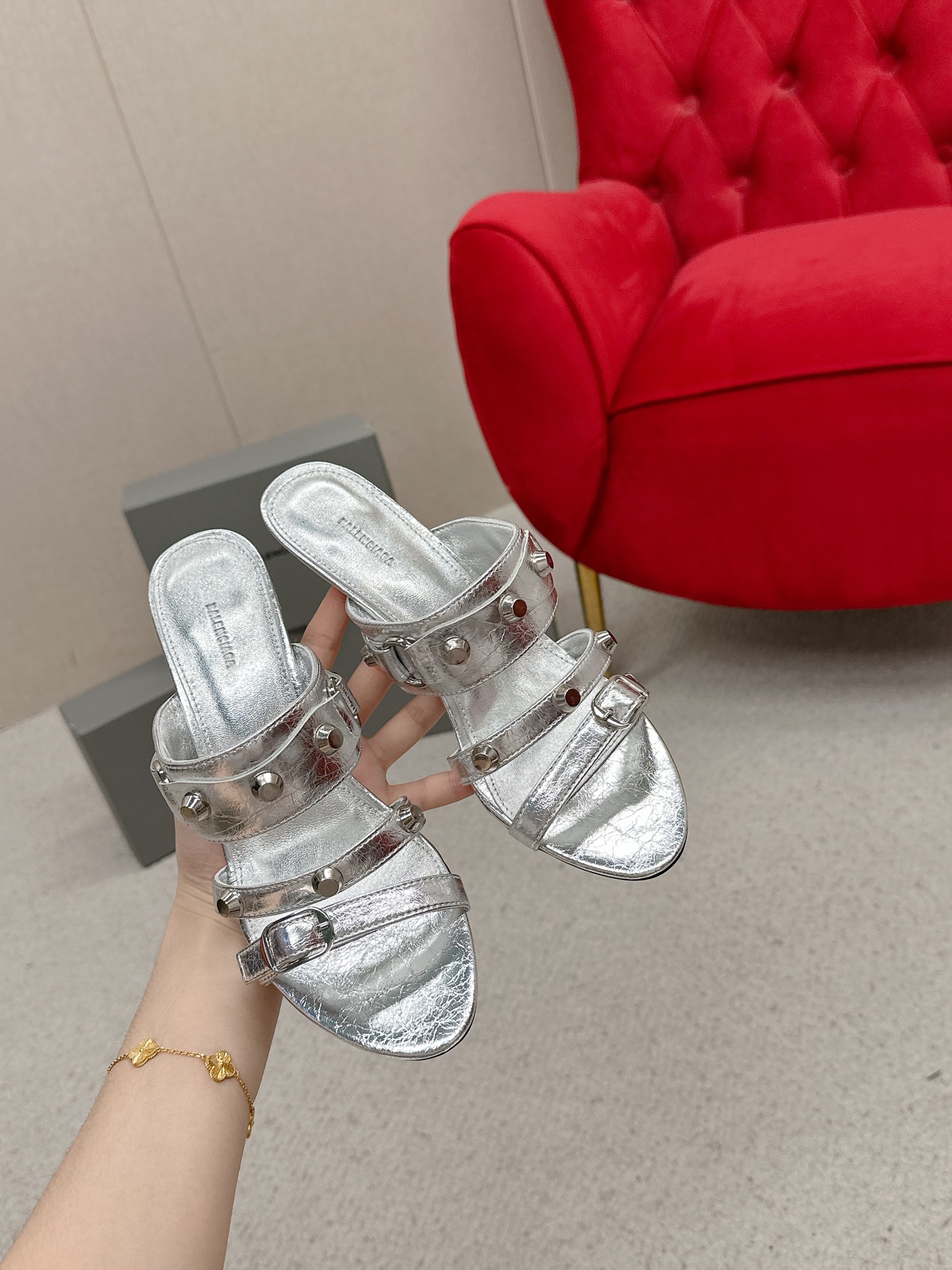 Balenciaga Cagole Silver Leather Studded Buckle Strap Pointed Toe Kitten Mules Heels /Top Version