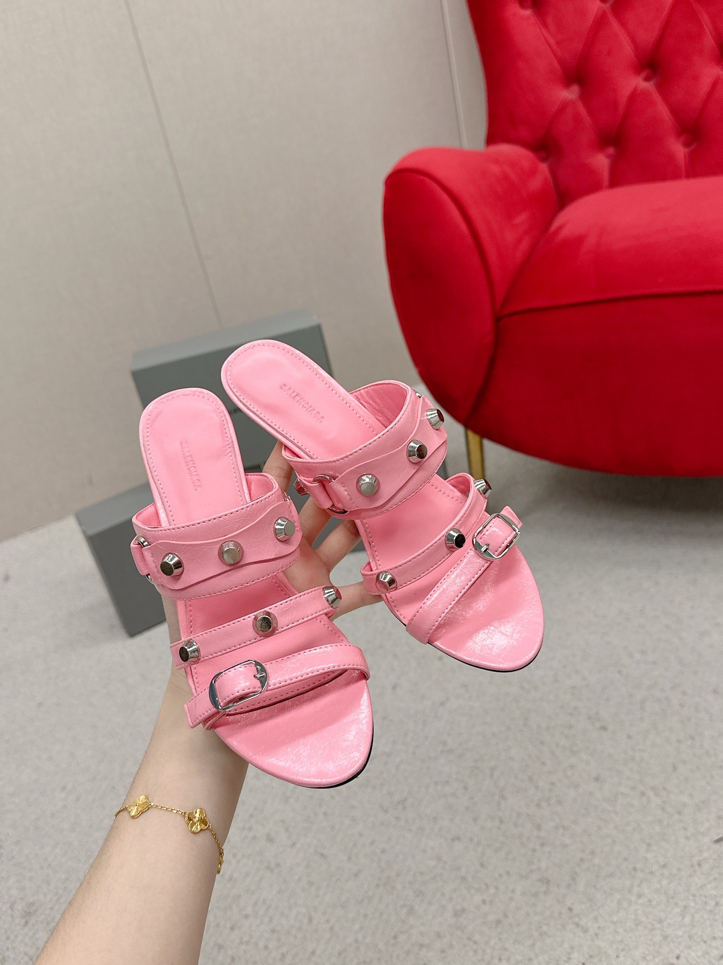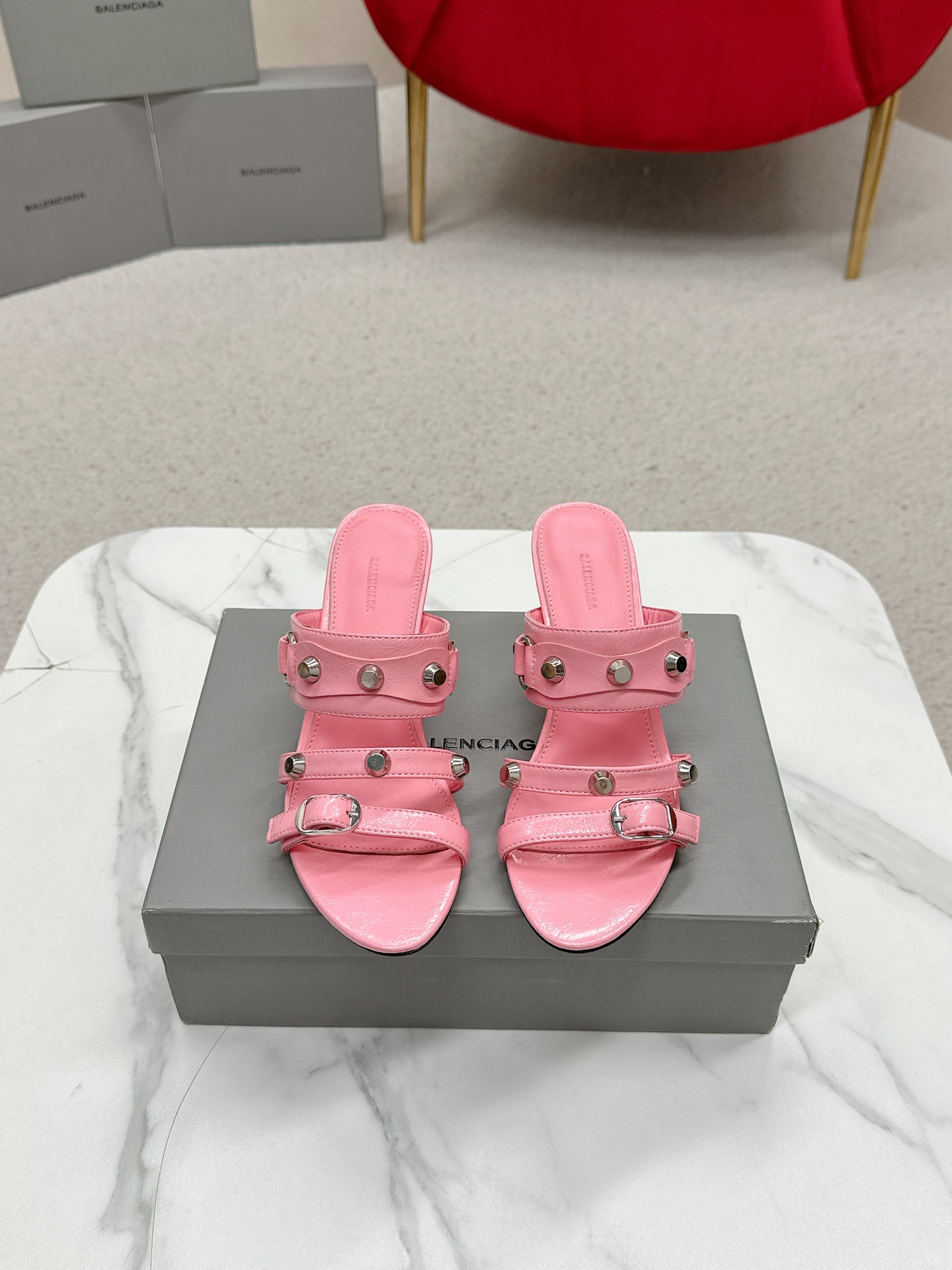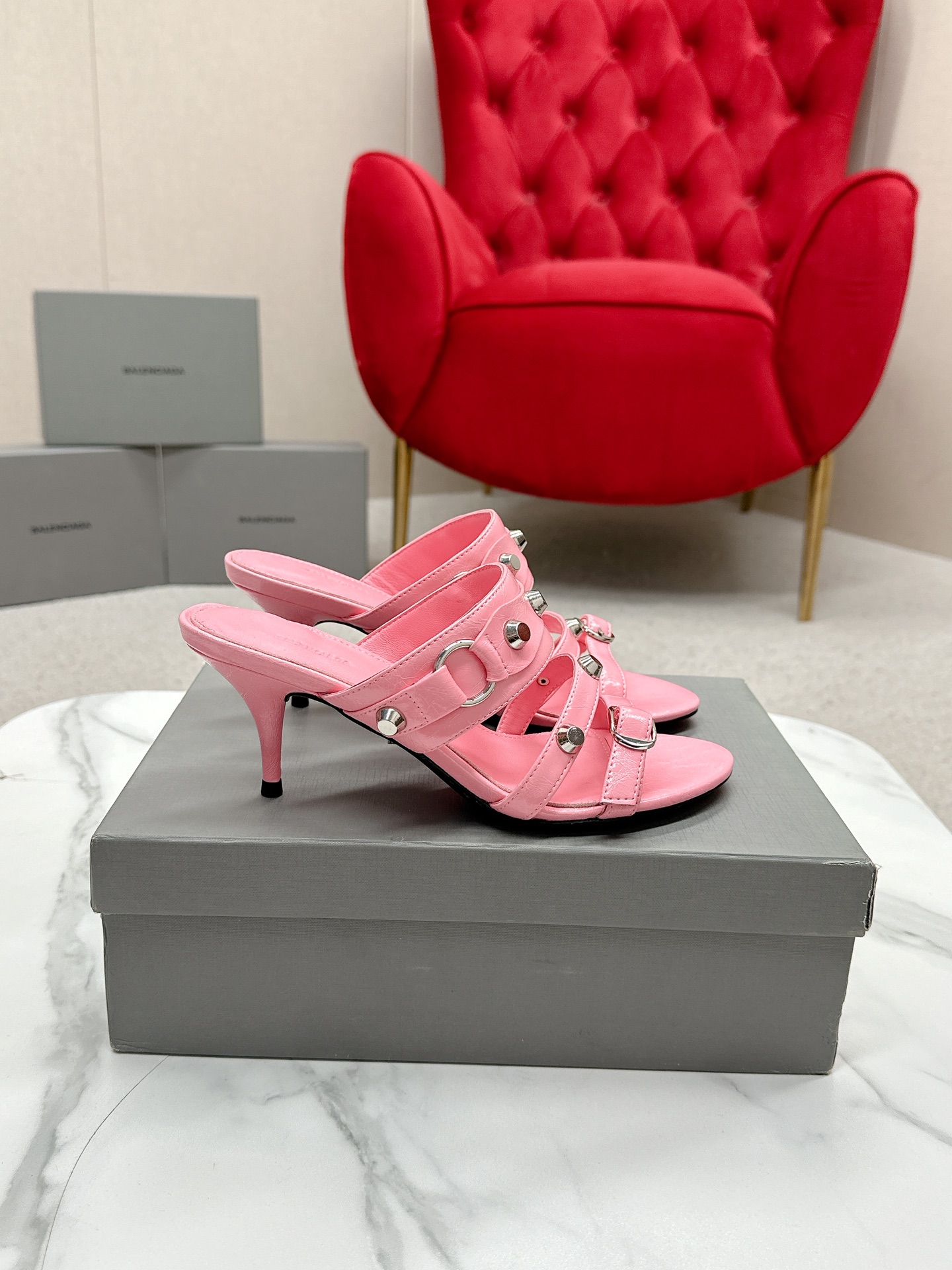 Balenciaga Cagole Pink Leather Studded Buckle Strap Pointed Toe Kitten Mules Heels /Top Version
