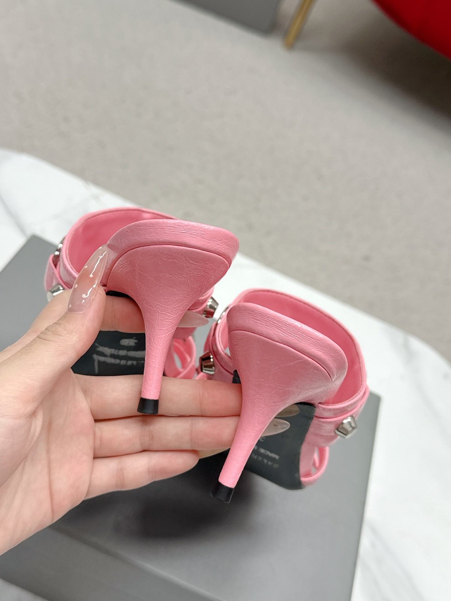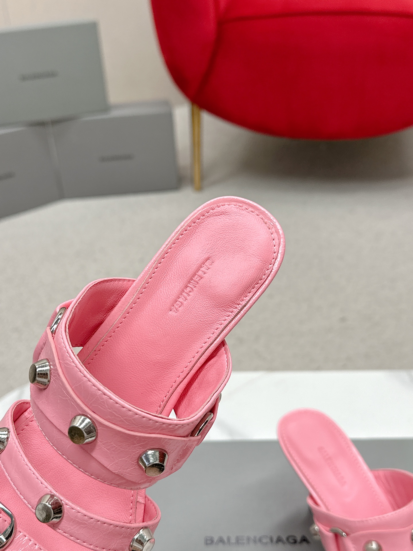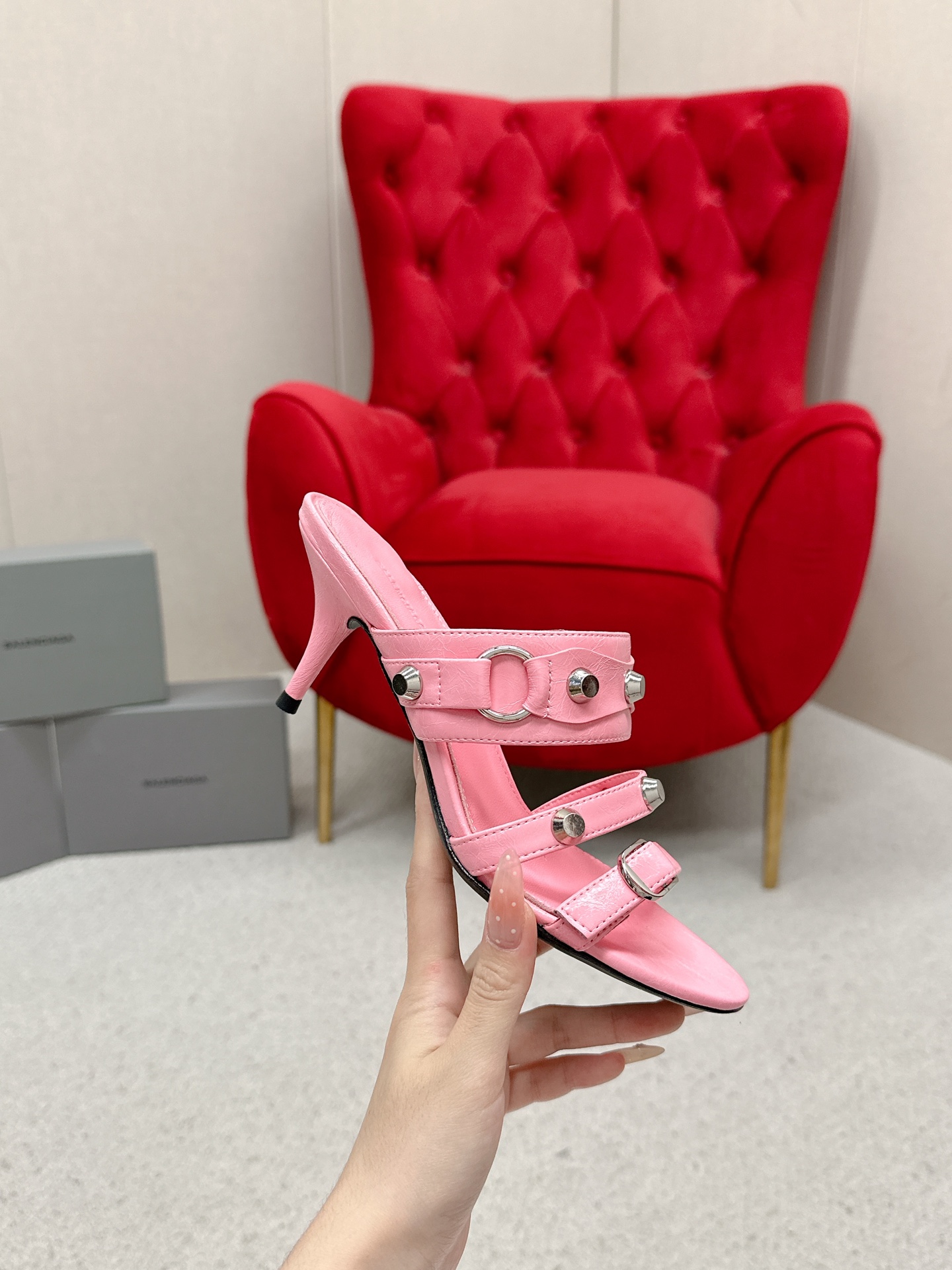 Balenciaga Cagole Pink Leather Studded Buckle Strap Pointed Toe Kitten Mules Heels /Top Version