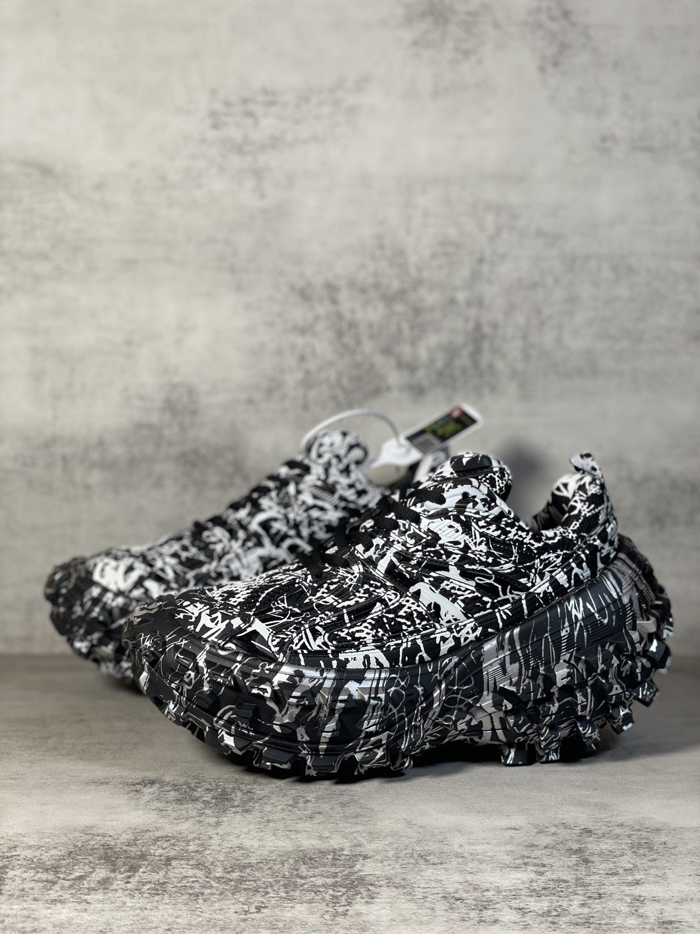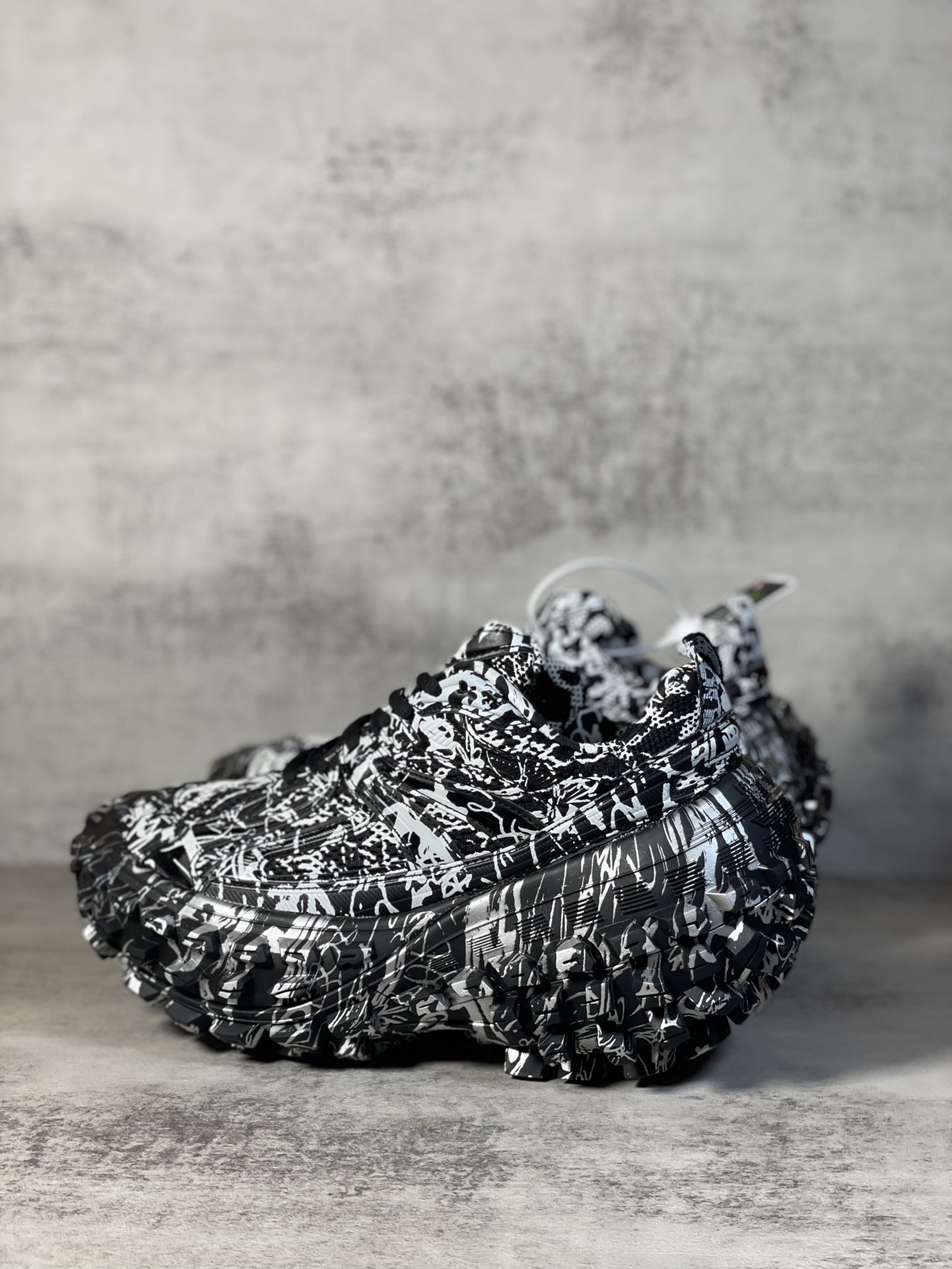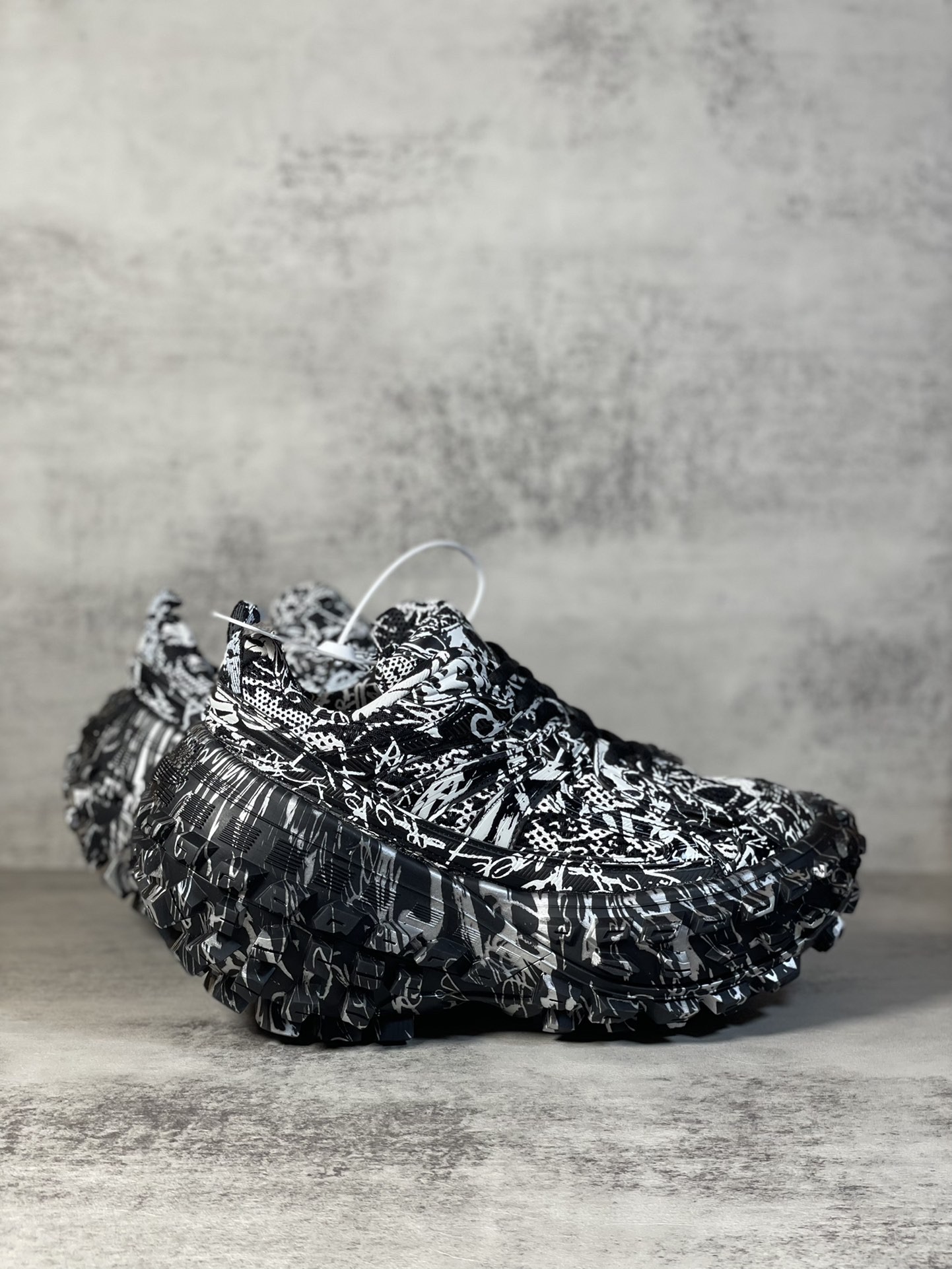 Balenciaga Bouncer Defender Black Graffiti Scribble Muddy Mesh Nylon Rounded Chunky Tire Sole Sneakers /10A