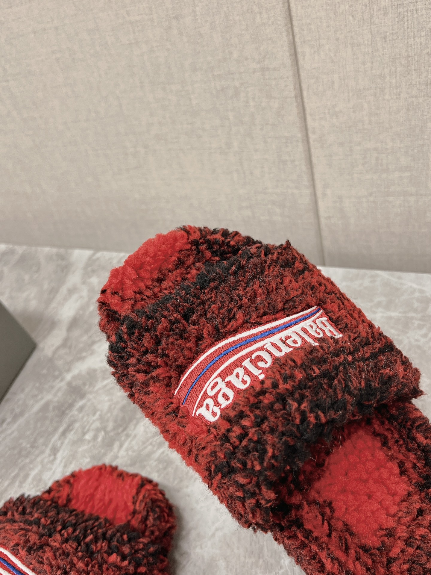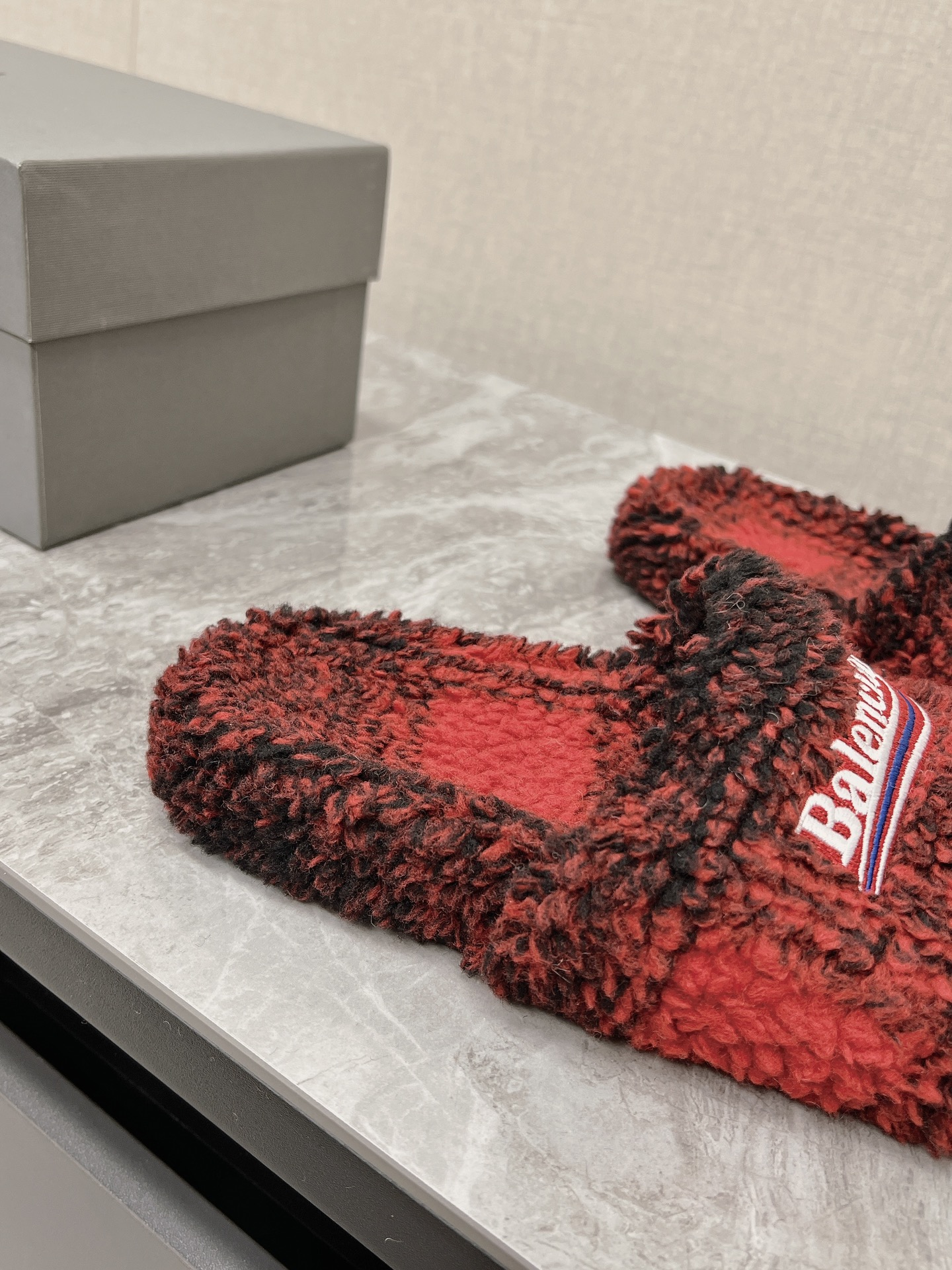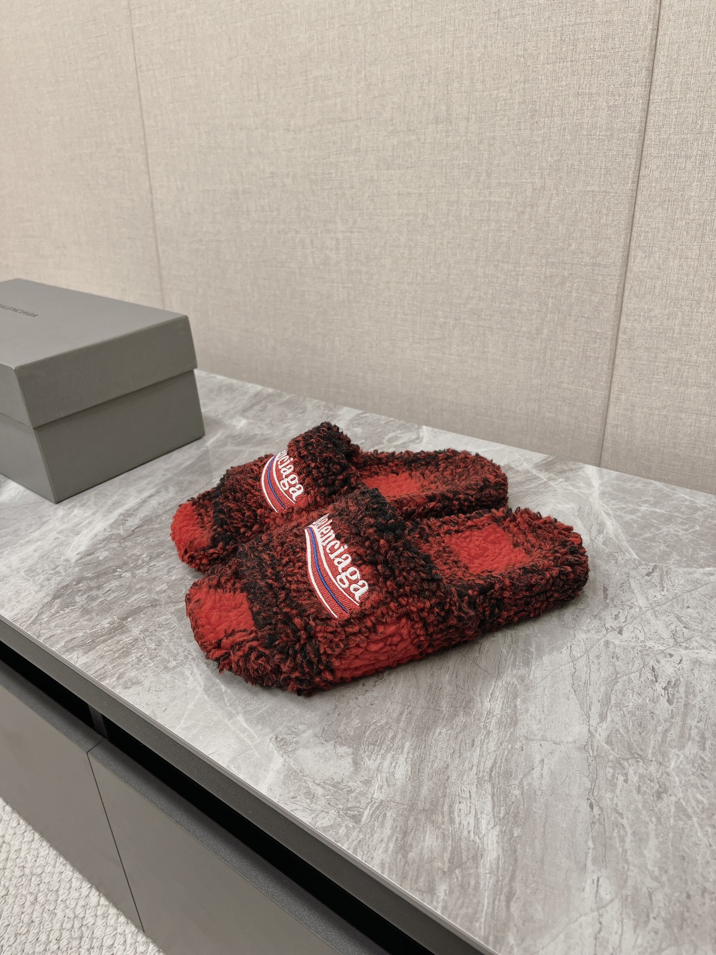 Balenciaga Political Campaign Logo Round Toe Red Black Plaid Faux Fur Slippers