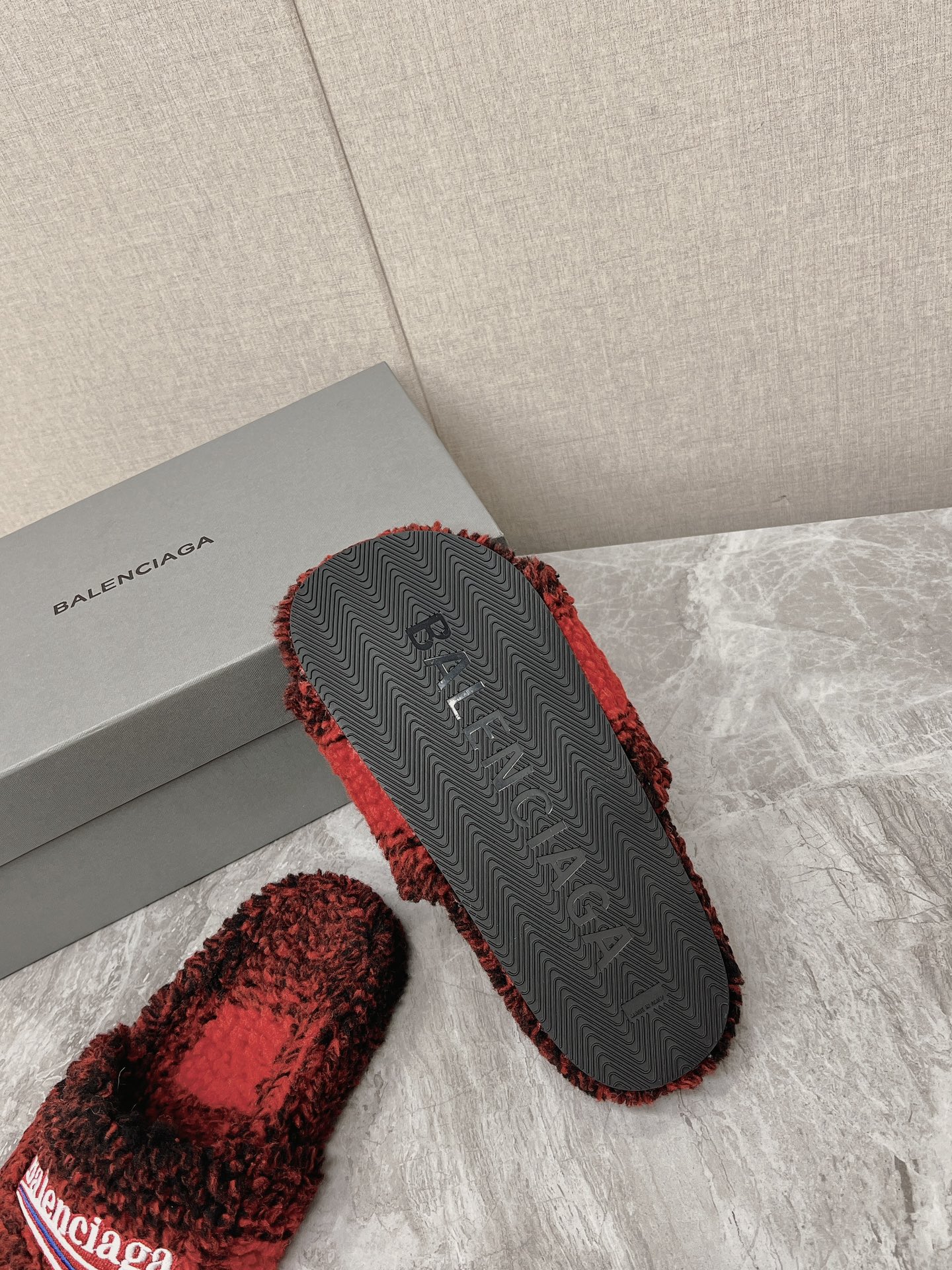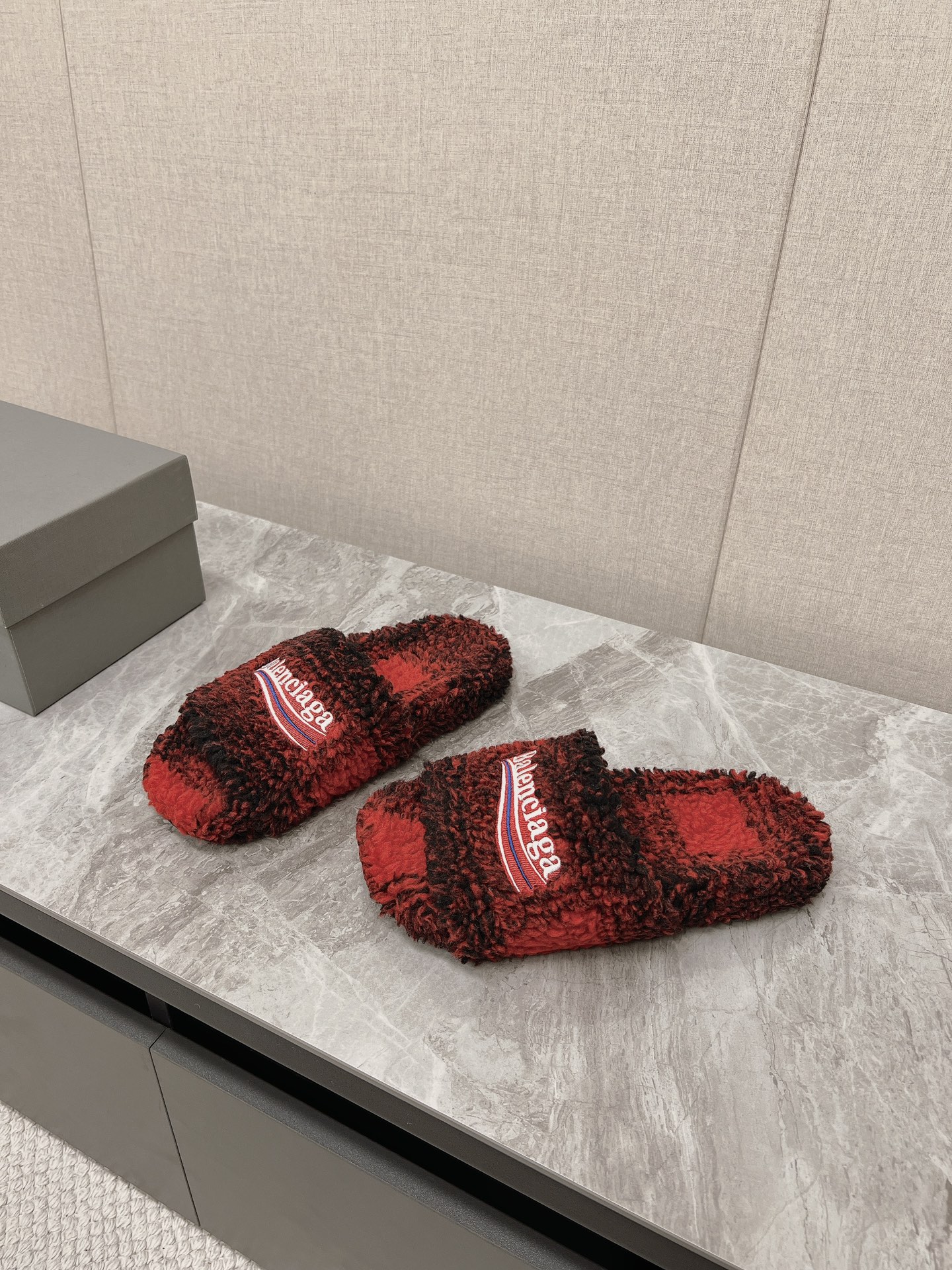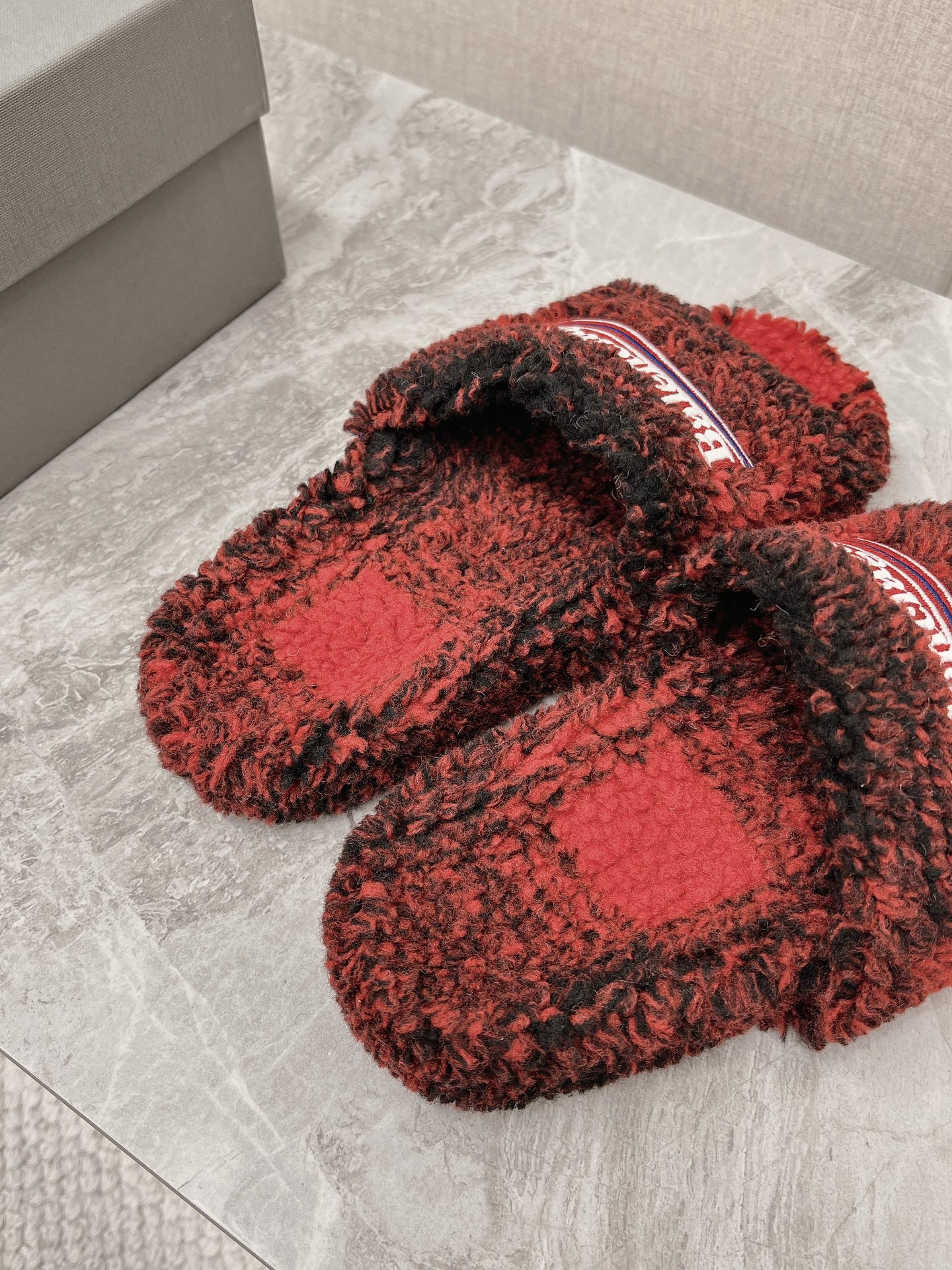 Balenciaga Political Campaign Logo Round Toe Red Black Plaid Faux Fur Slippers
