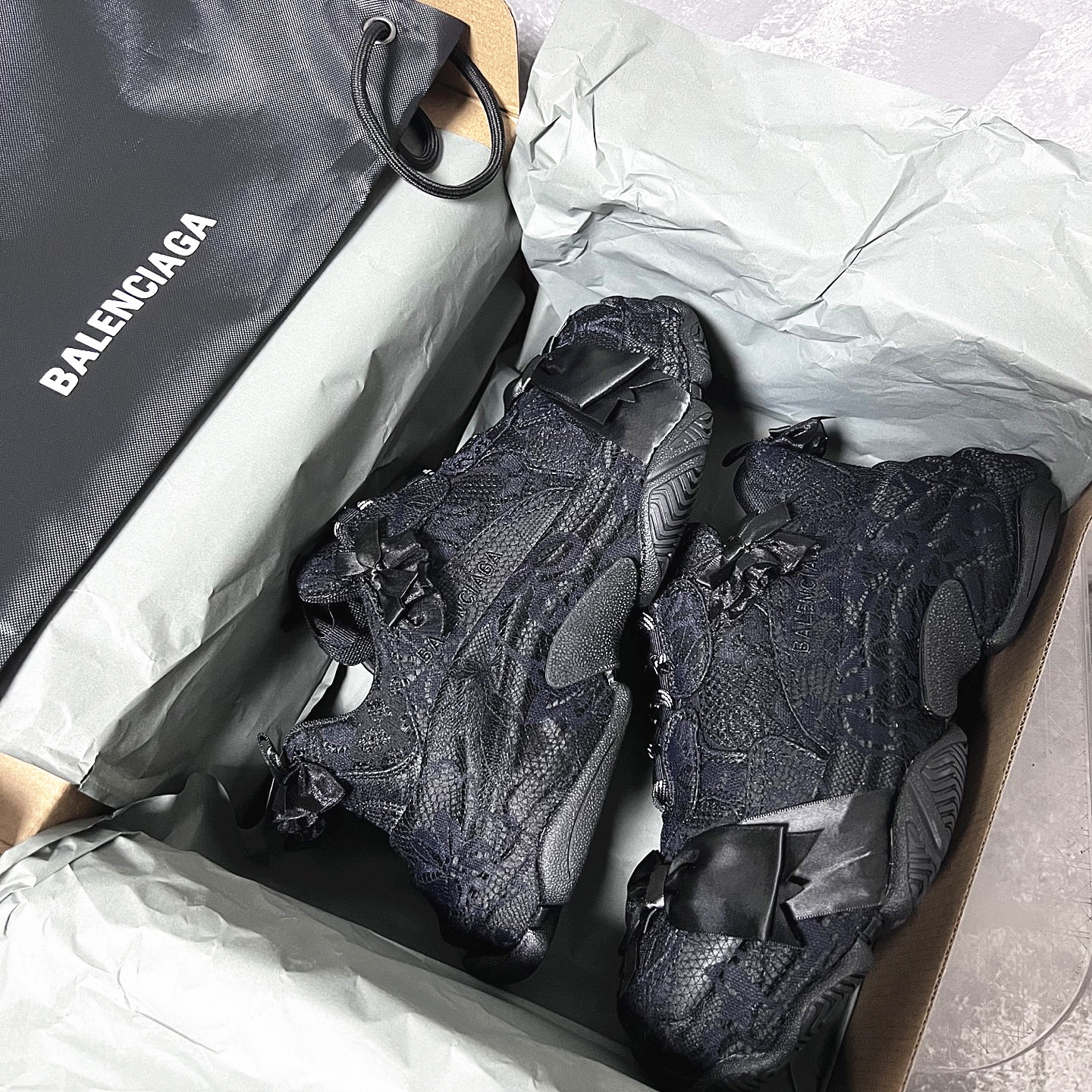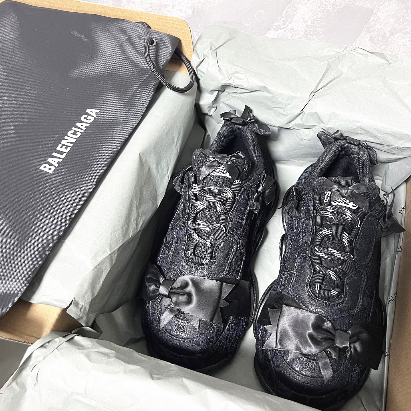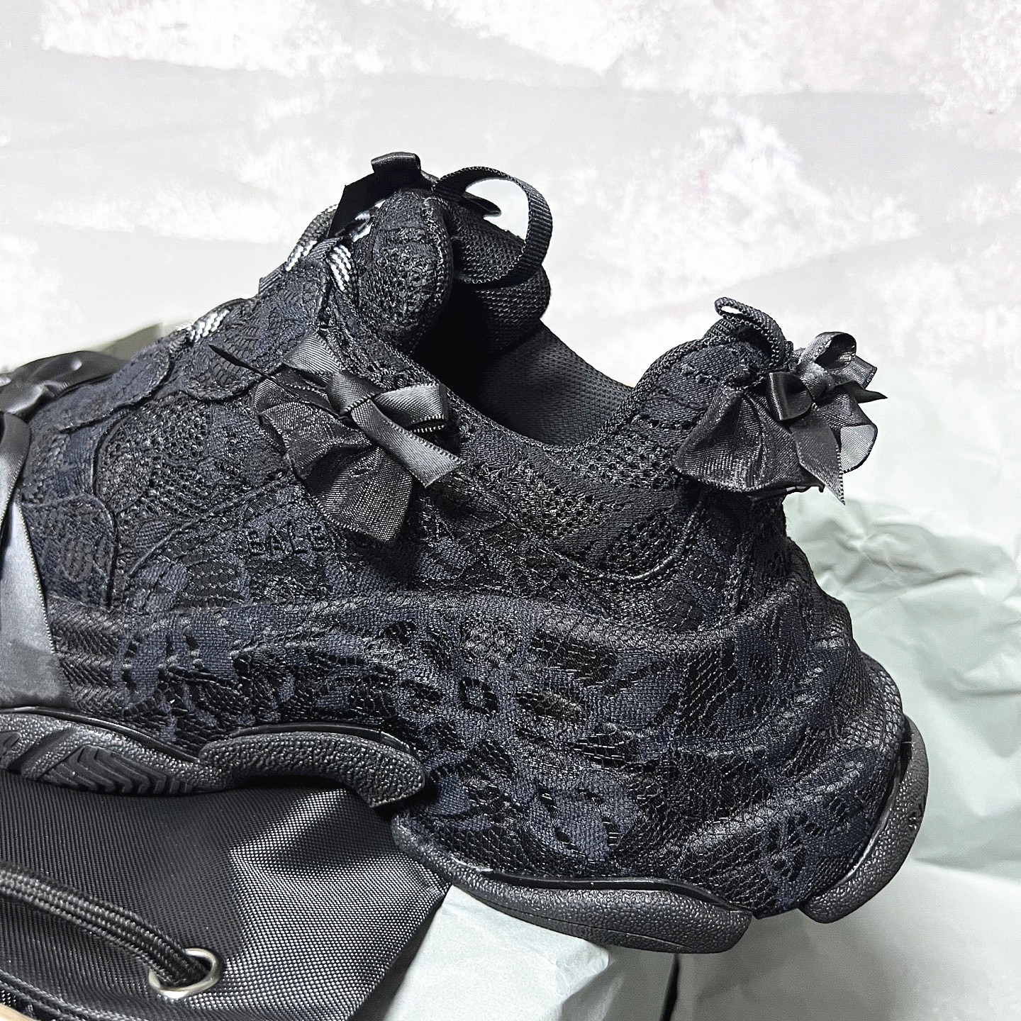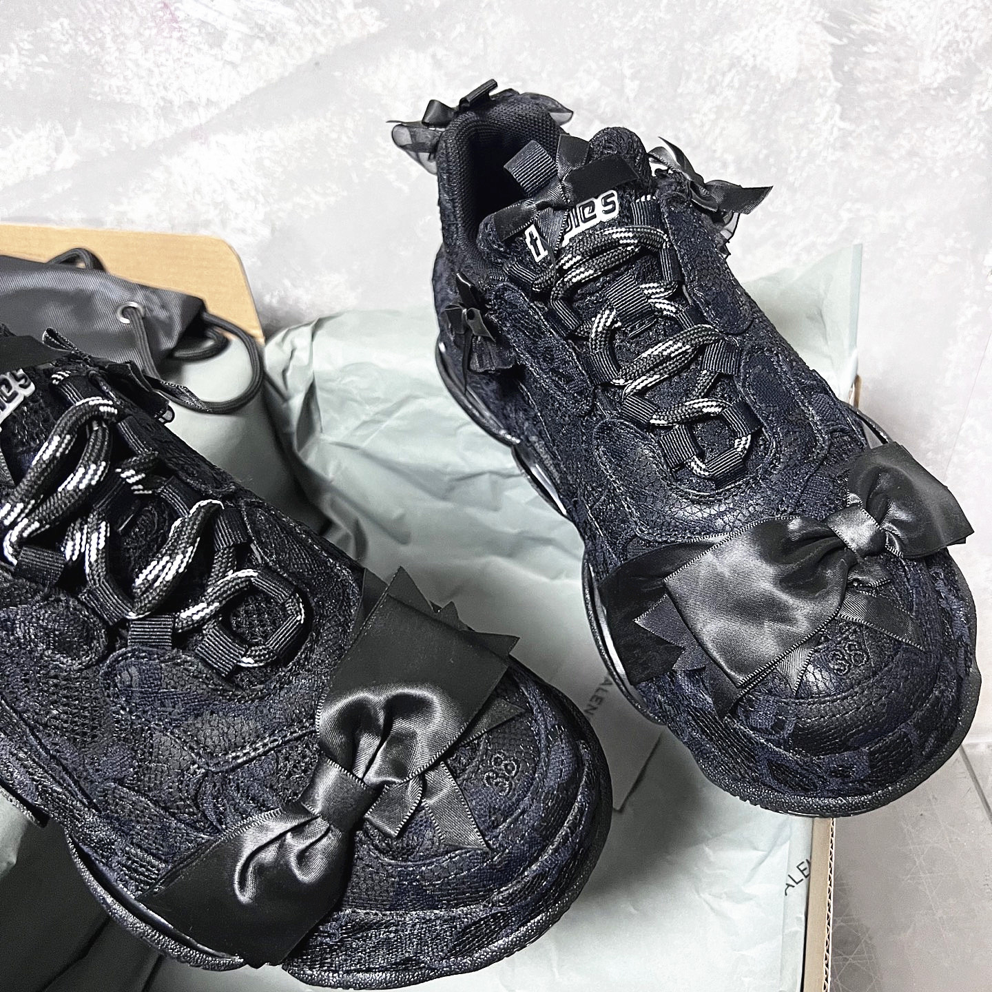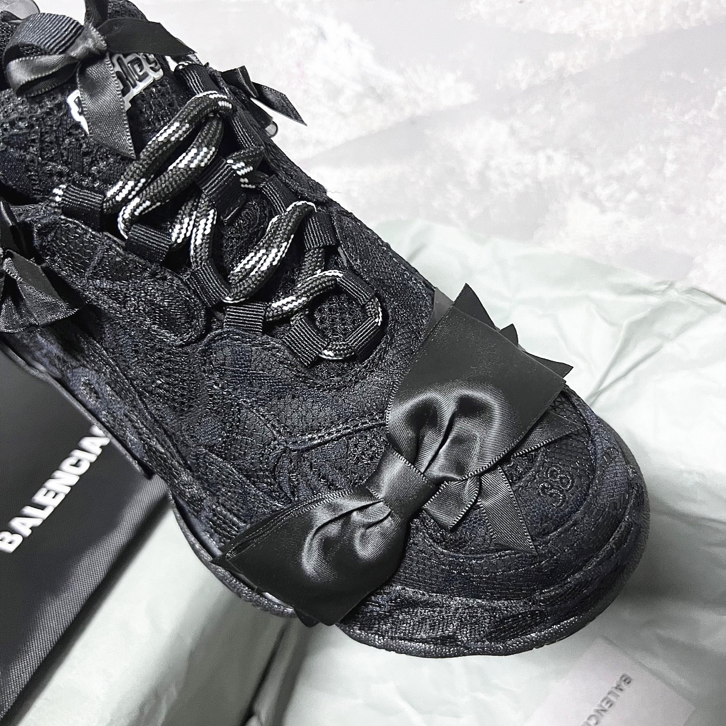 Balenciaga Triple S Black Lace Mesh Fabric Ribbon Satin Bow Lace Up Chunky Sneakers