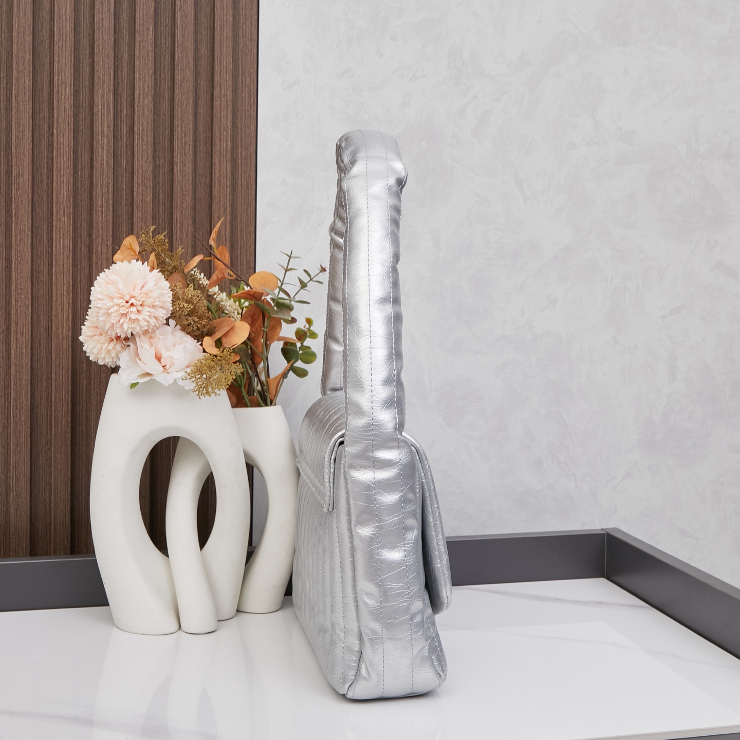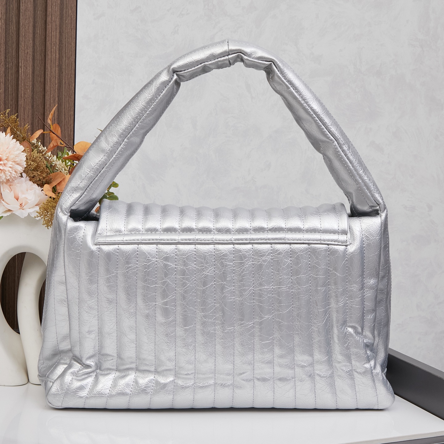 Balenciaga Monaco Silver Padded Slouchy Quilted Leather BB Logo Puffy Handle Shoulder Tote Bags