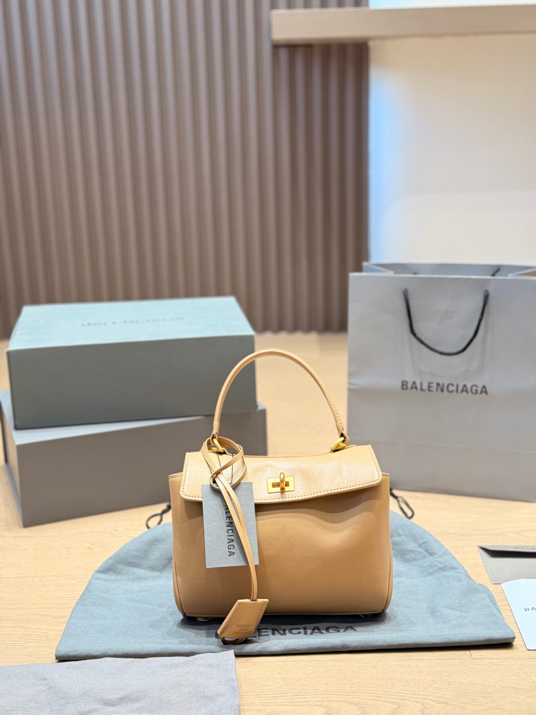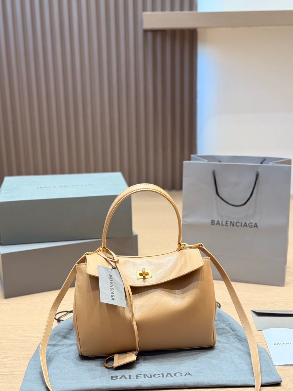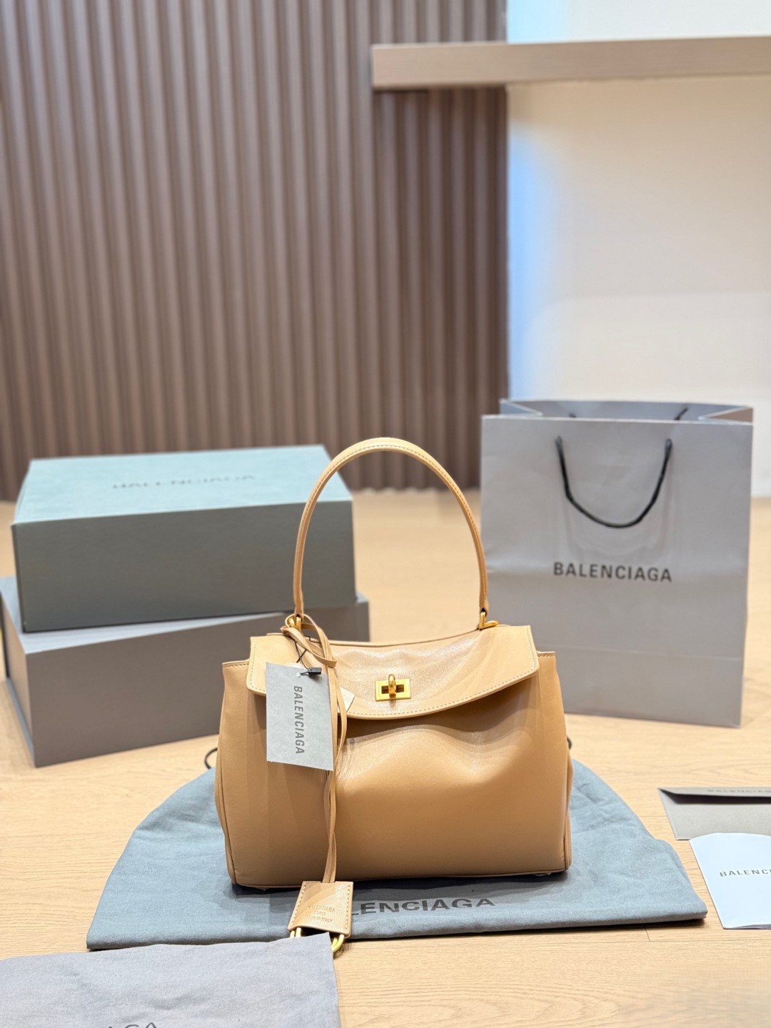 Balenciaga Rodeo Beige Khaki Slouchy Kelly Smooth Leather Turn Lock Tote Top Handle Bags