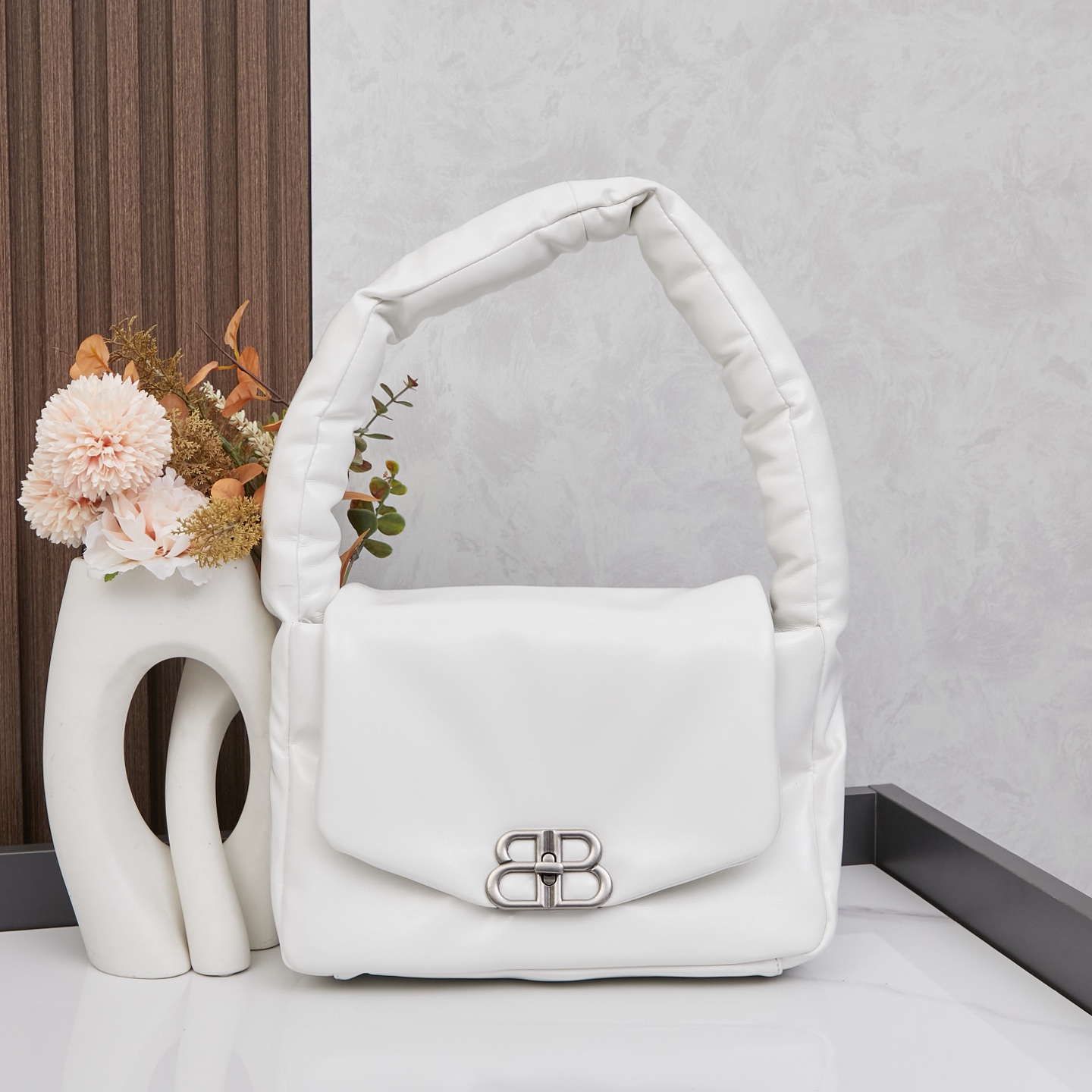 Balenciaga Monaco White Padded Slouchy Leather BB Logo Puffy Handle Shoulder Tote Bags