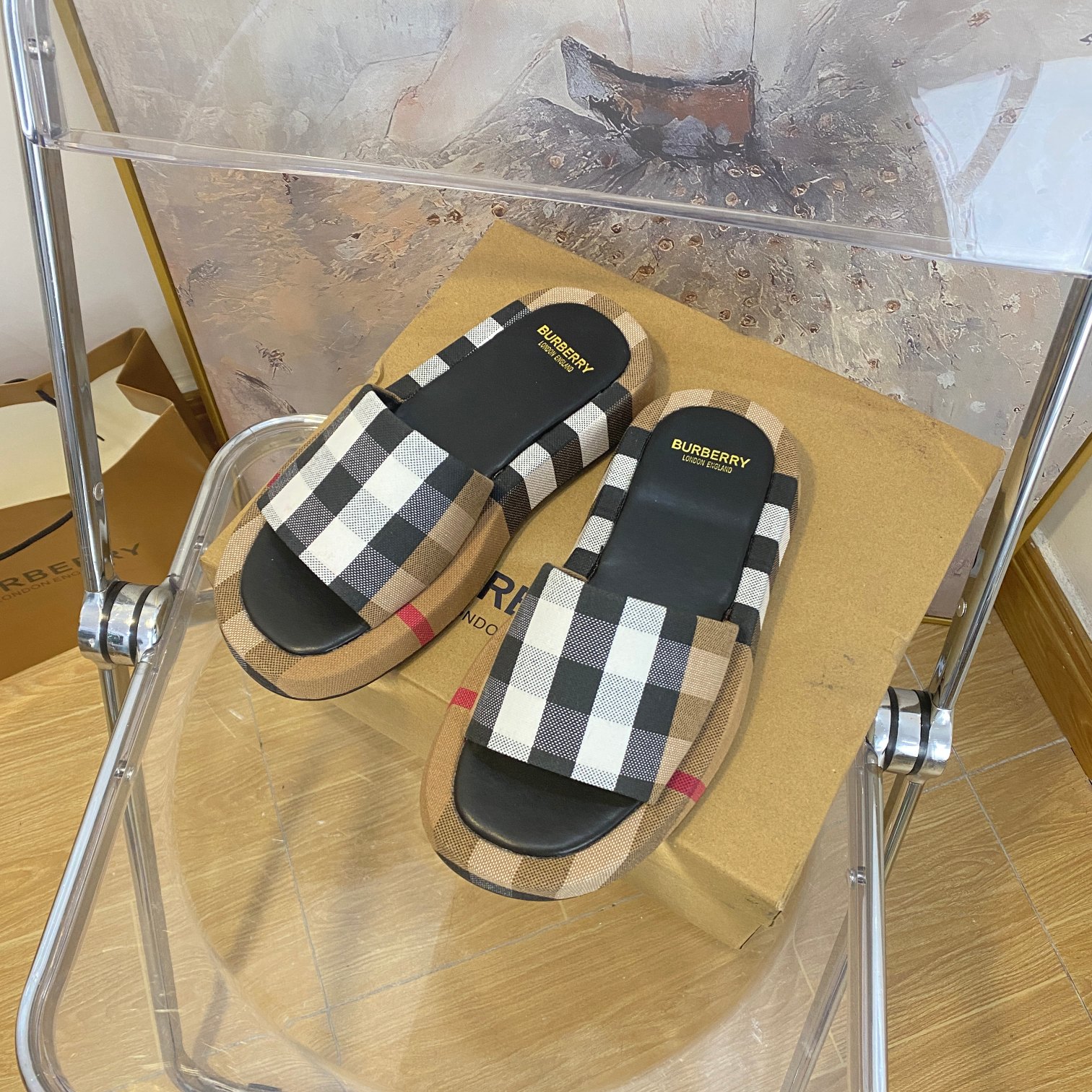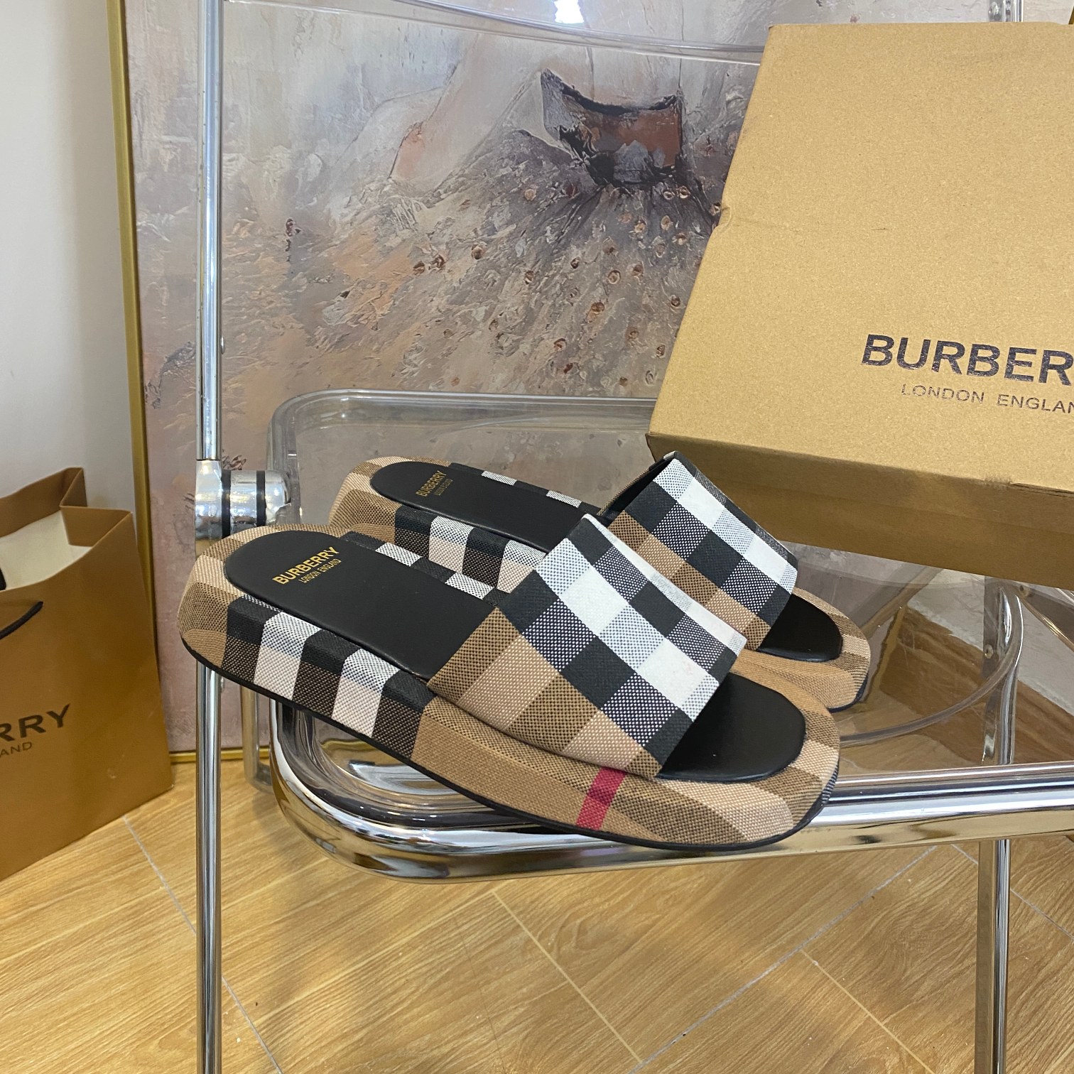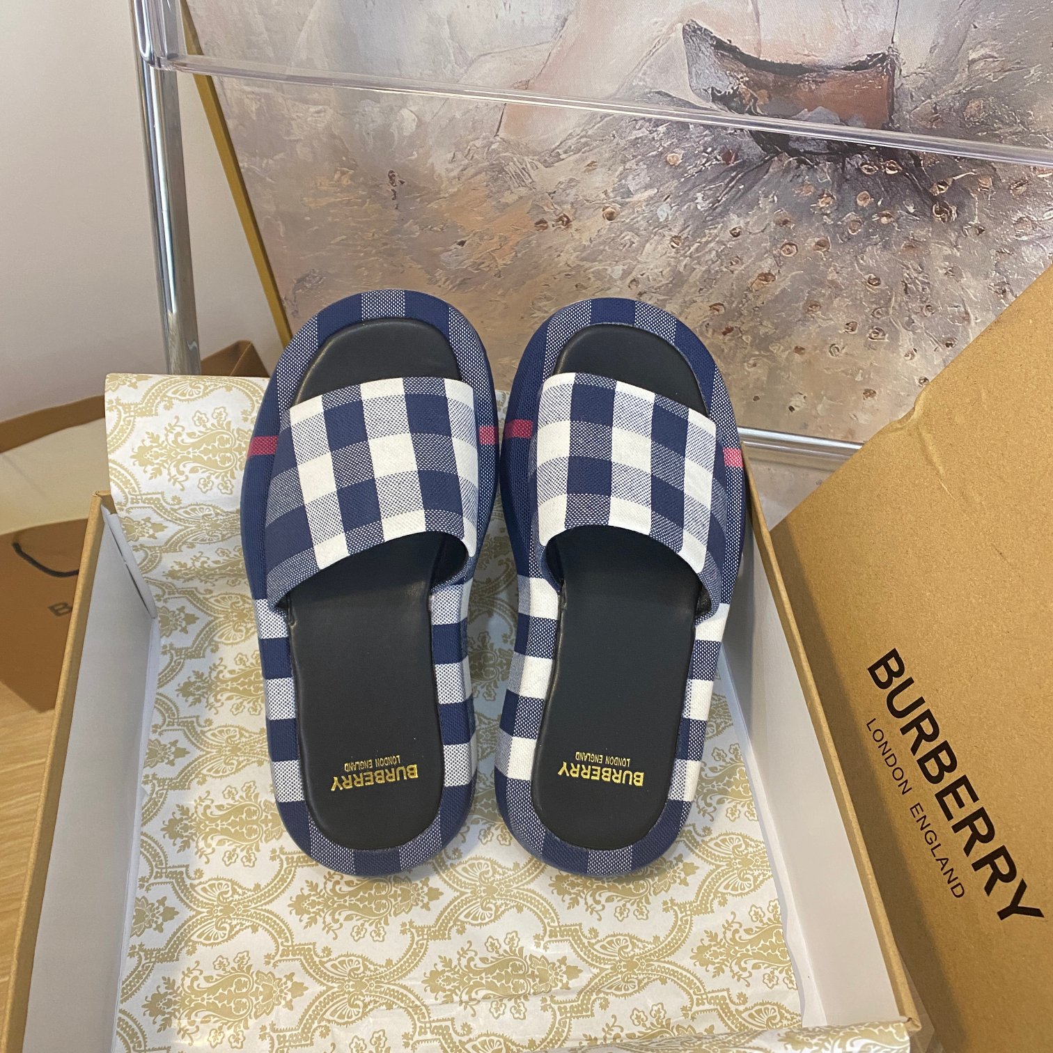 Burberry Plaid Check Cotton Canvas Wide Strap Leather Lining Platform Slippers