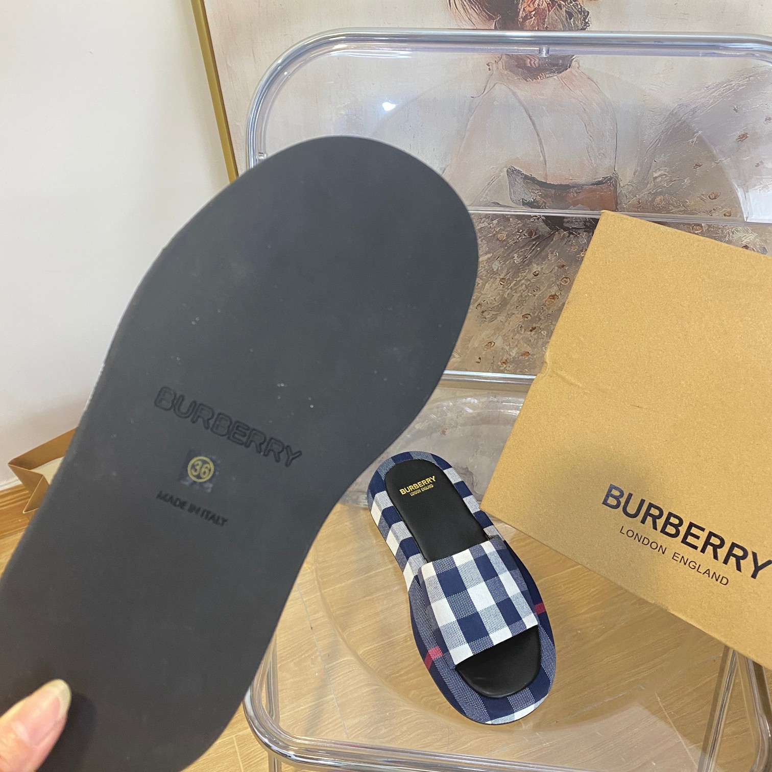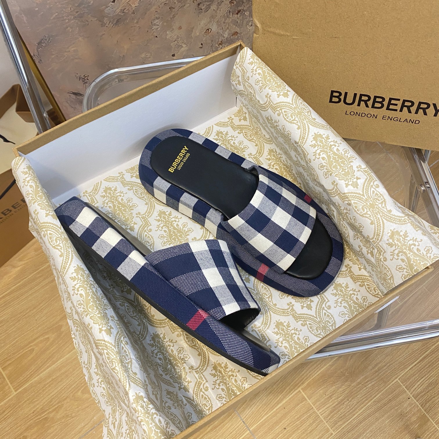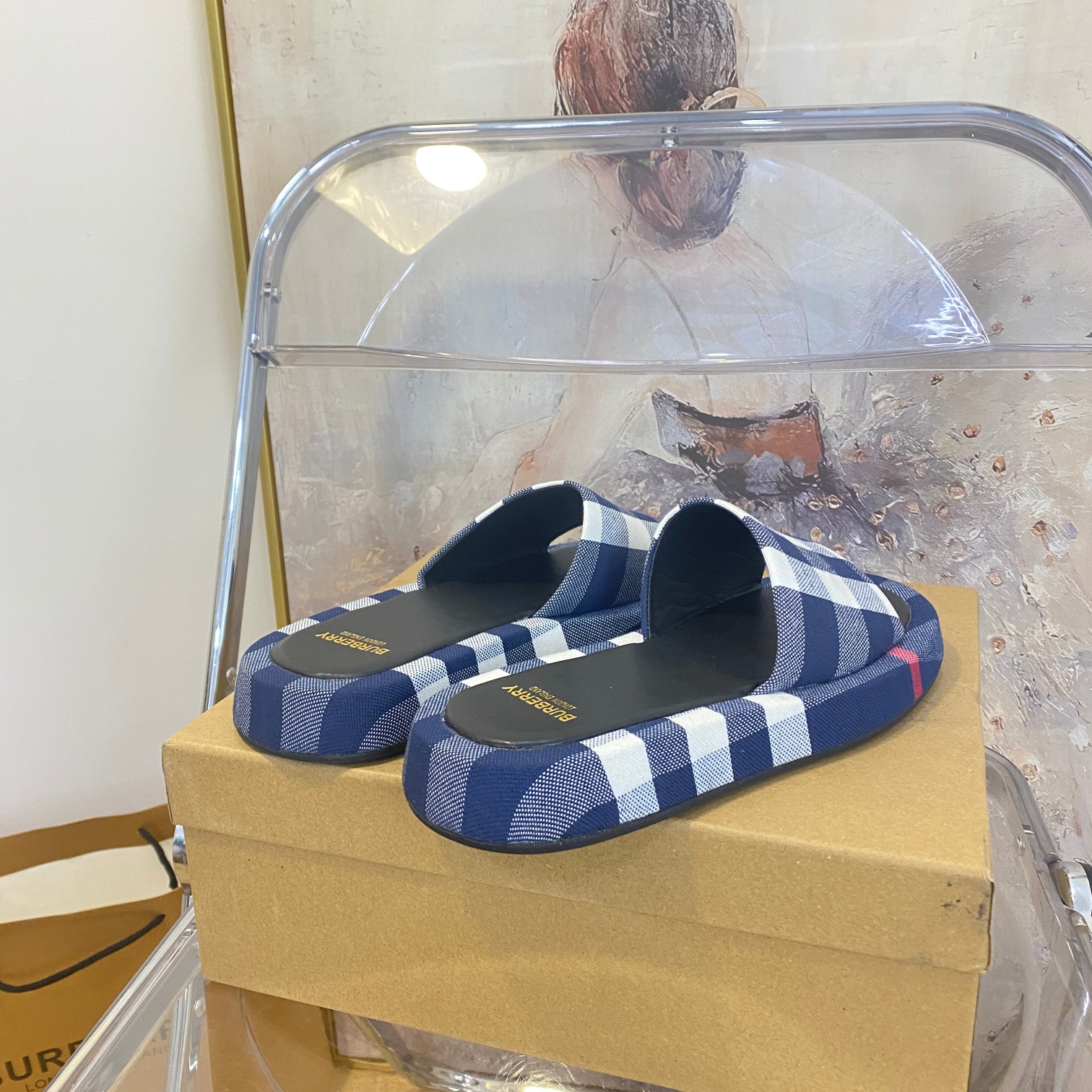 Burberry Plaid Check Cotton Canvas Wide Strap Leather Lining Platform Slippers
