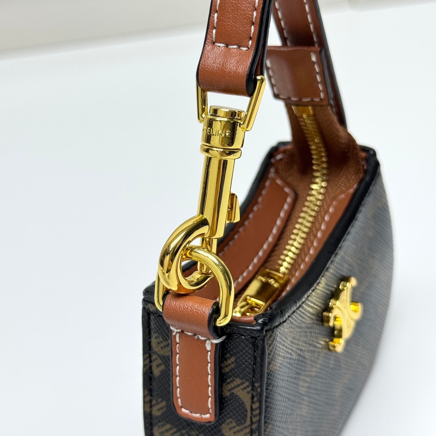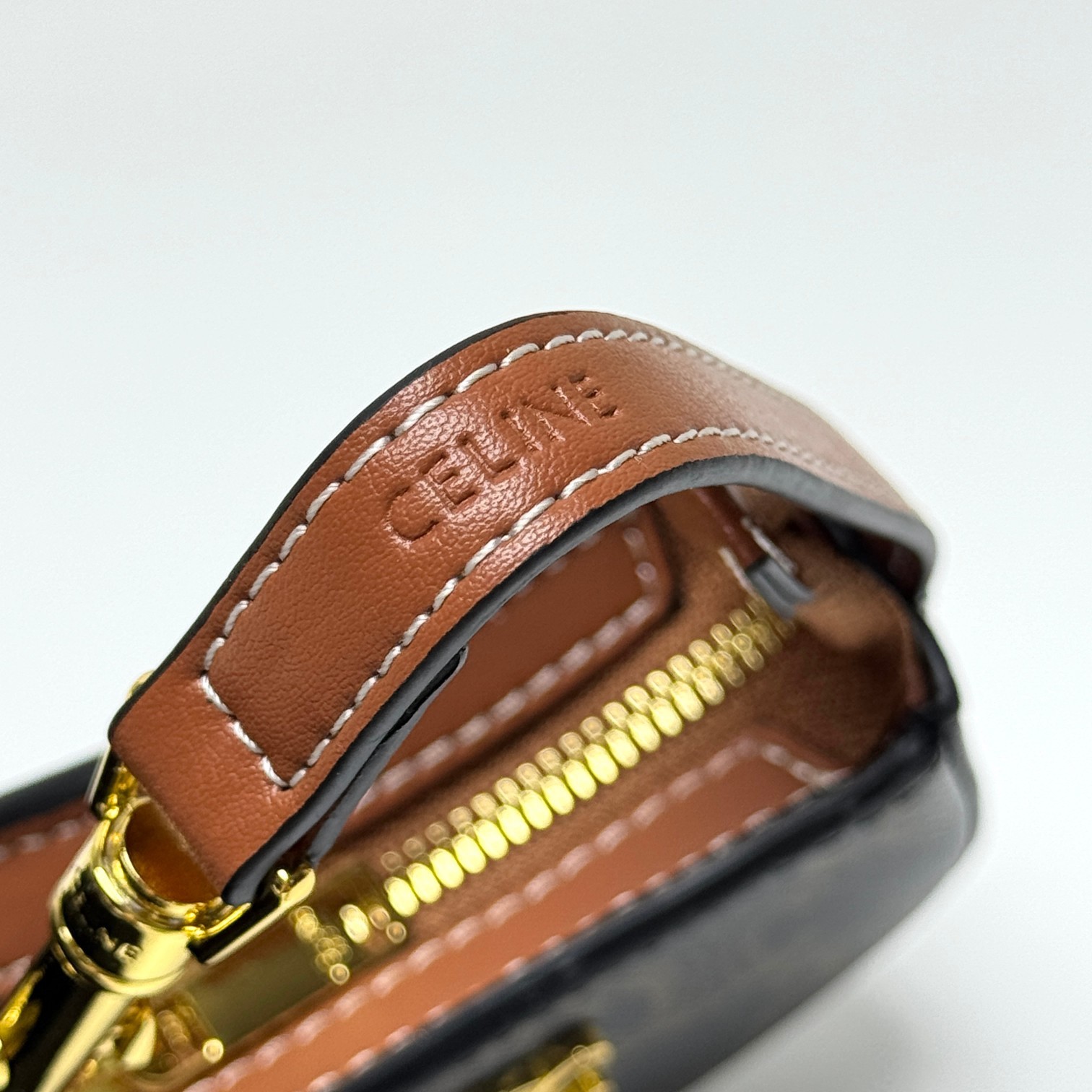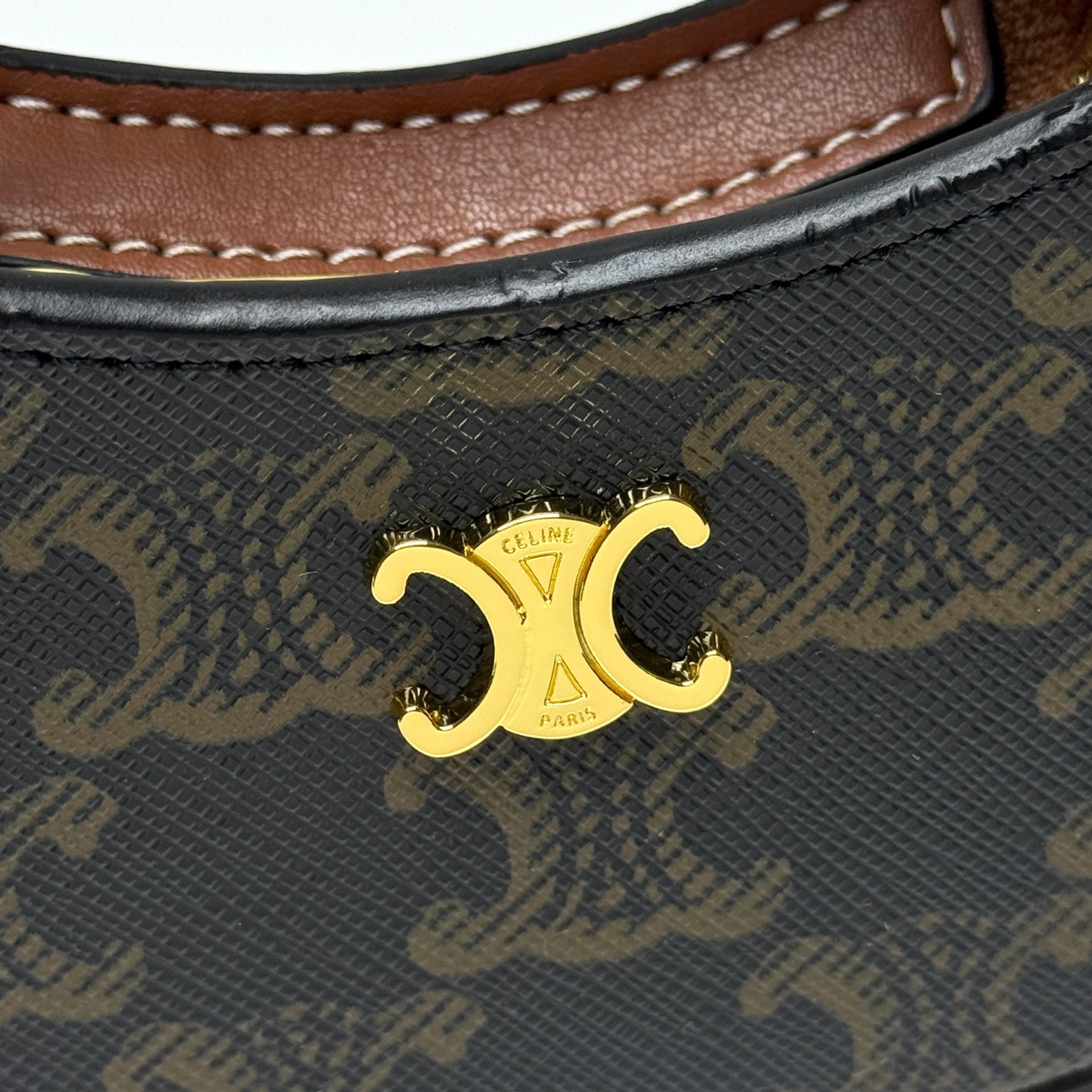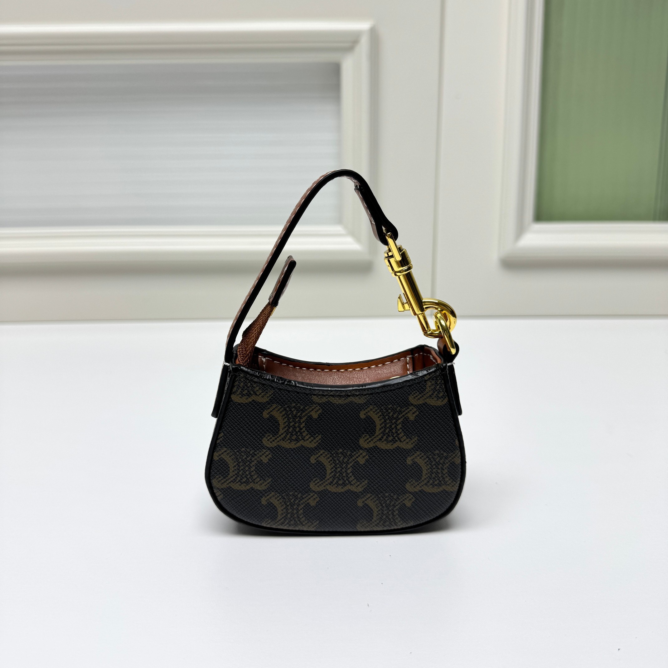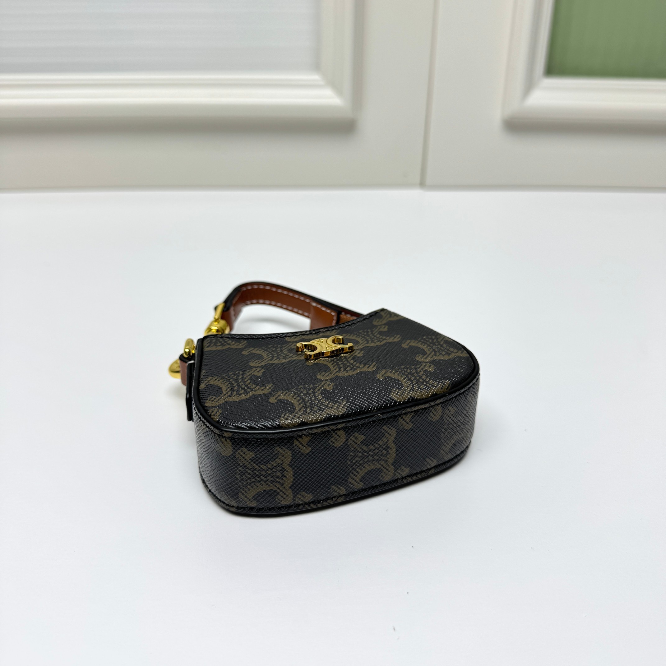 Celine Mini Tilly Tan Triomphe Monogram Coated Canvas Gold Hardware Charm Wrist Bag