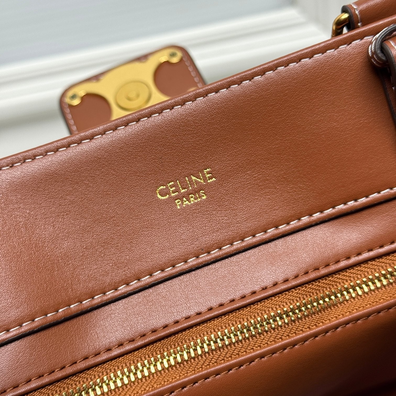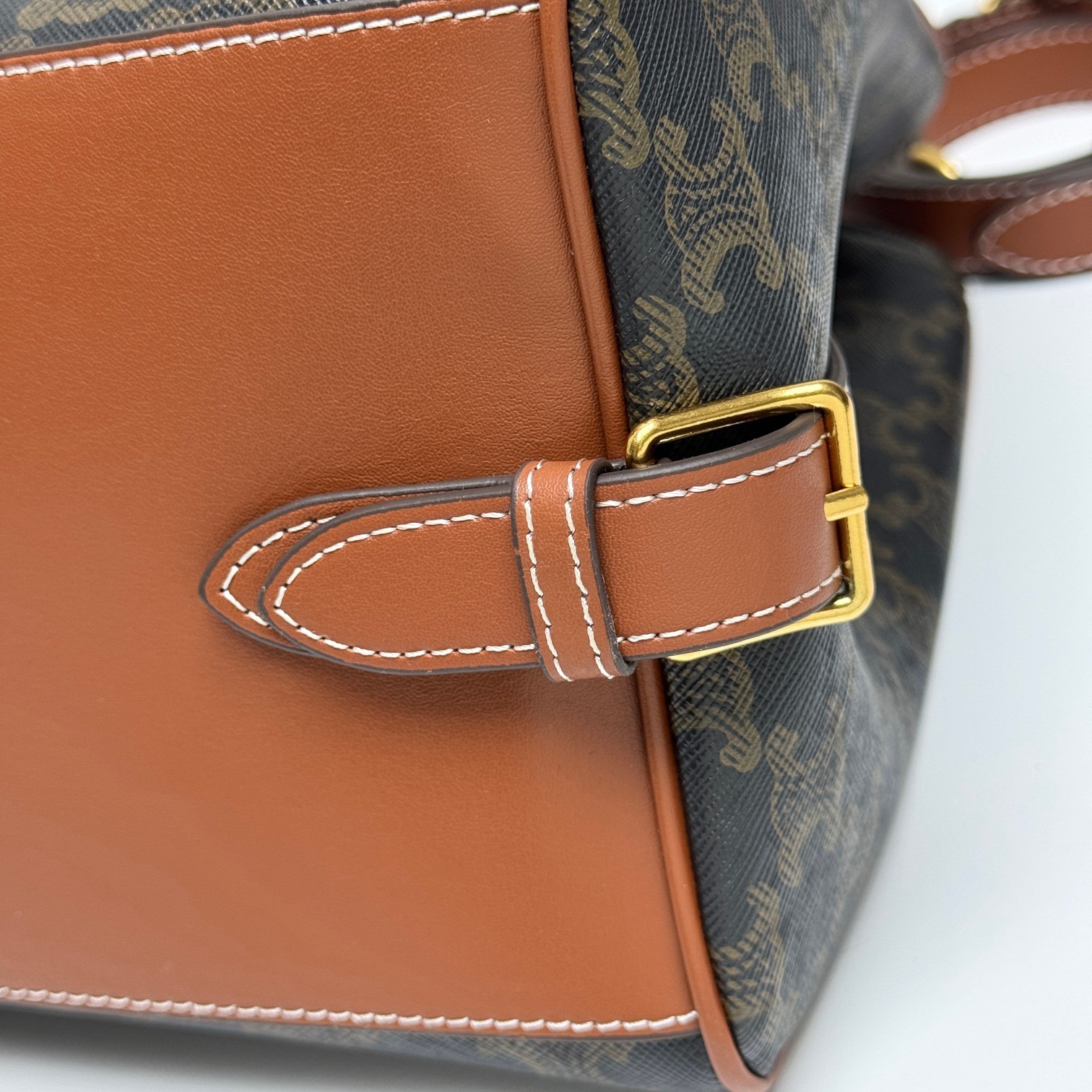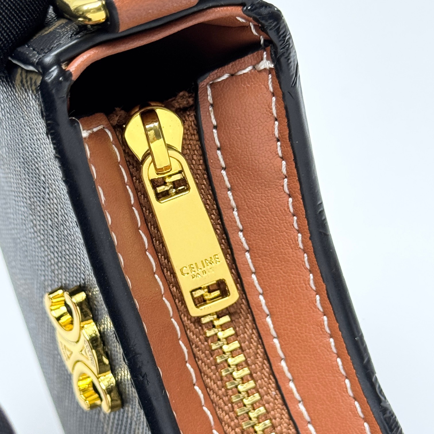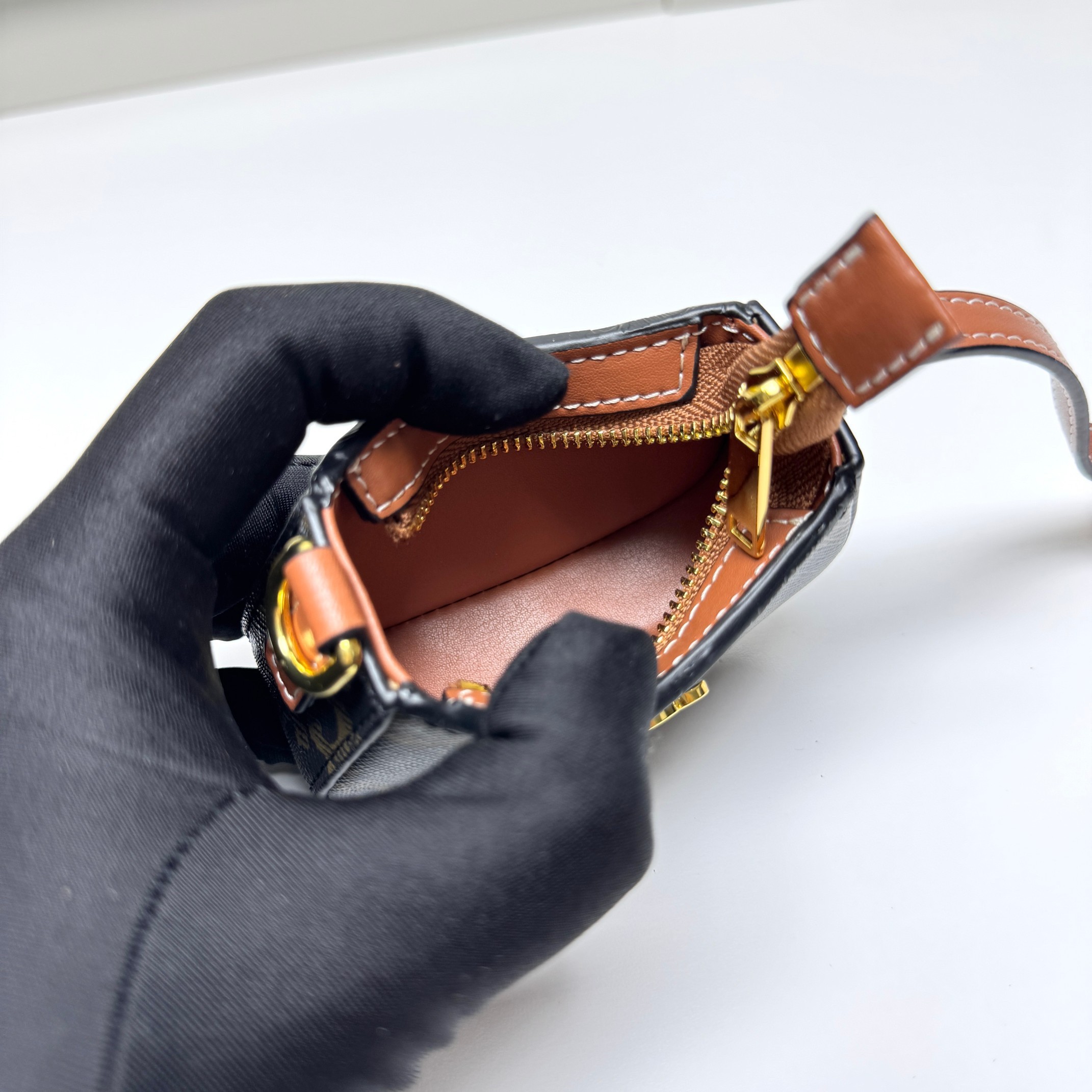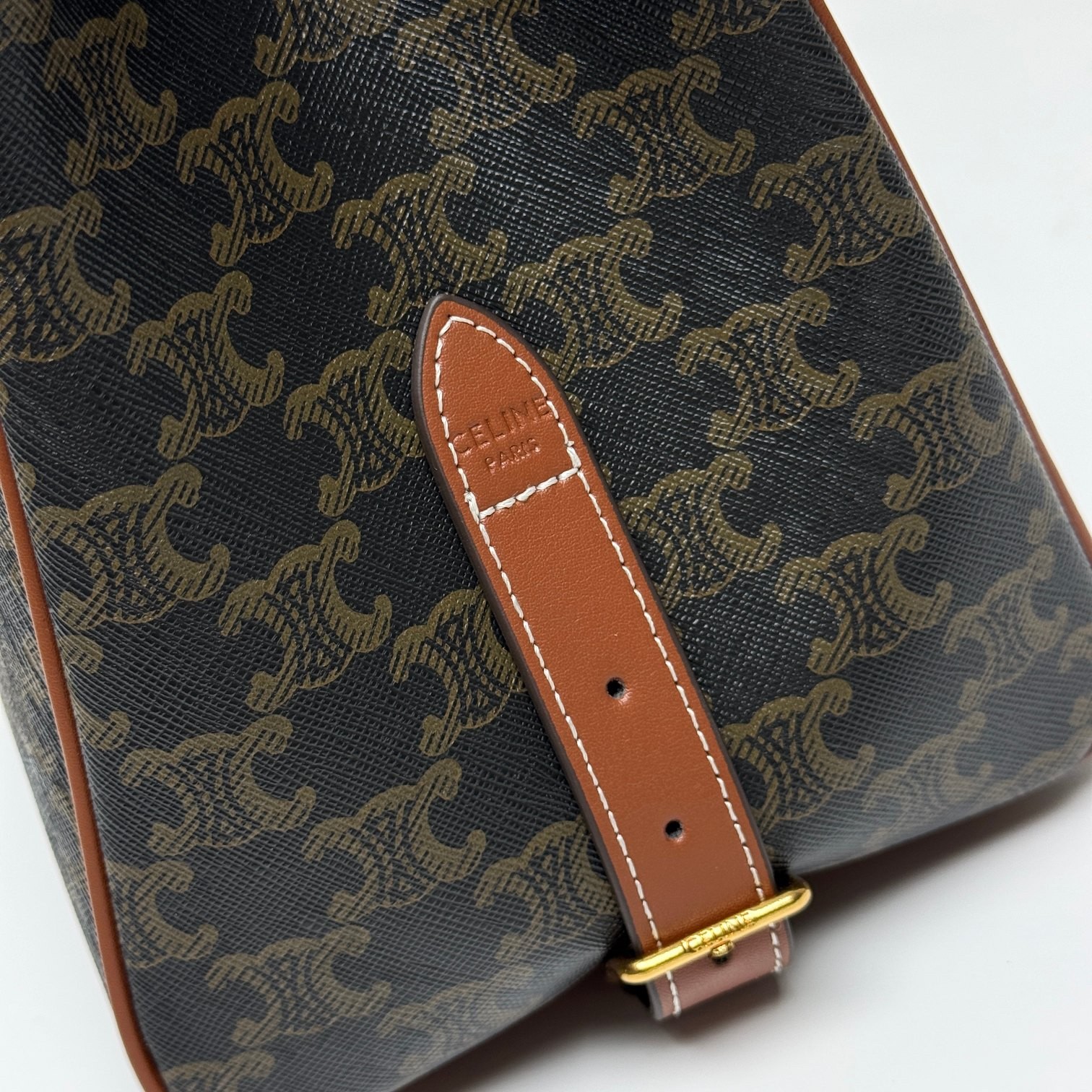 Celine Mini Tilly Tan Triomphe Monogram Coated Canvas Gold Hardware Charm Wrist Bag