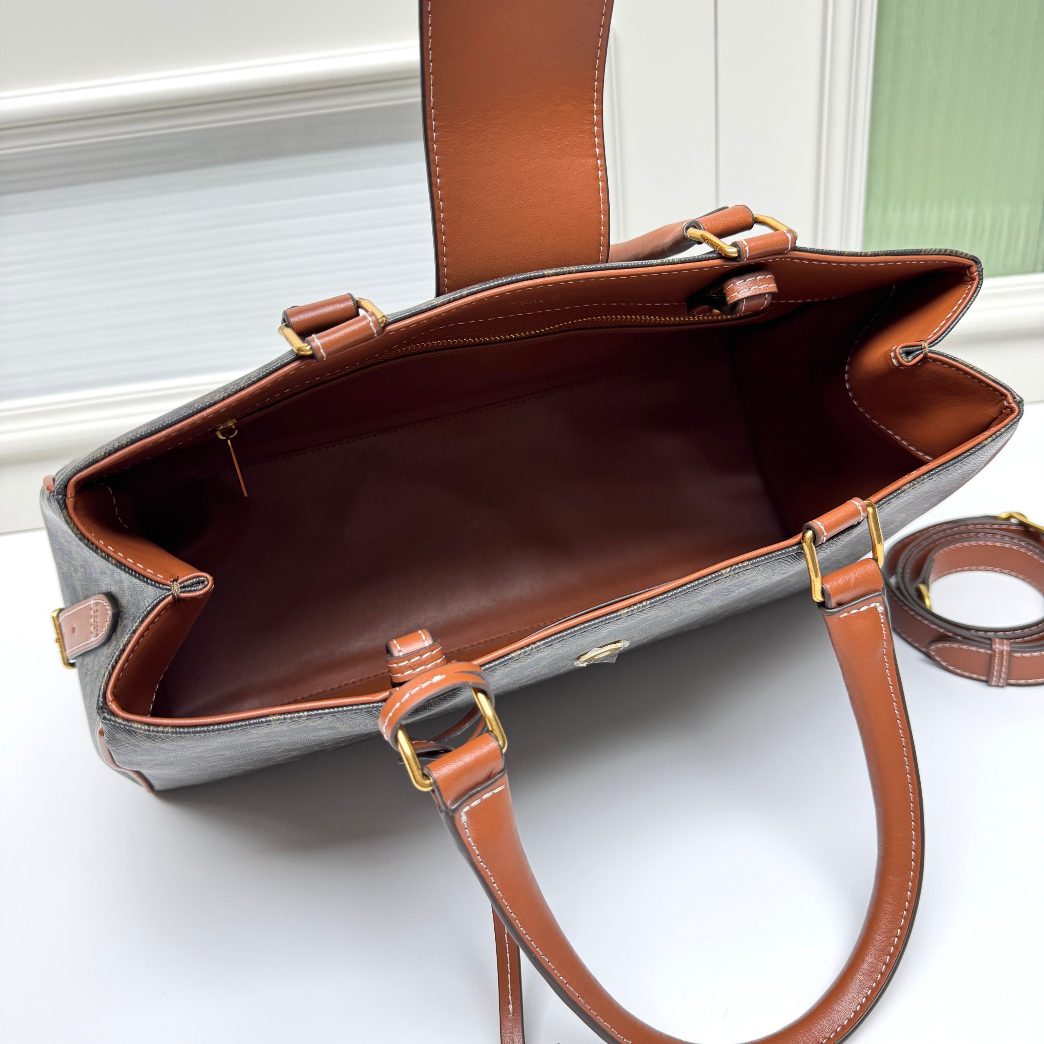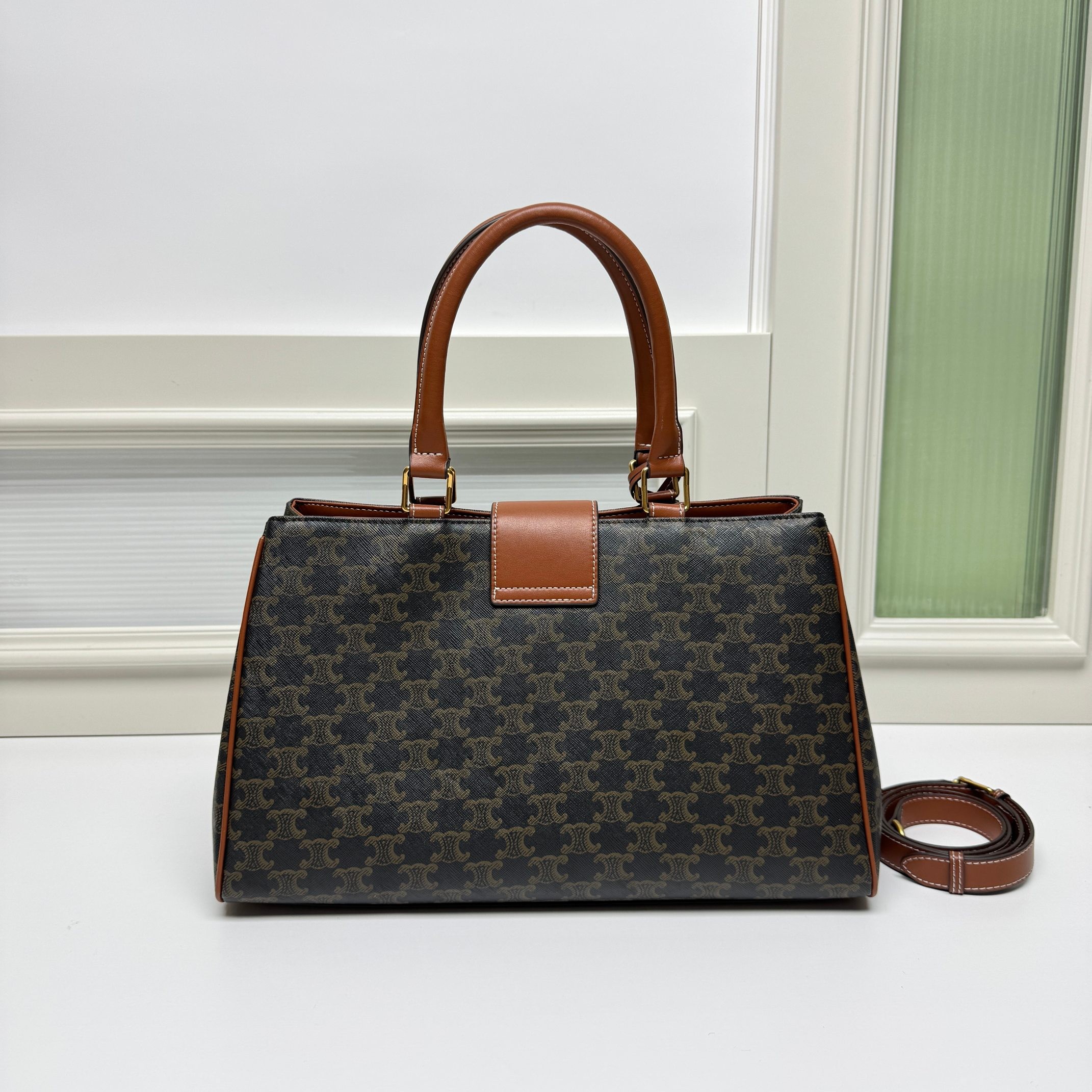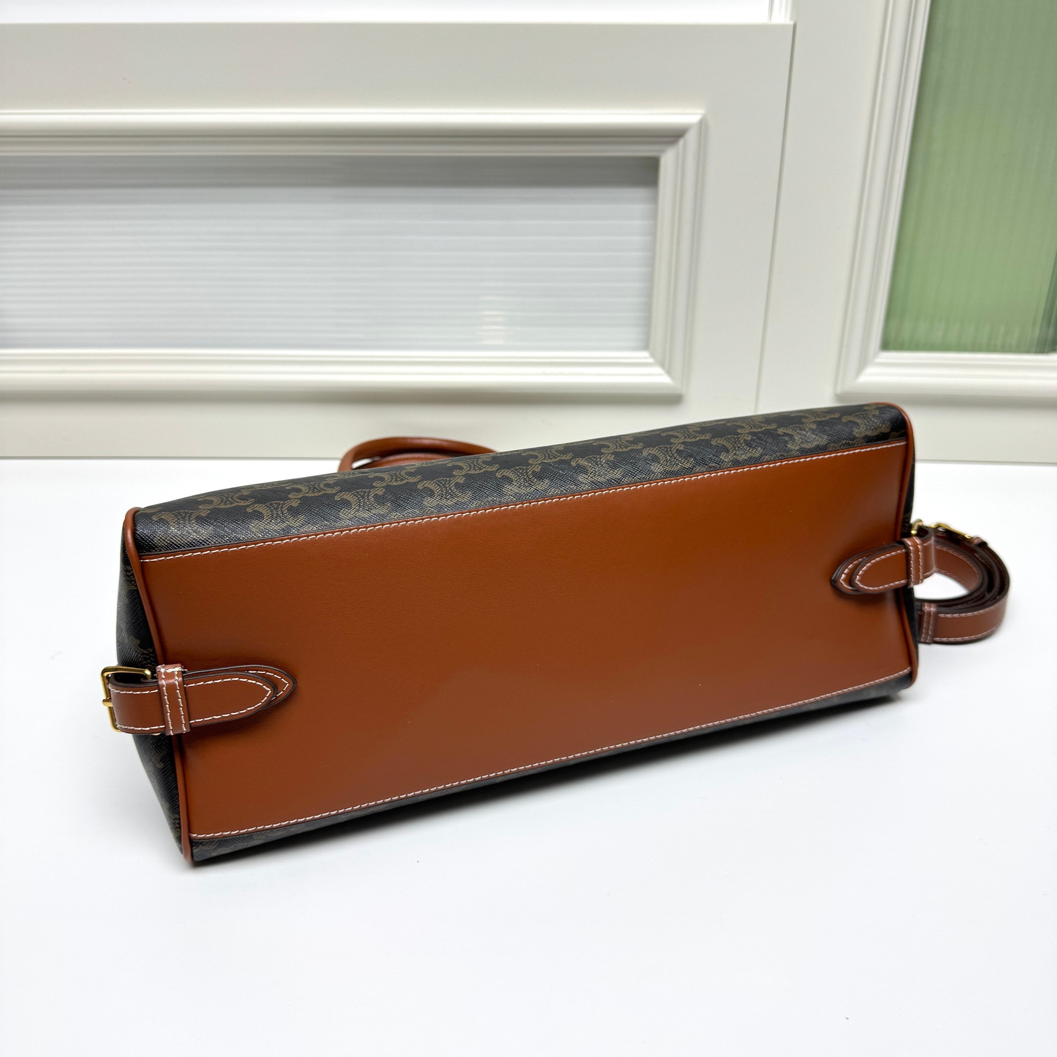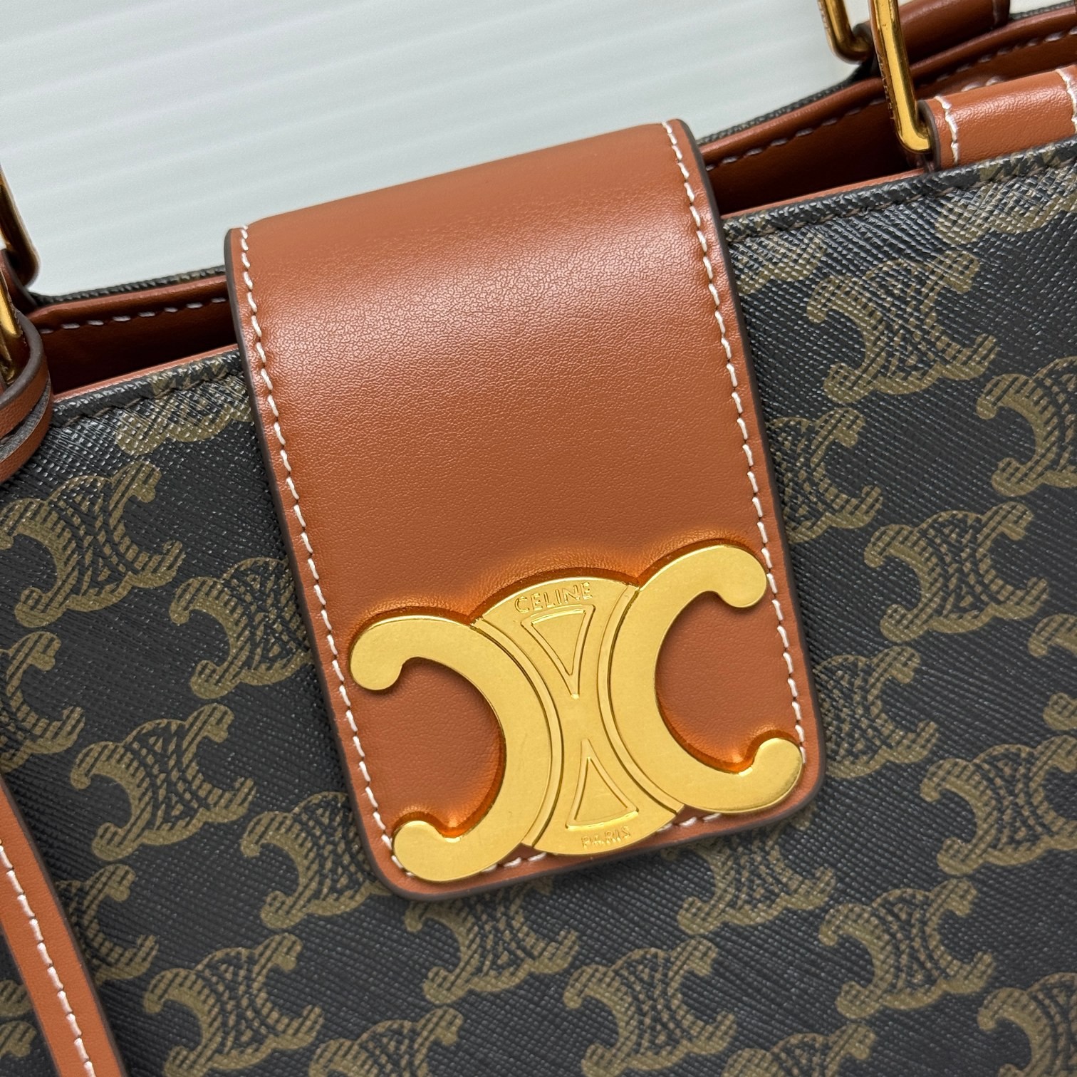 Celine Large Tan Triomphe Monogram Canvas Metallic Closure Briefcase Doctors Bag