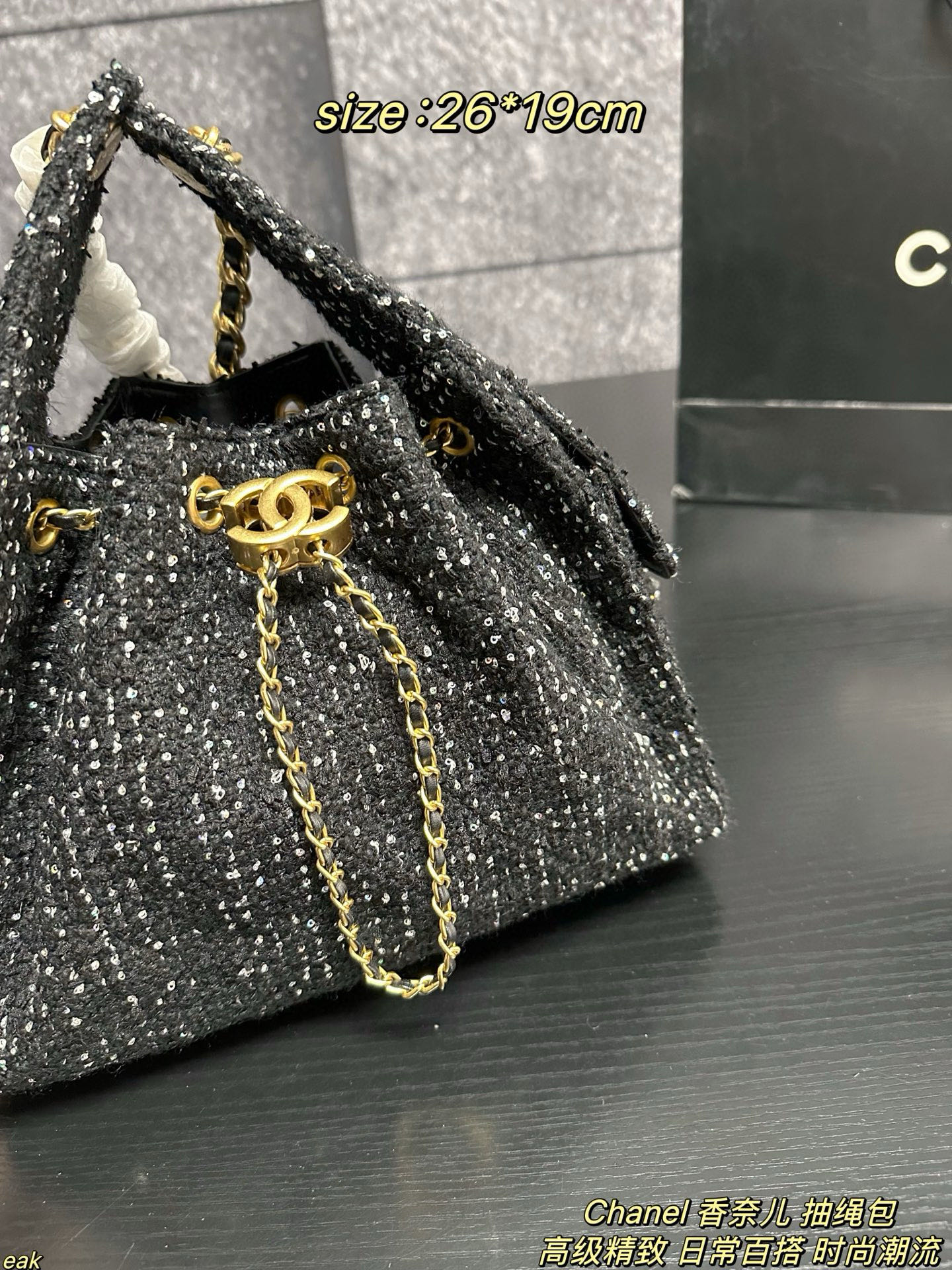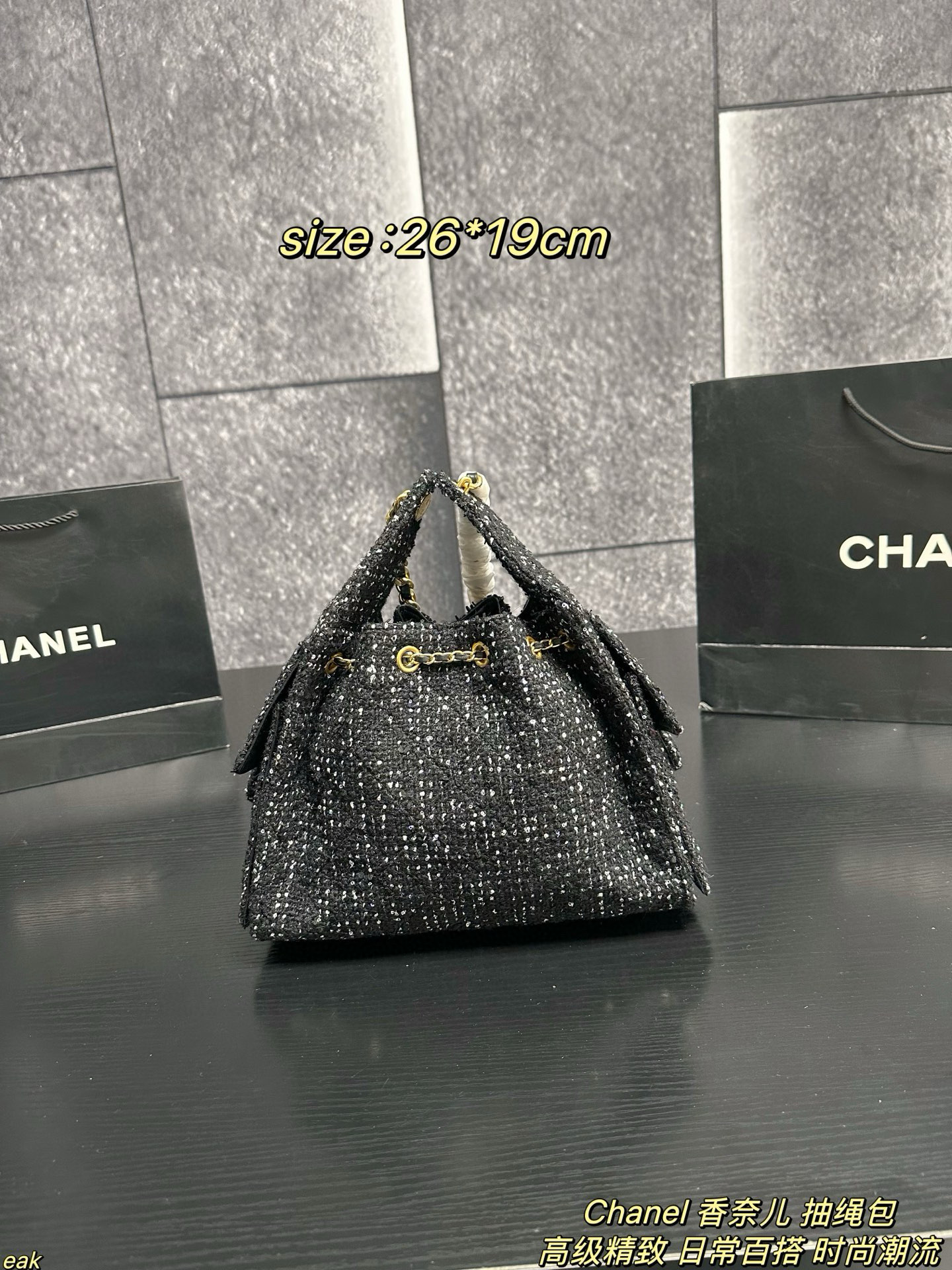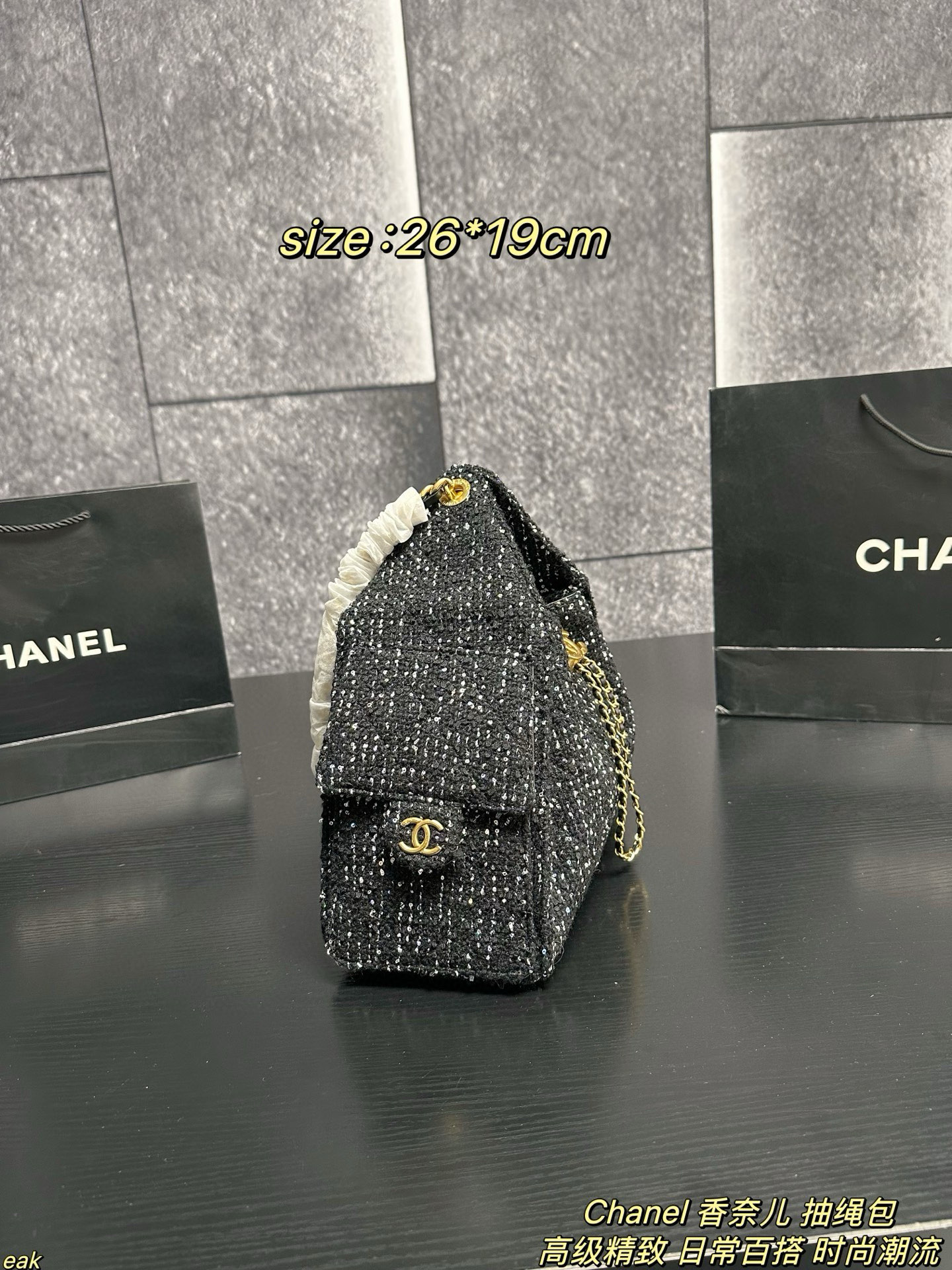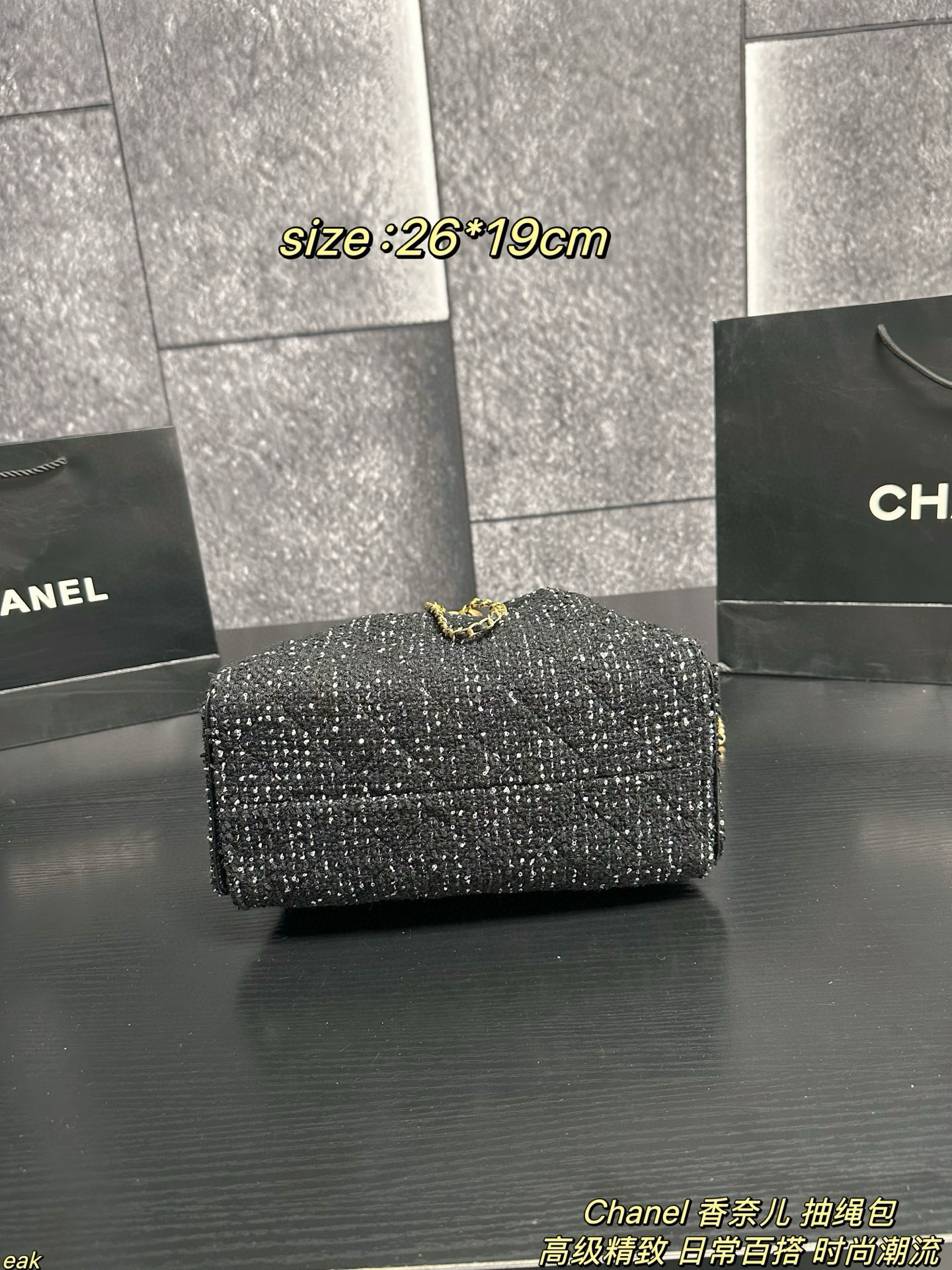 Chanel 25C Tweed Drawstring Diamond Quilted Multi-Pocket Top Handle Bucket Bag