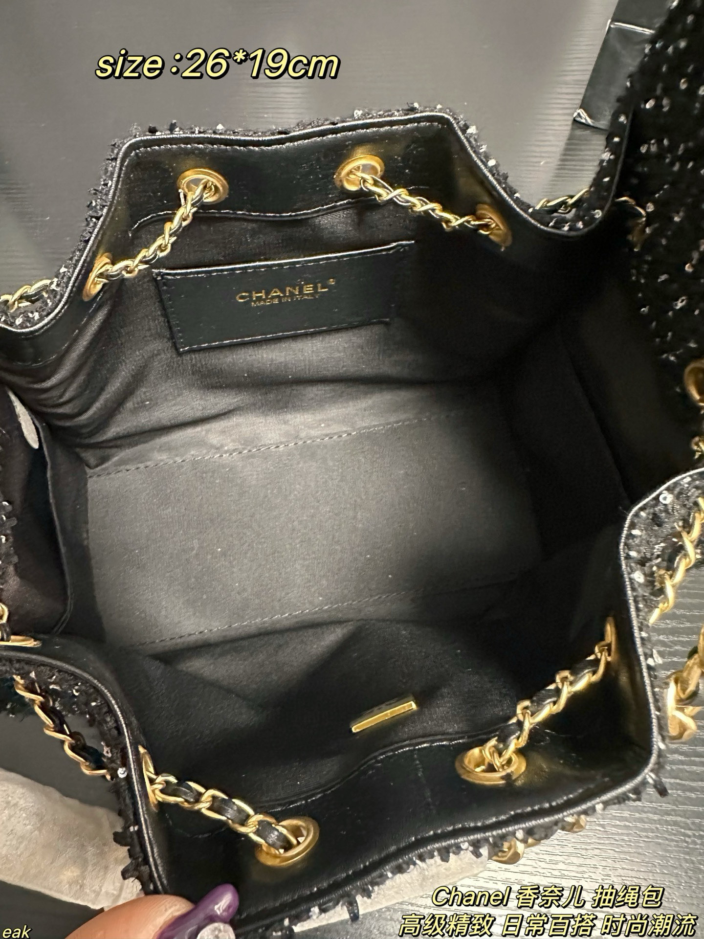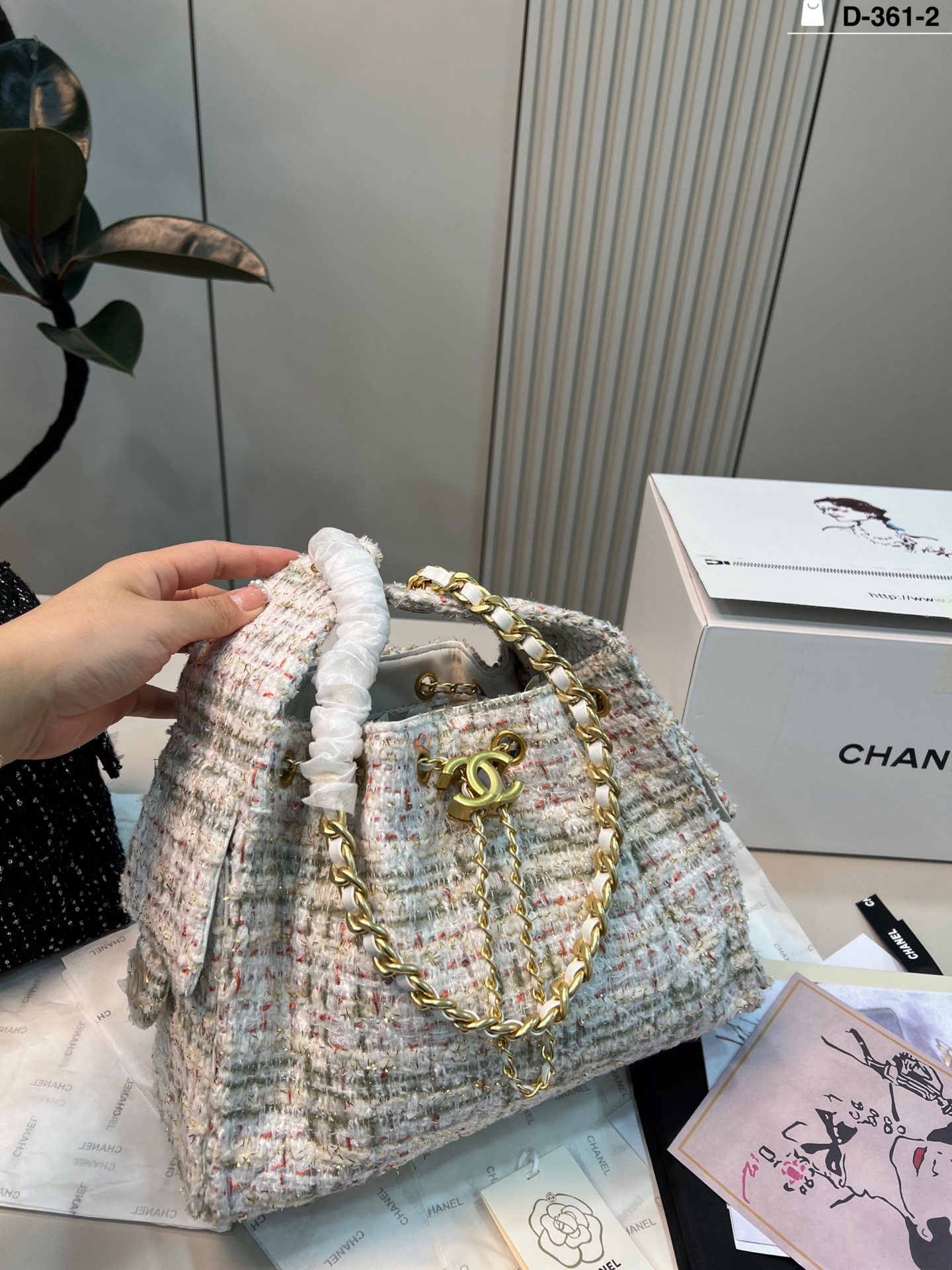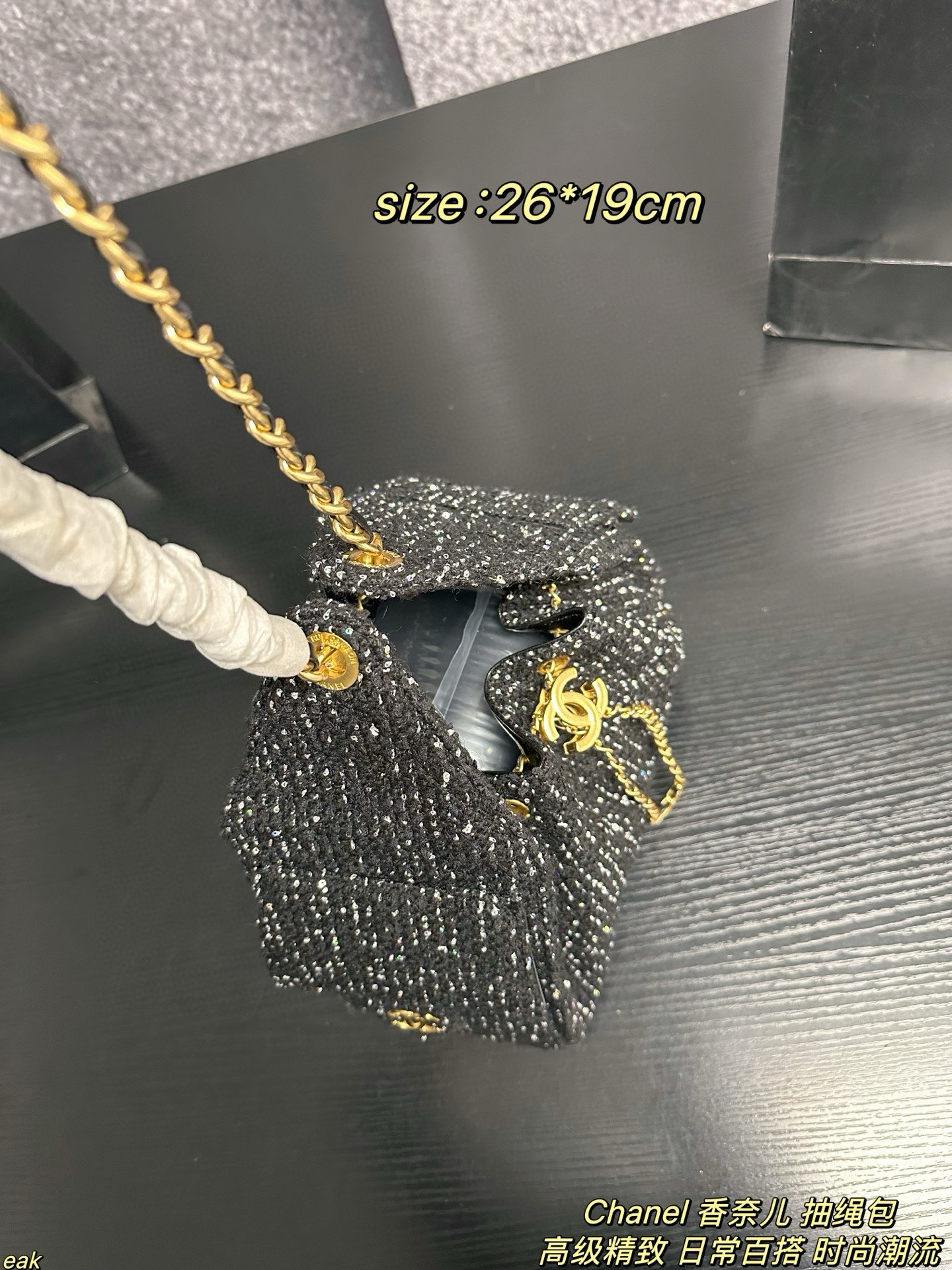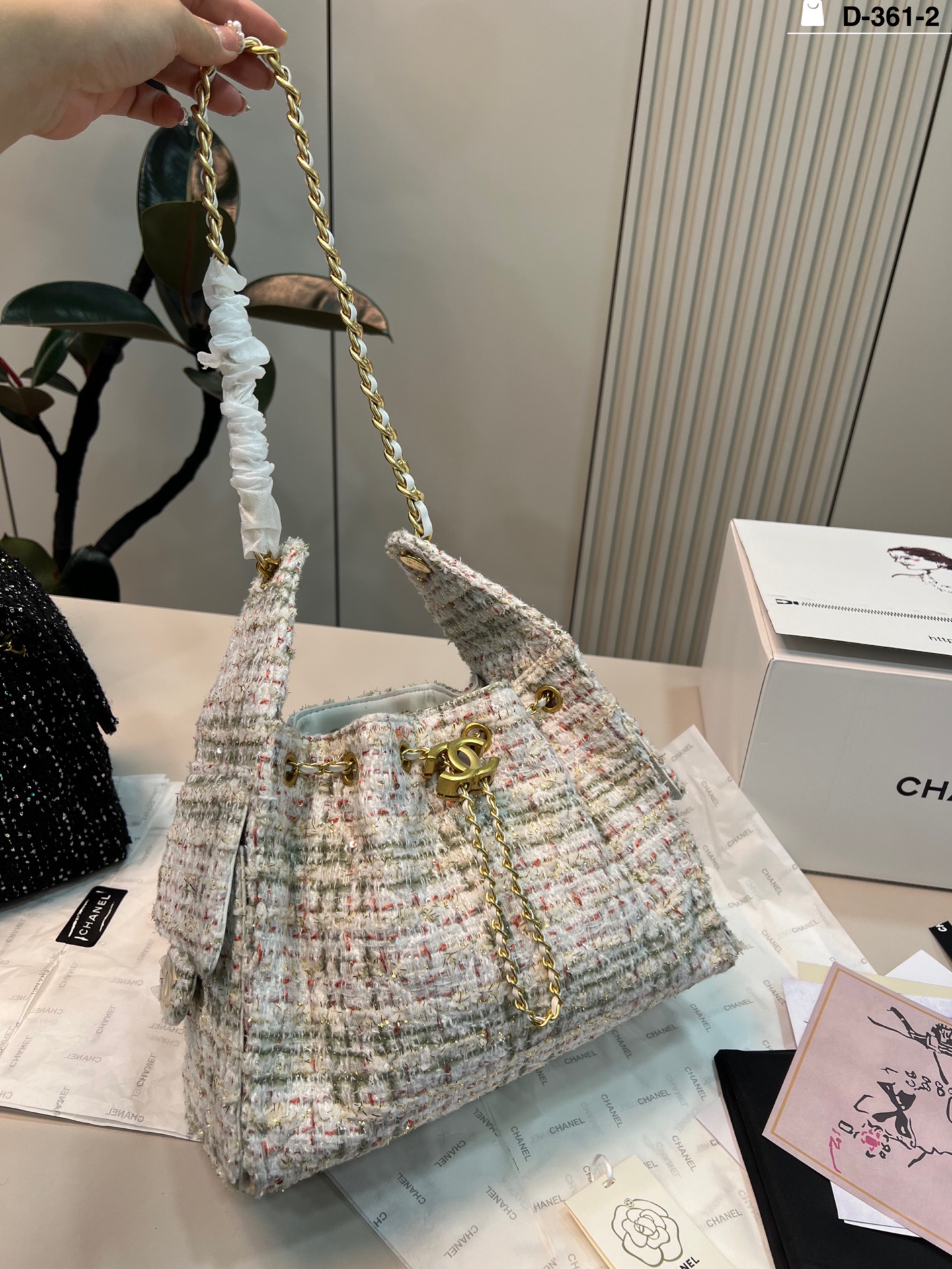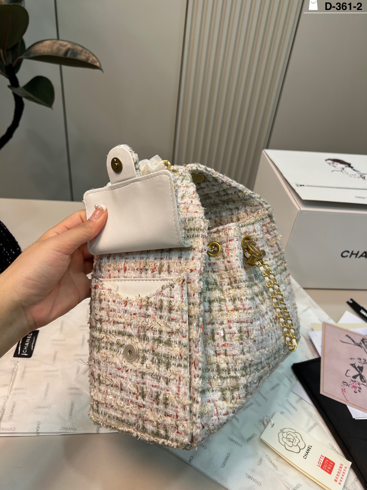 Chanel 25C Tweed Drawstring Diamond Quilted Multi-Pocket Top Handle Bucket Bag