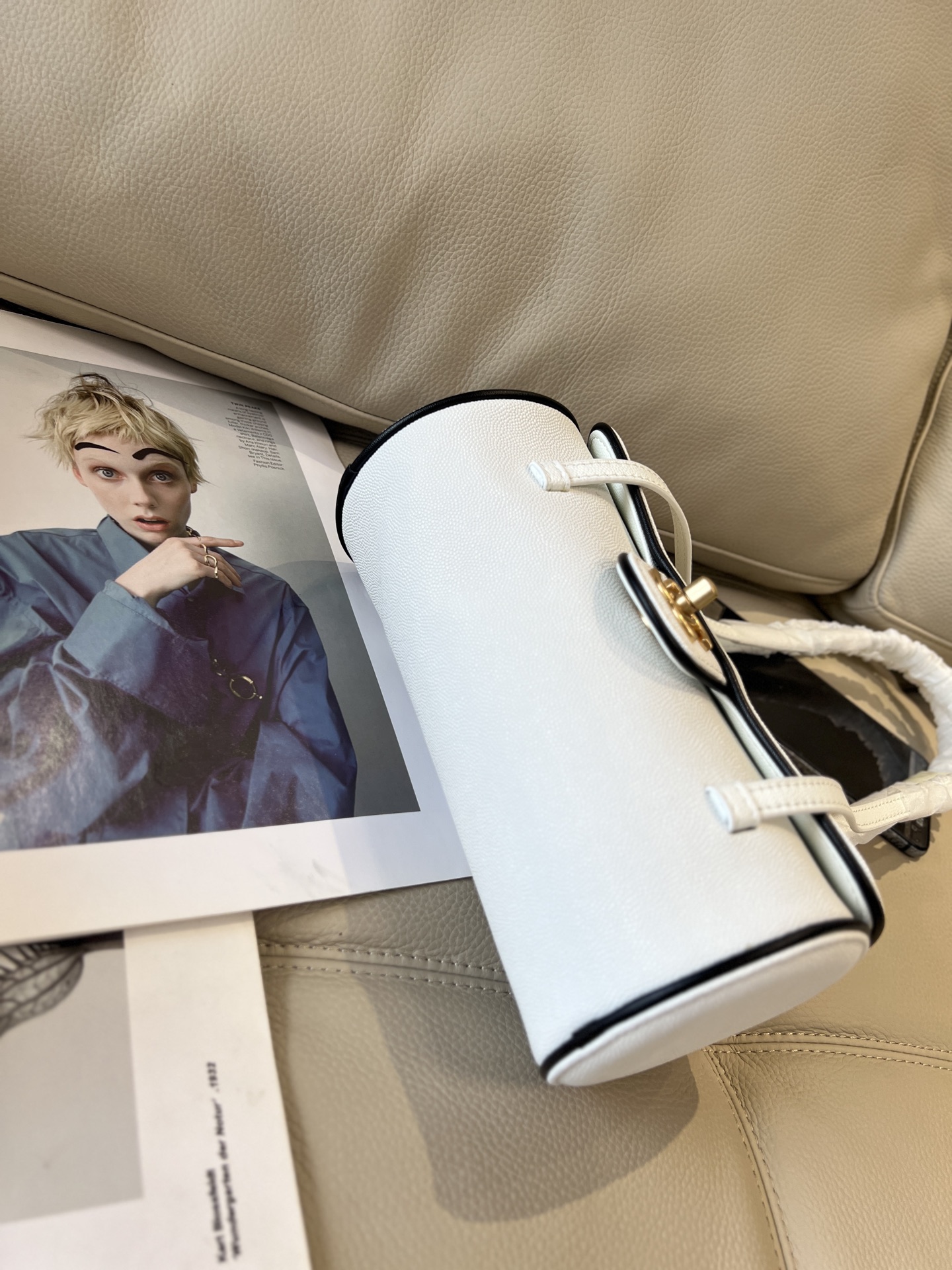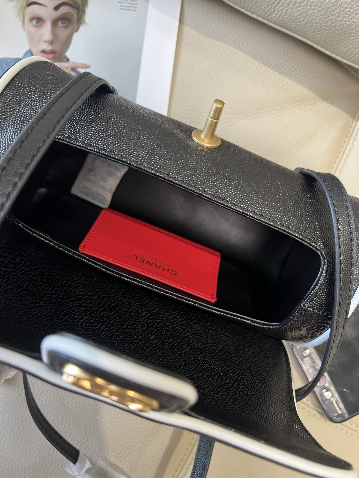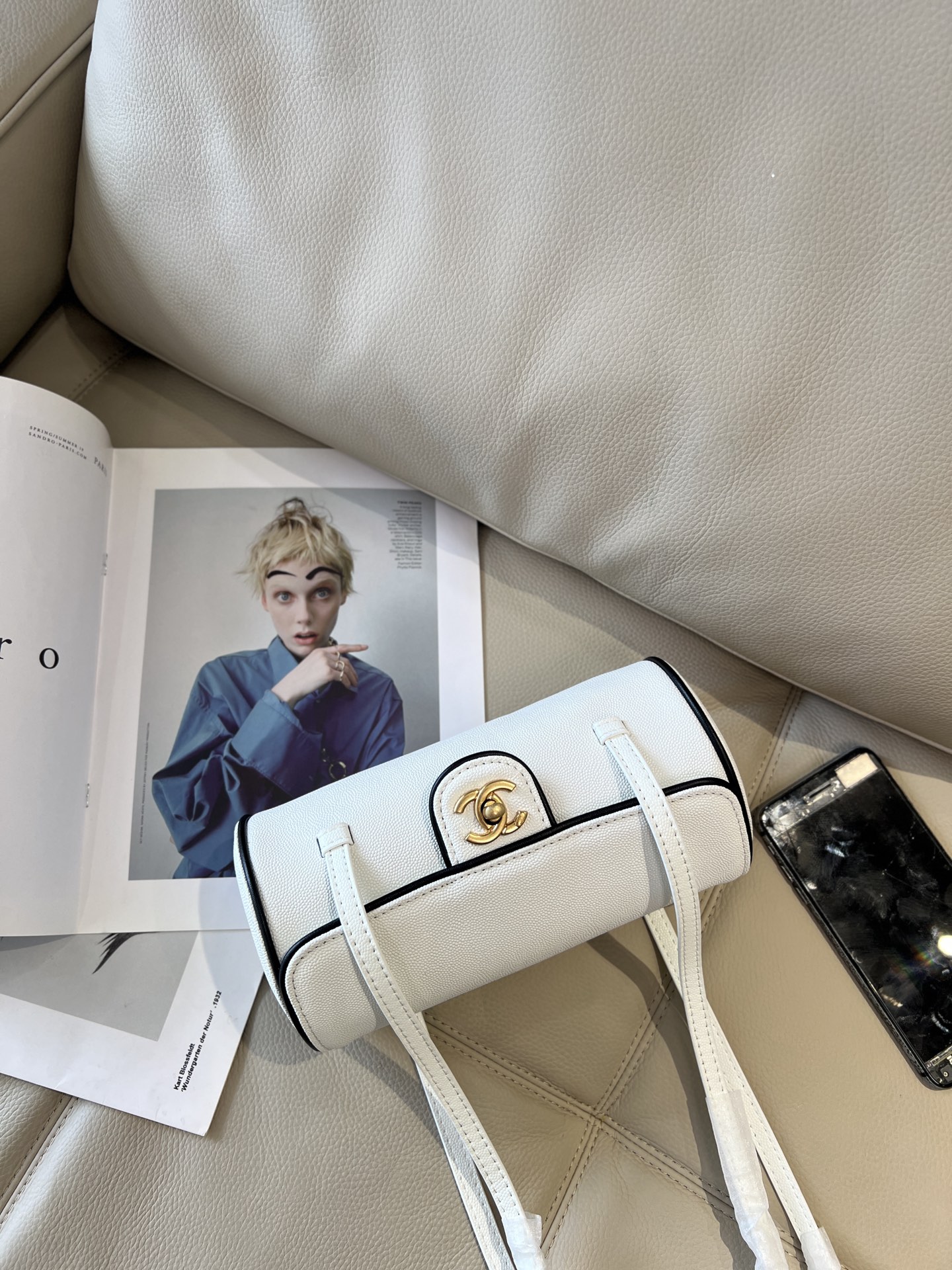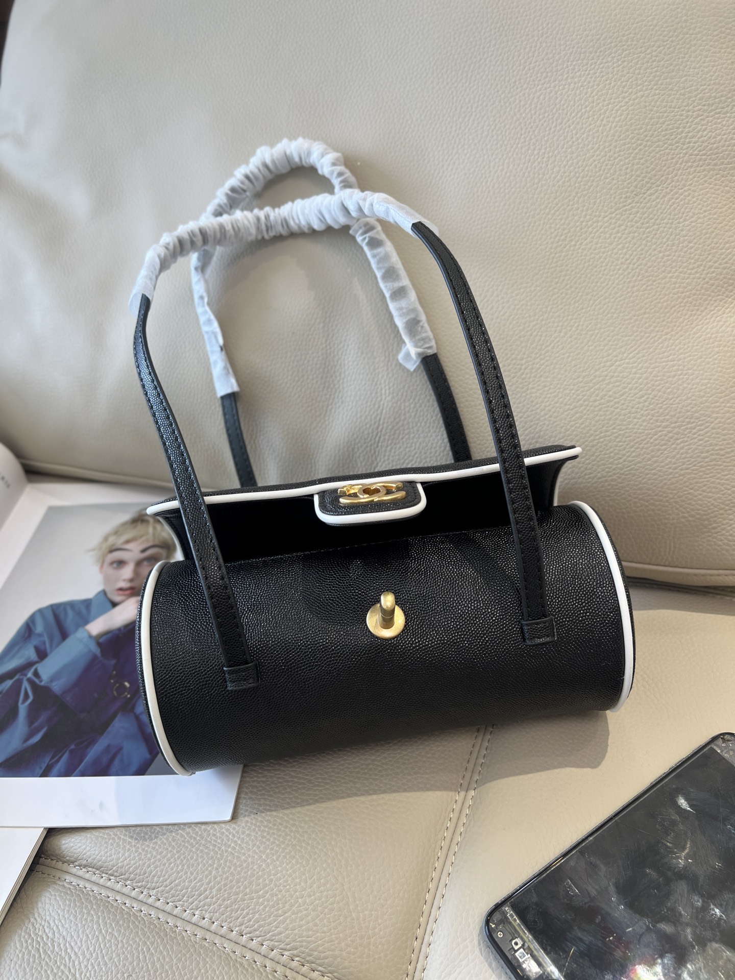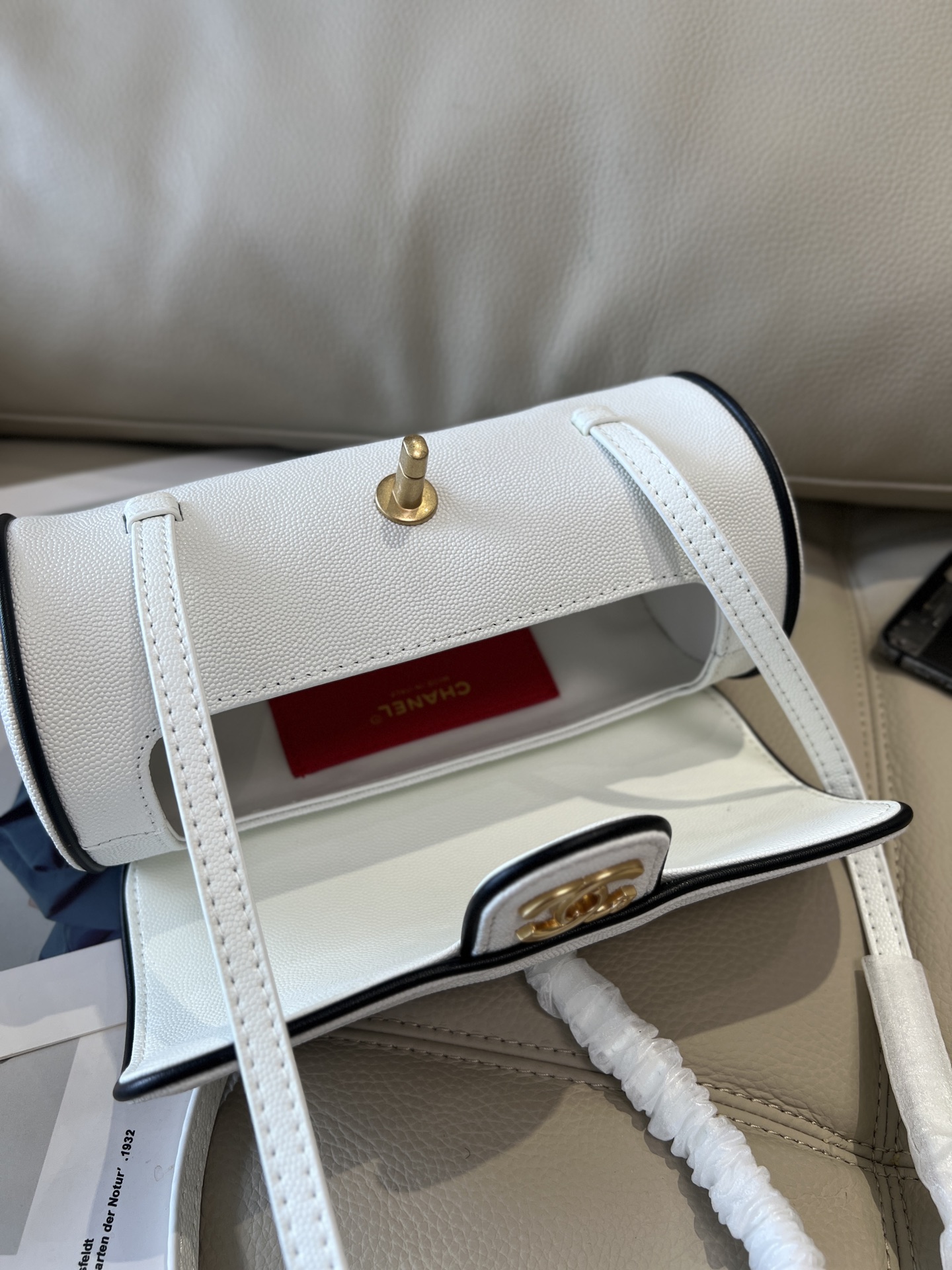 Chanel White& Black Grained Leather Contrast Trim CC Turnlock Cylinder Barrel Bowling Bag