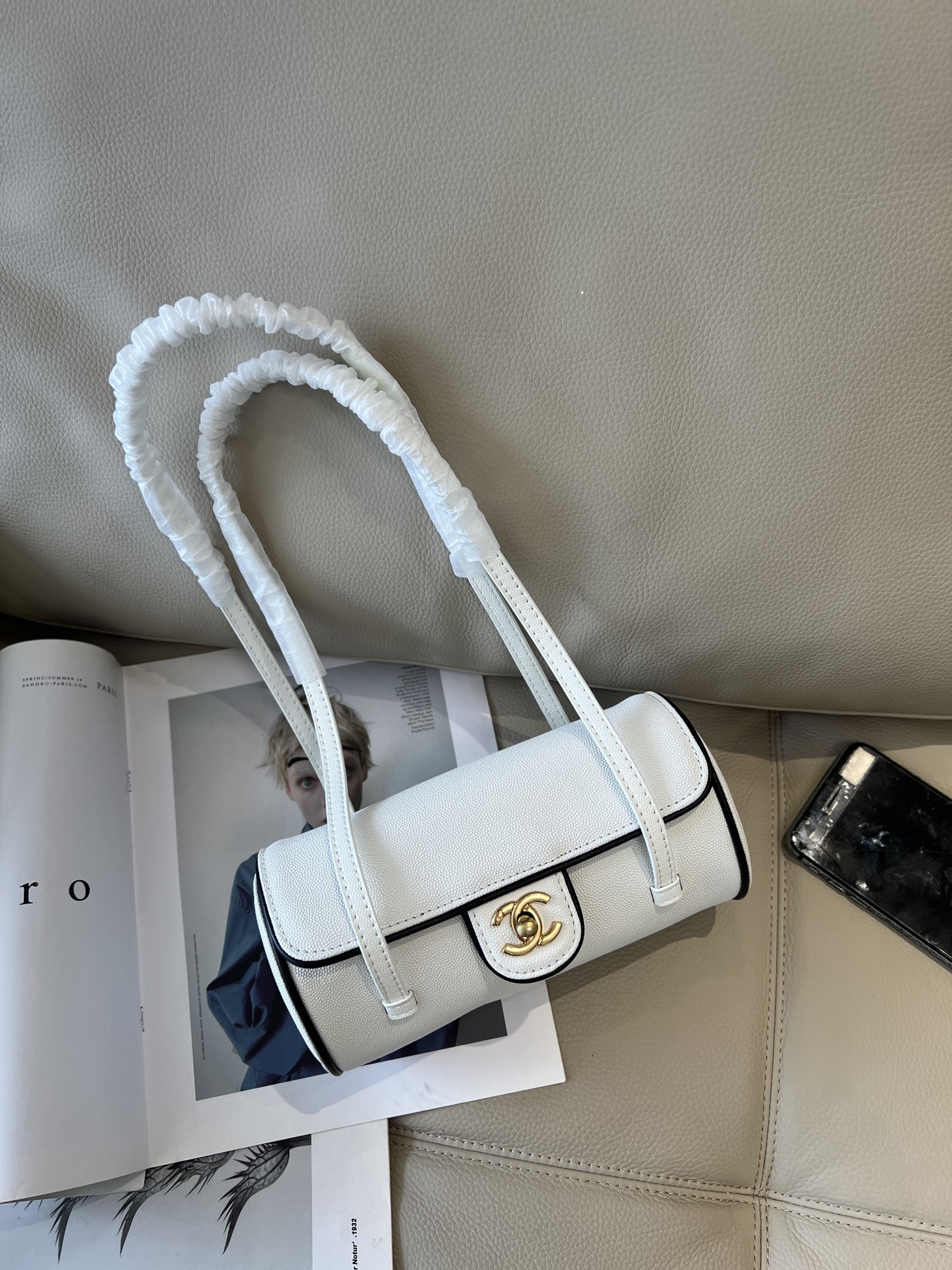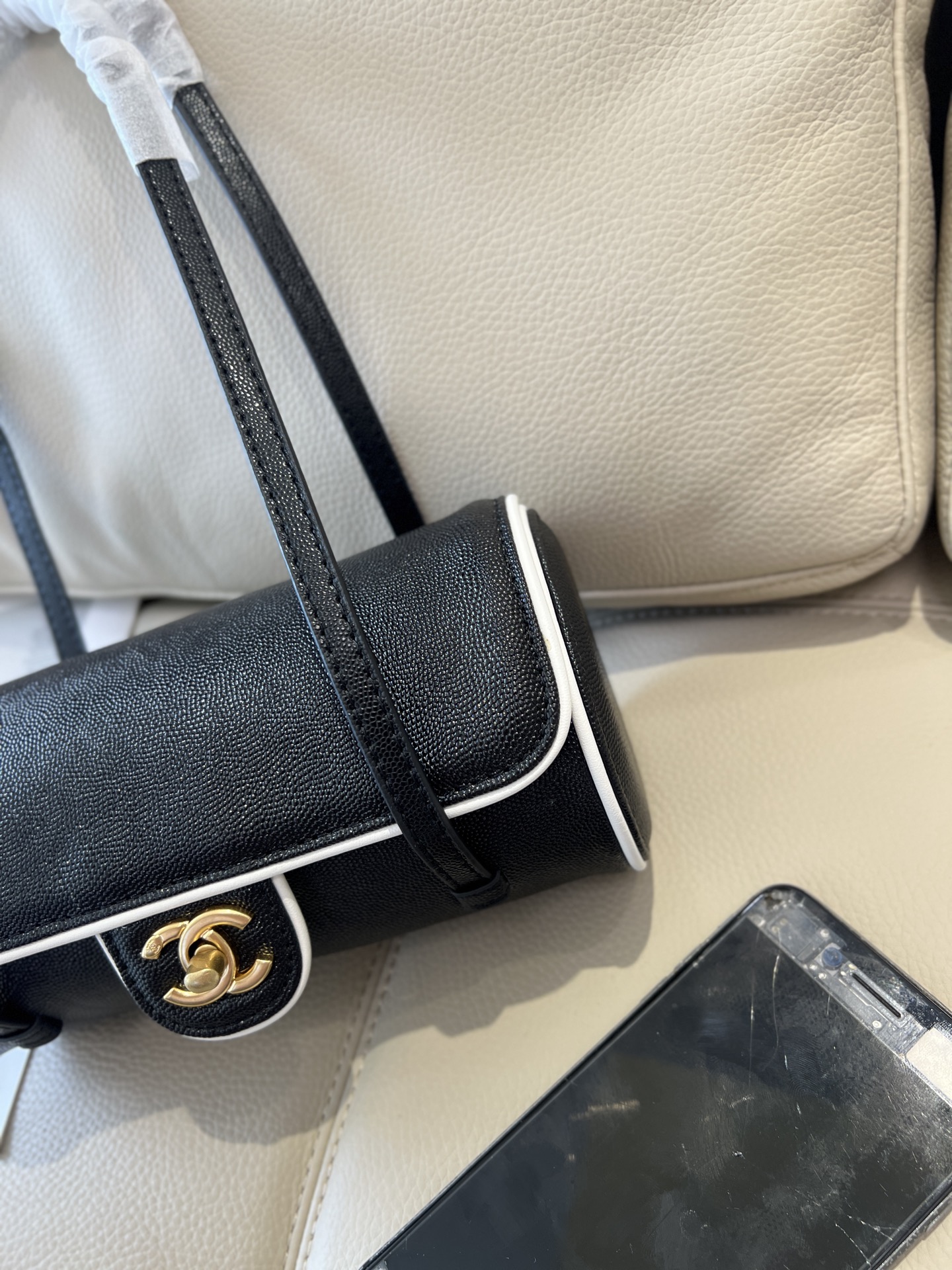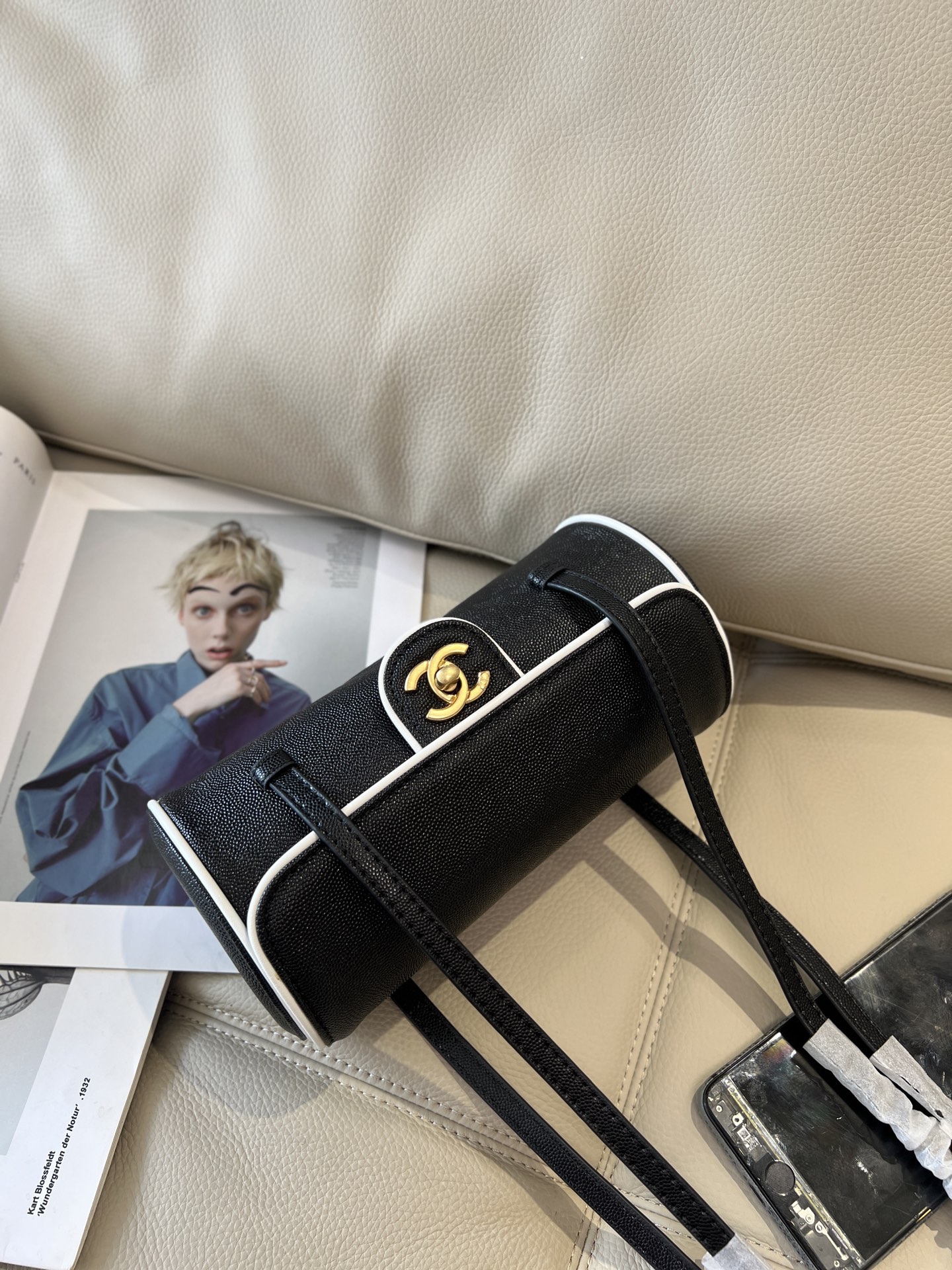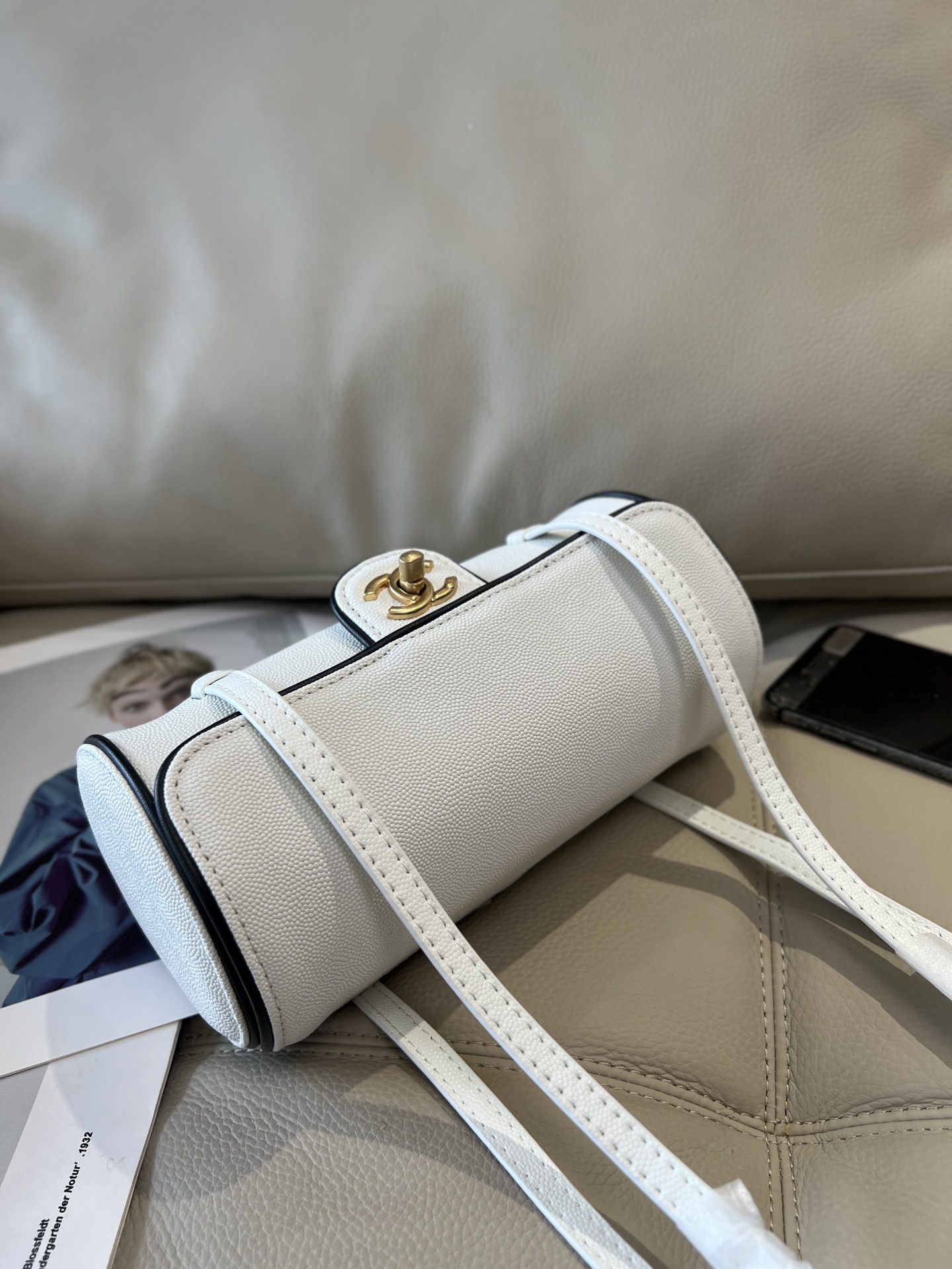 Chanel White& Black Grained Leather Contrast Trim CC Turnlock Cylinder Barrel Bowling Bag
