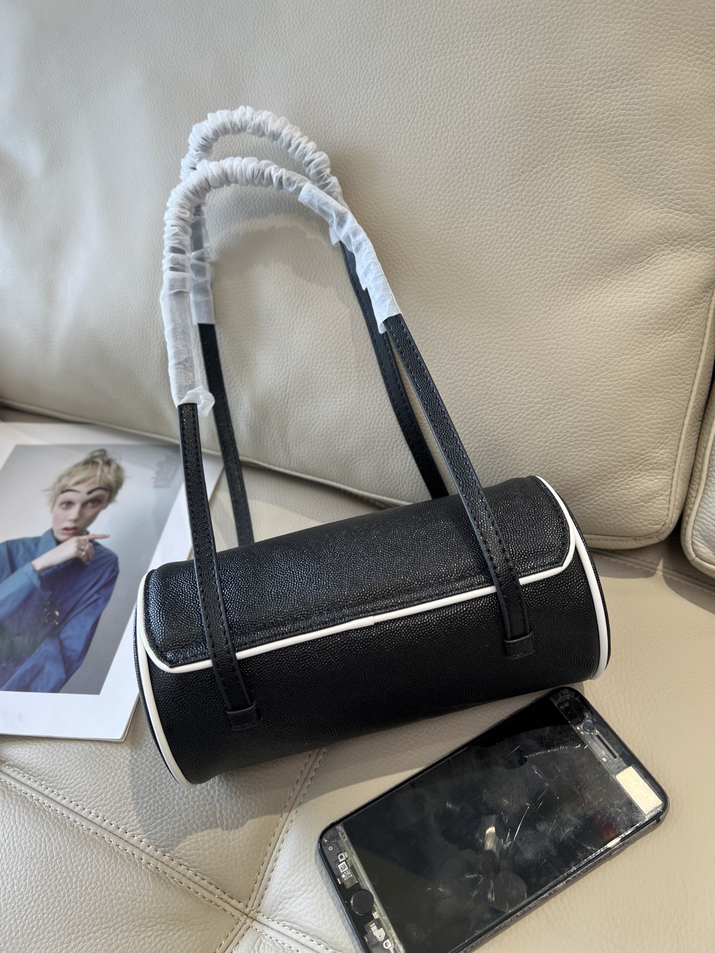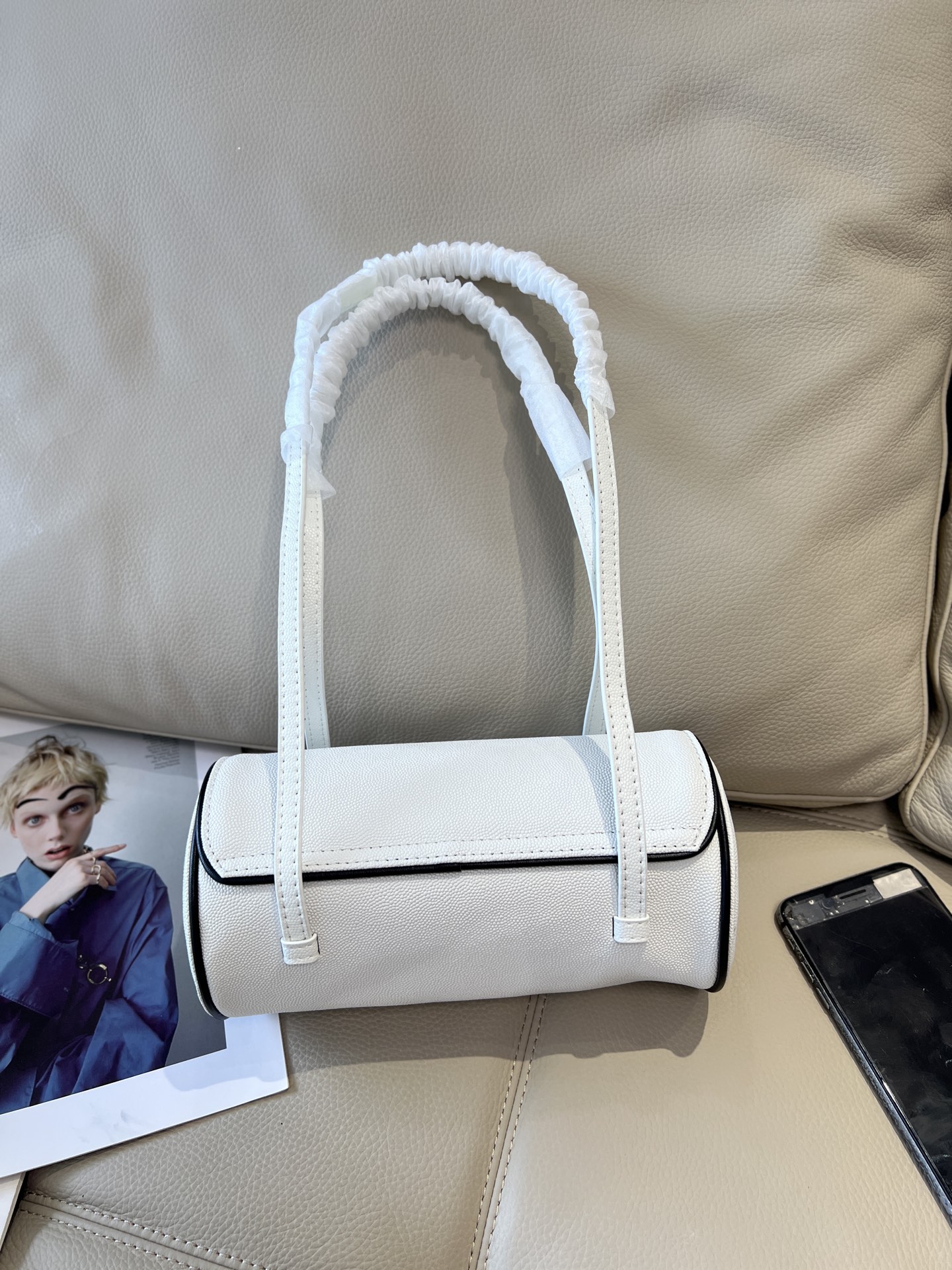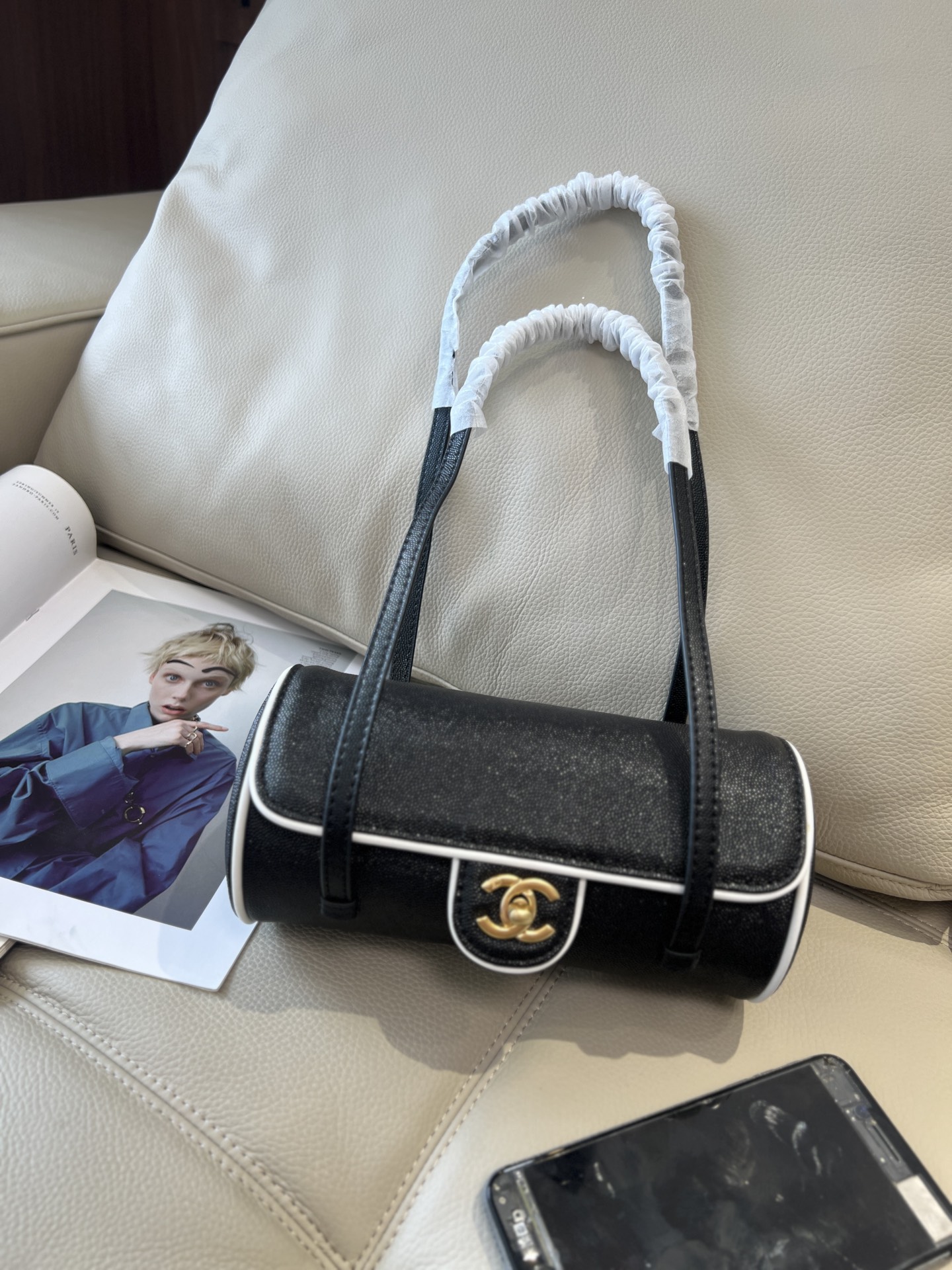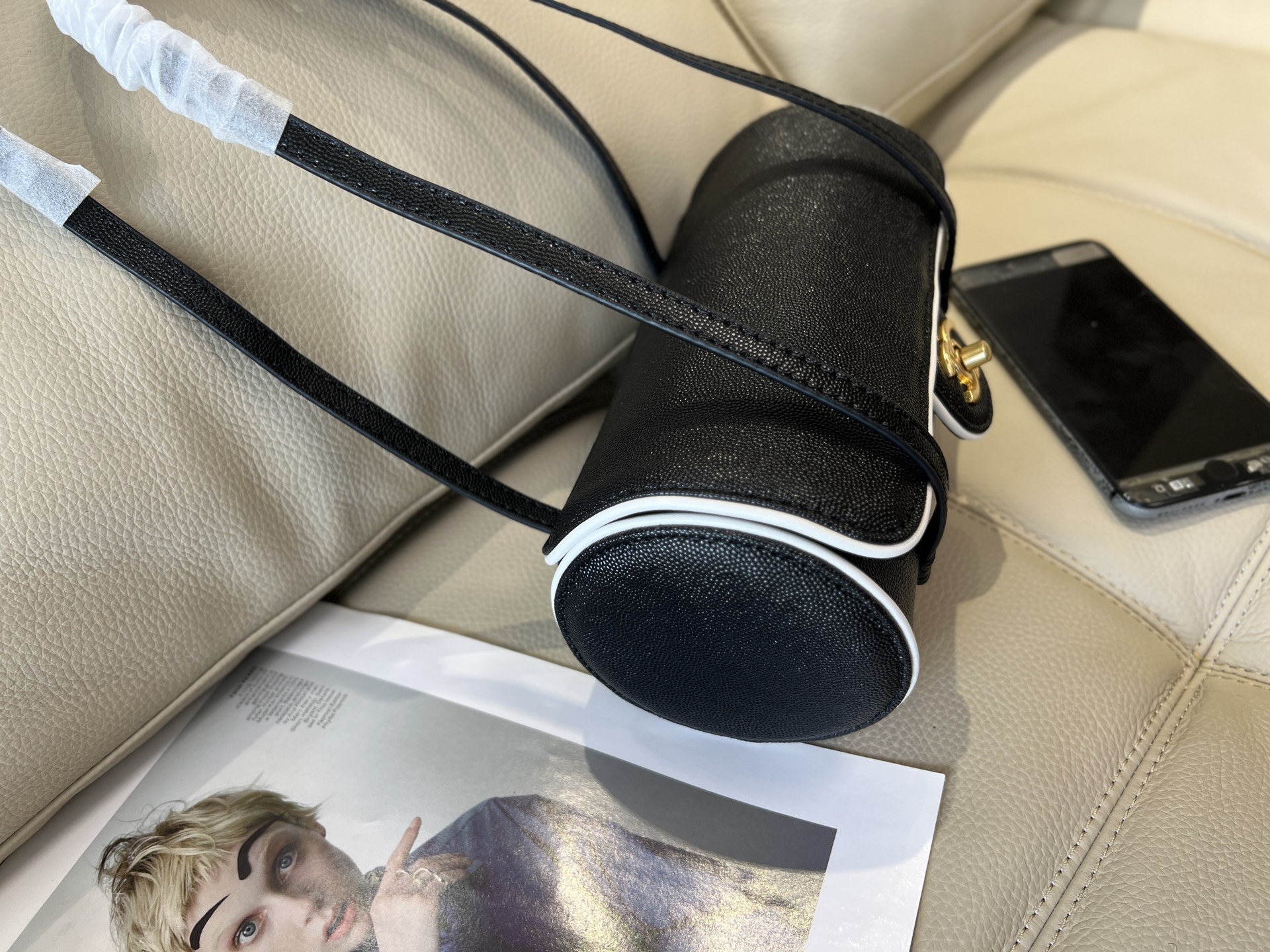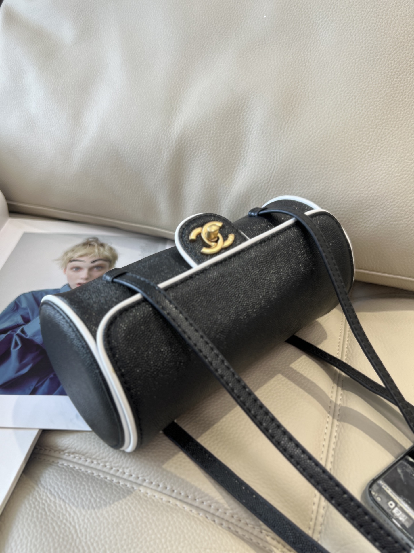 Chanel White& Black Grained Leather Contrast Trim CC Turnlock Cylinder Barrel Bowling Bag