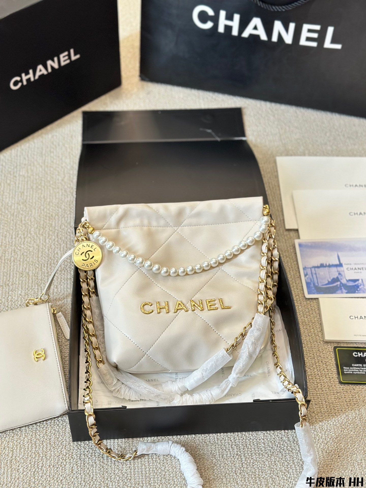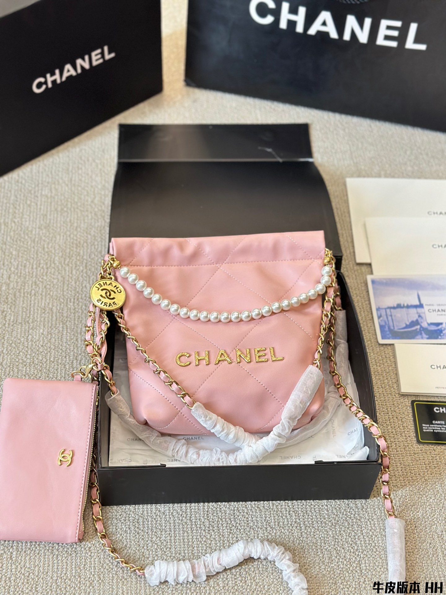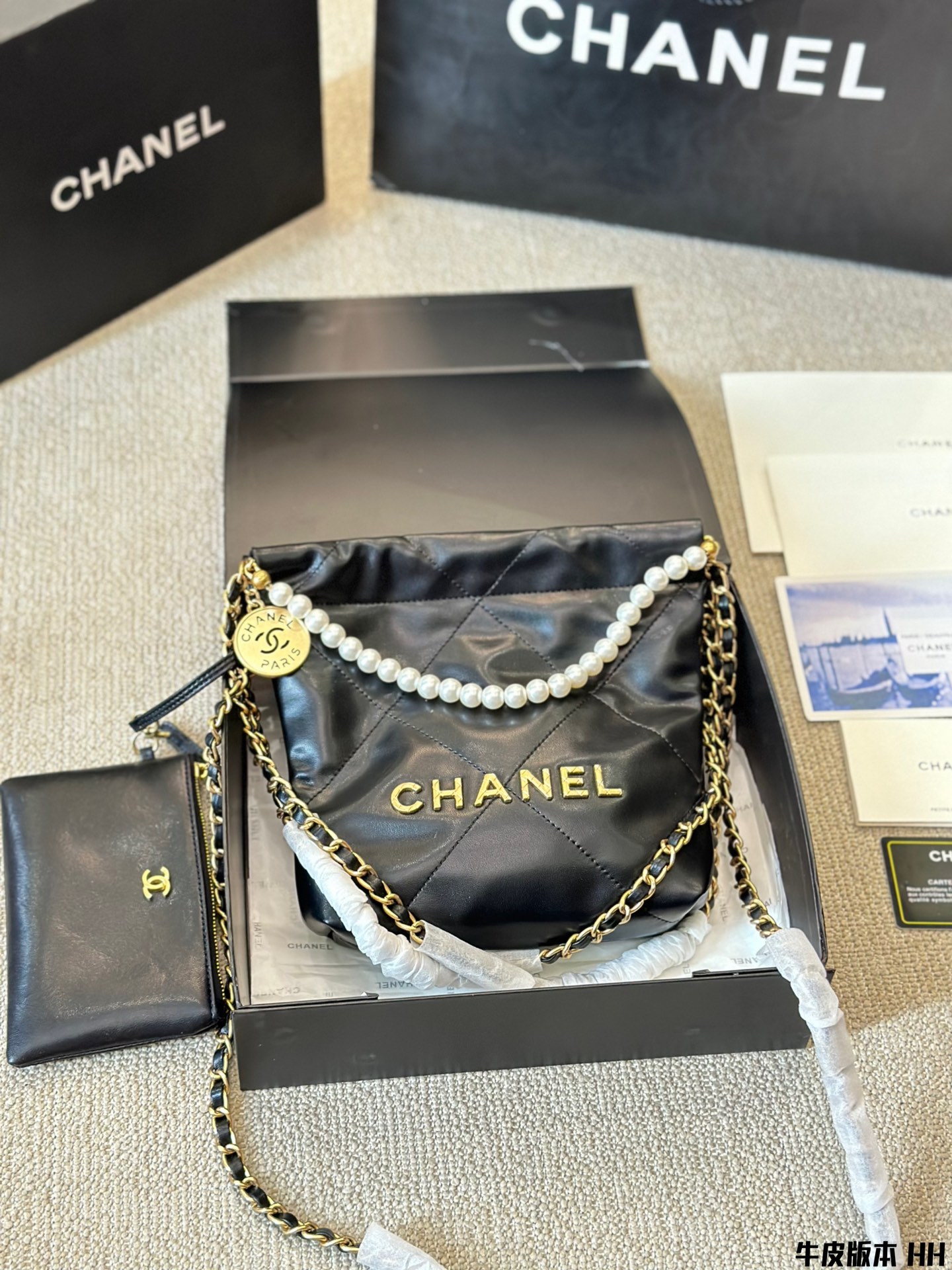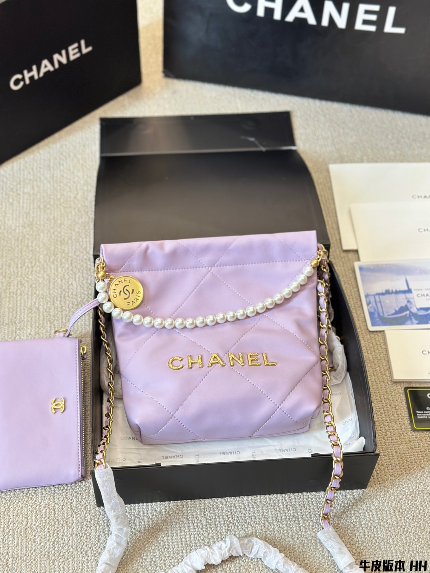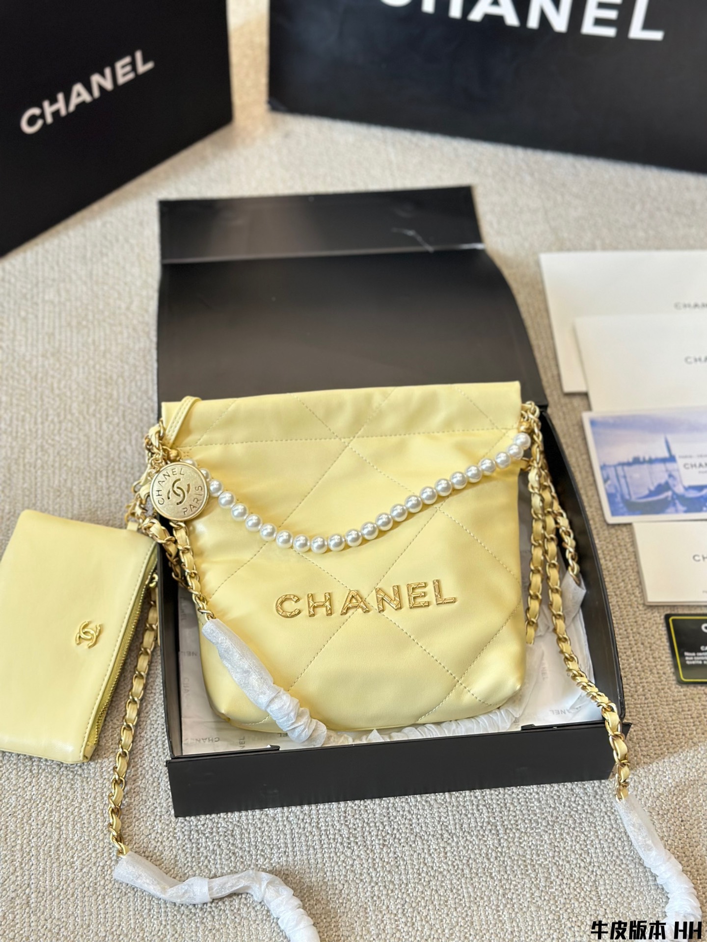 Chanel 22 Mini Diamond Quilted Shiny Crumpled Calf Drawstring Pearl Chain Bucket Bag With Pouch