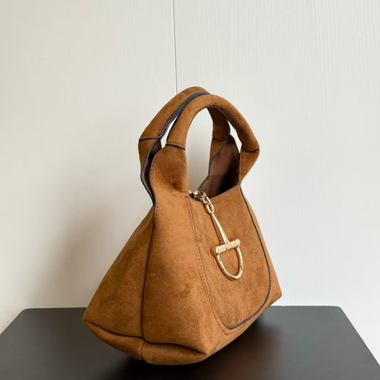 Gucci Metal Horsebit Suede Curved Top Handle Tote Bag/ Cognac