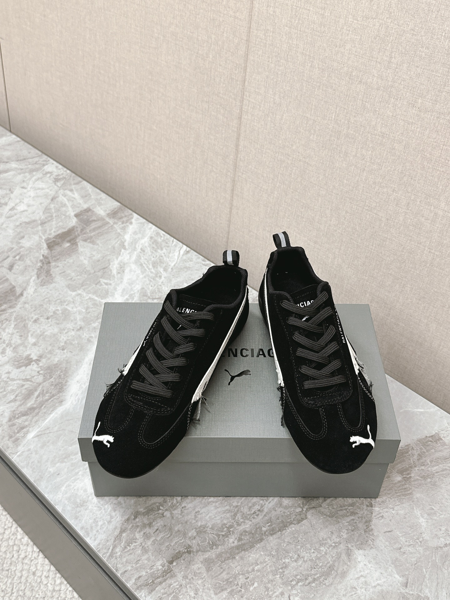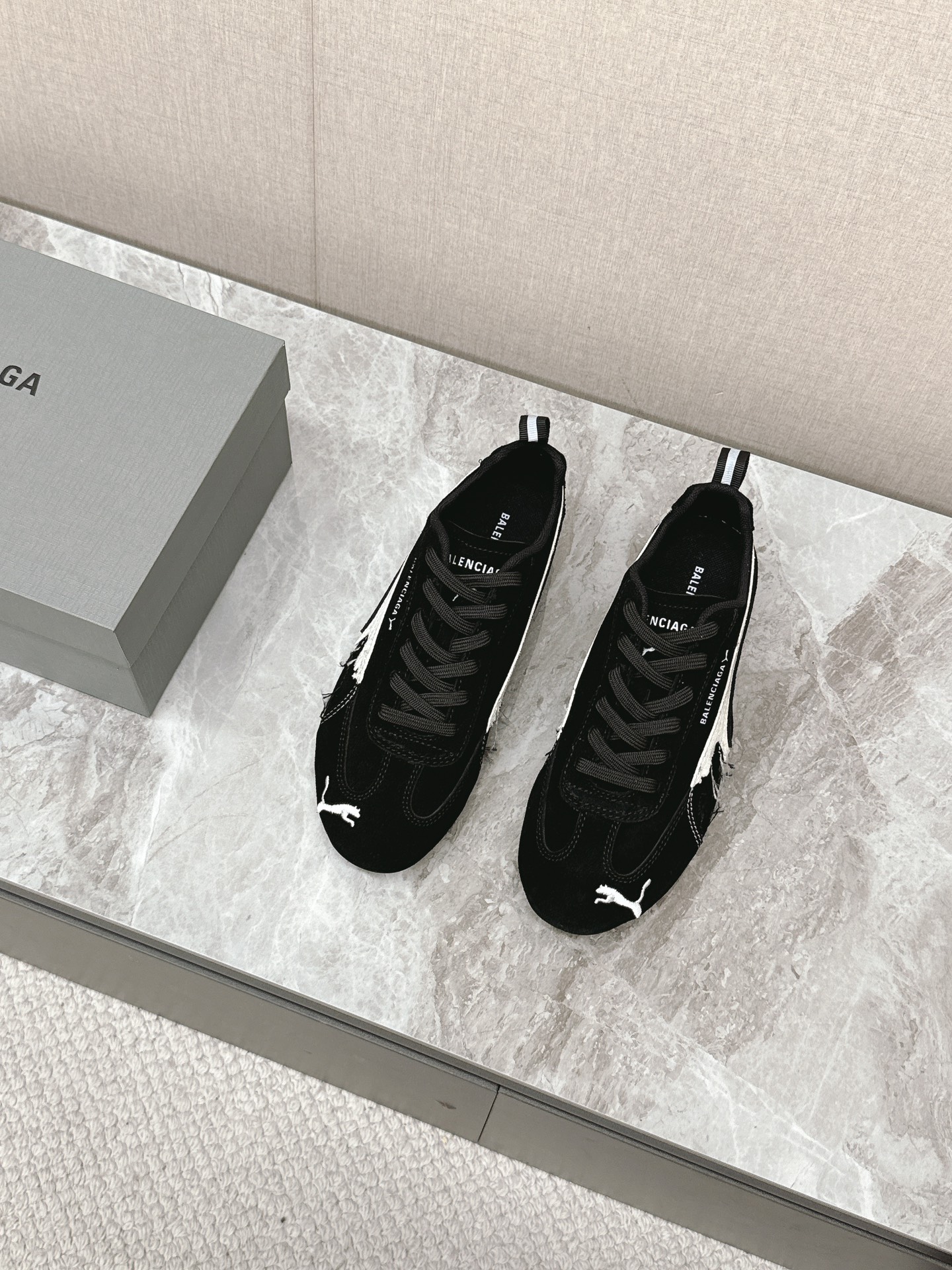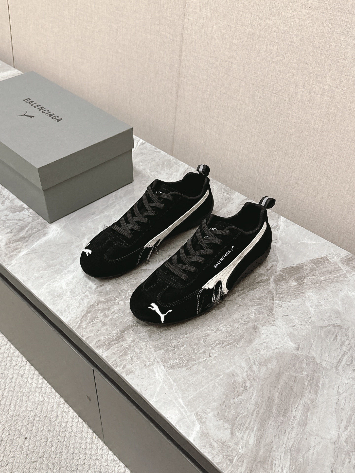 Balenciaga x Puma Black Worn-Out Broken Logo Leather Suede Speed GAT Sneakers