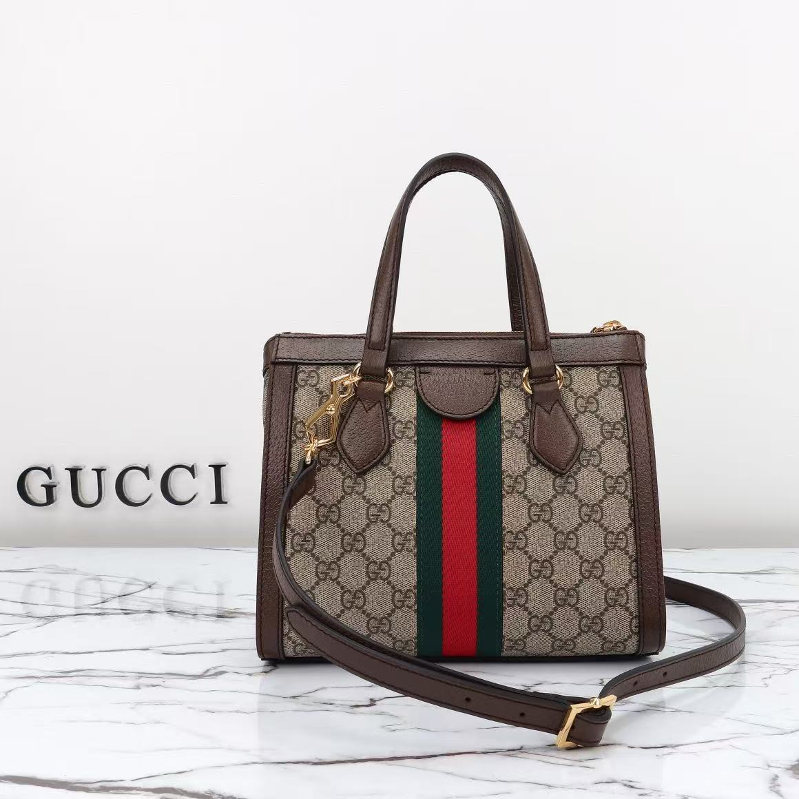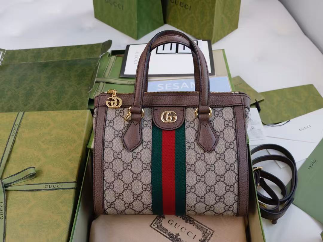 Gucci GG Monogram Web Strap Leather Trim Handle Crossbody Tote Bag