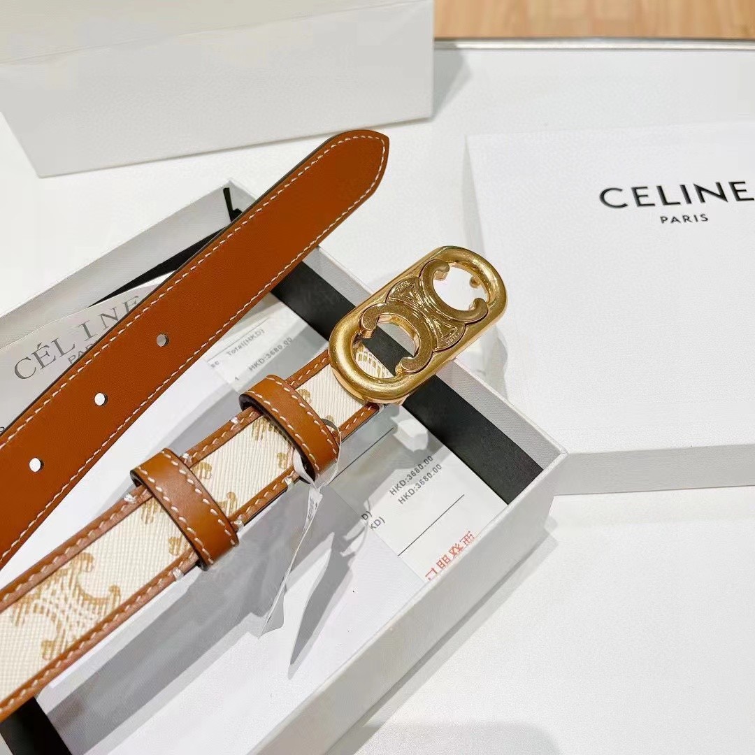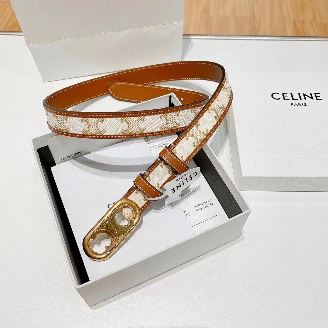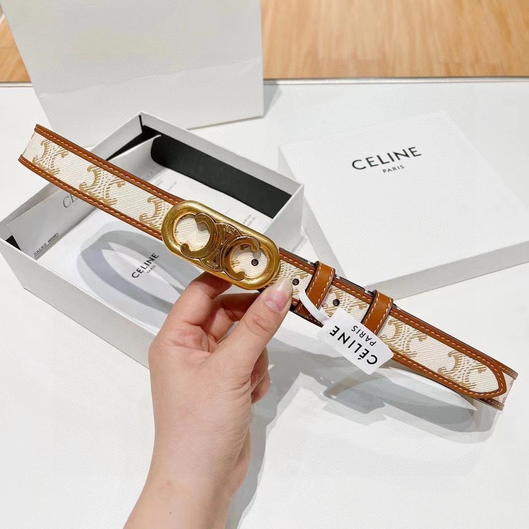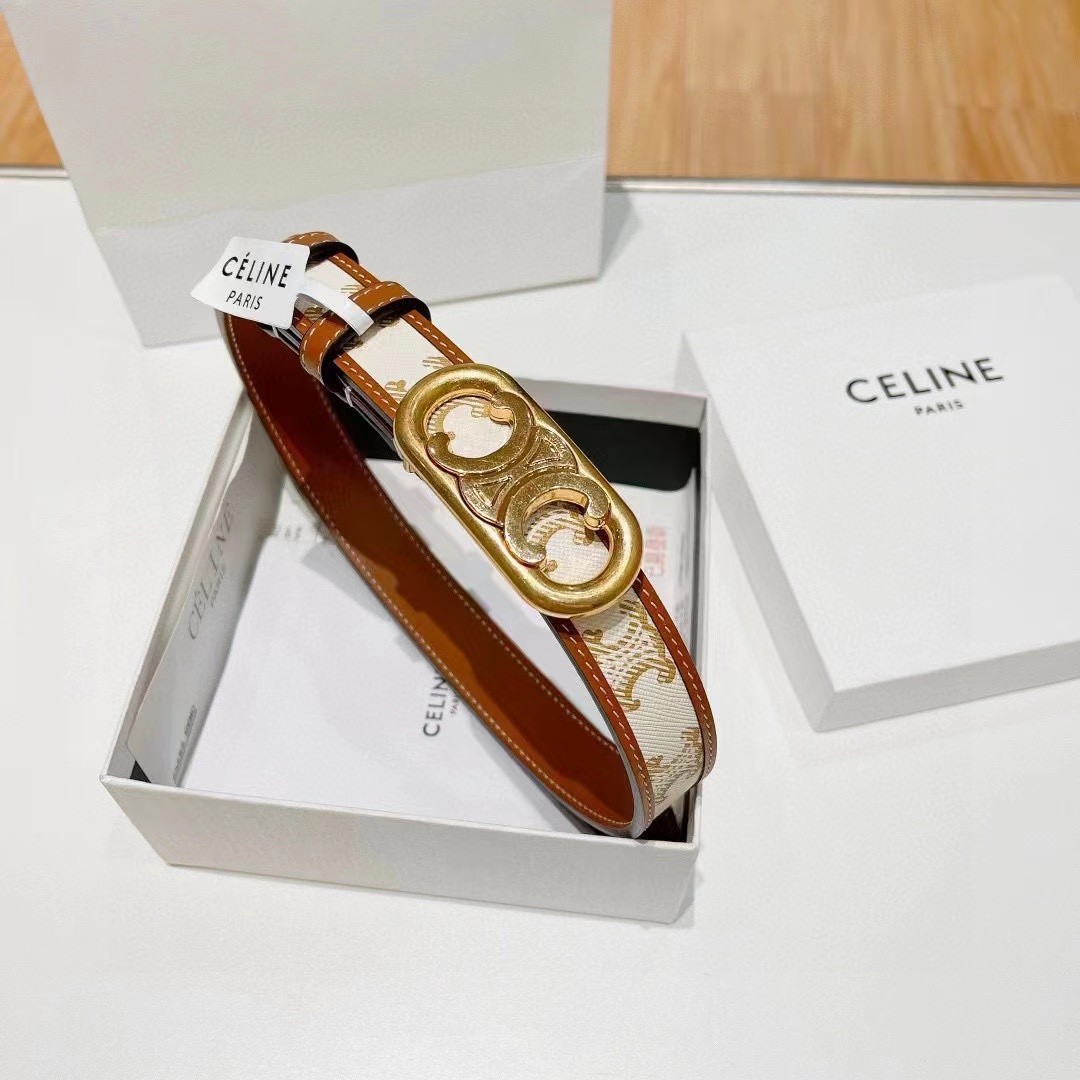Celine 2.5cm White Triomphe Monogram Canvas Leather Gold Circle Buckle Narrow Belt
