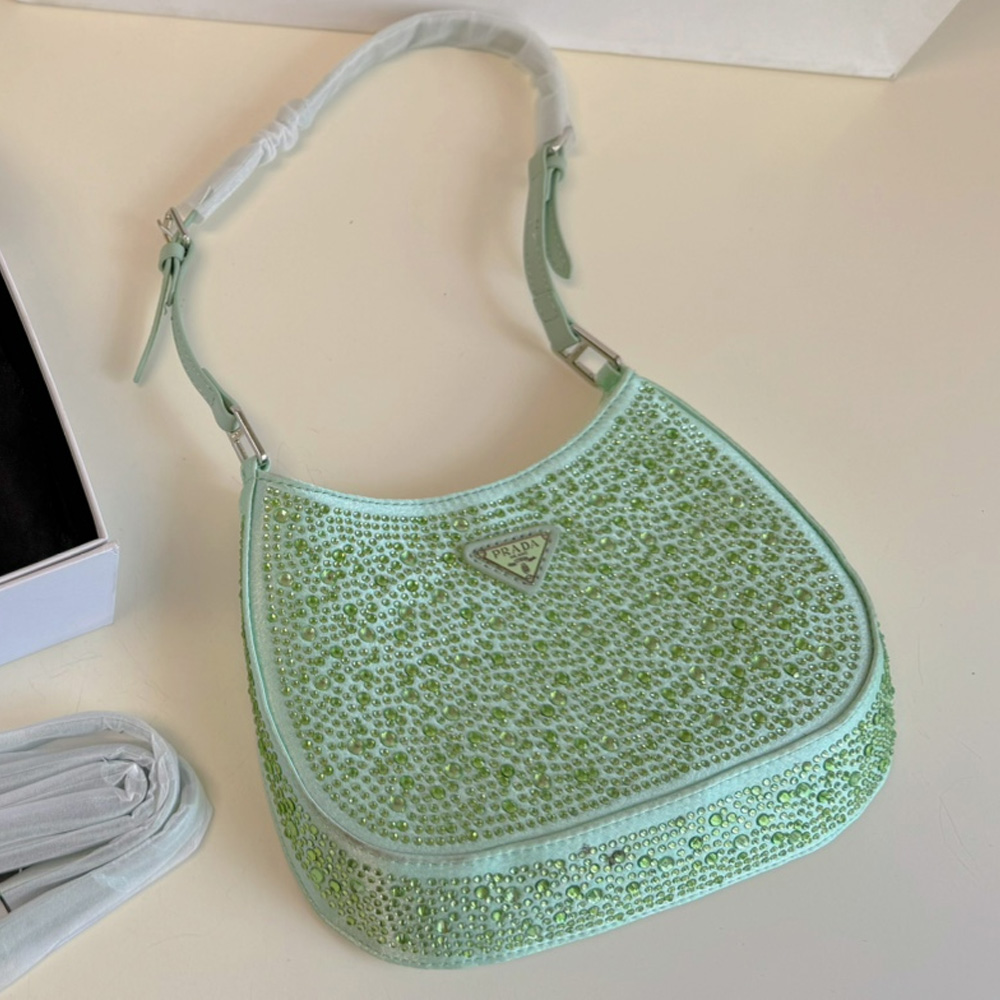 Prada Triangle Logo All Over Crystal Satin Curved Hobo Shoulder Bag