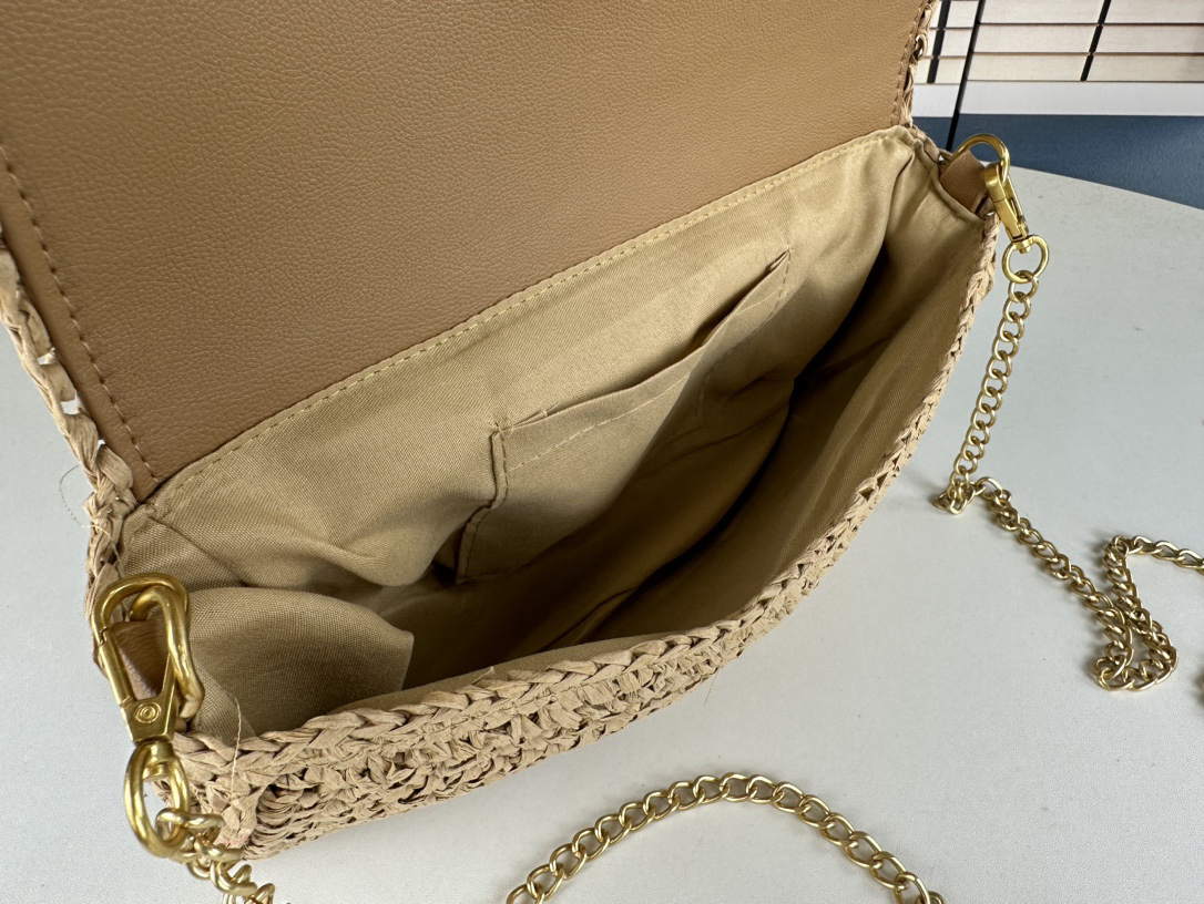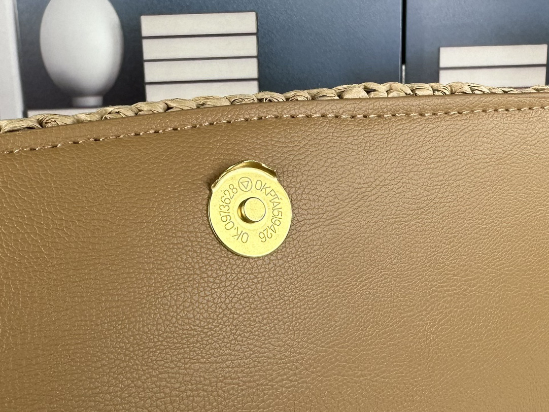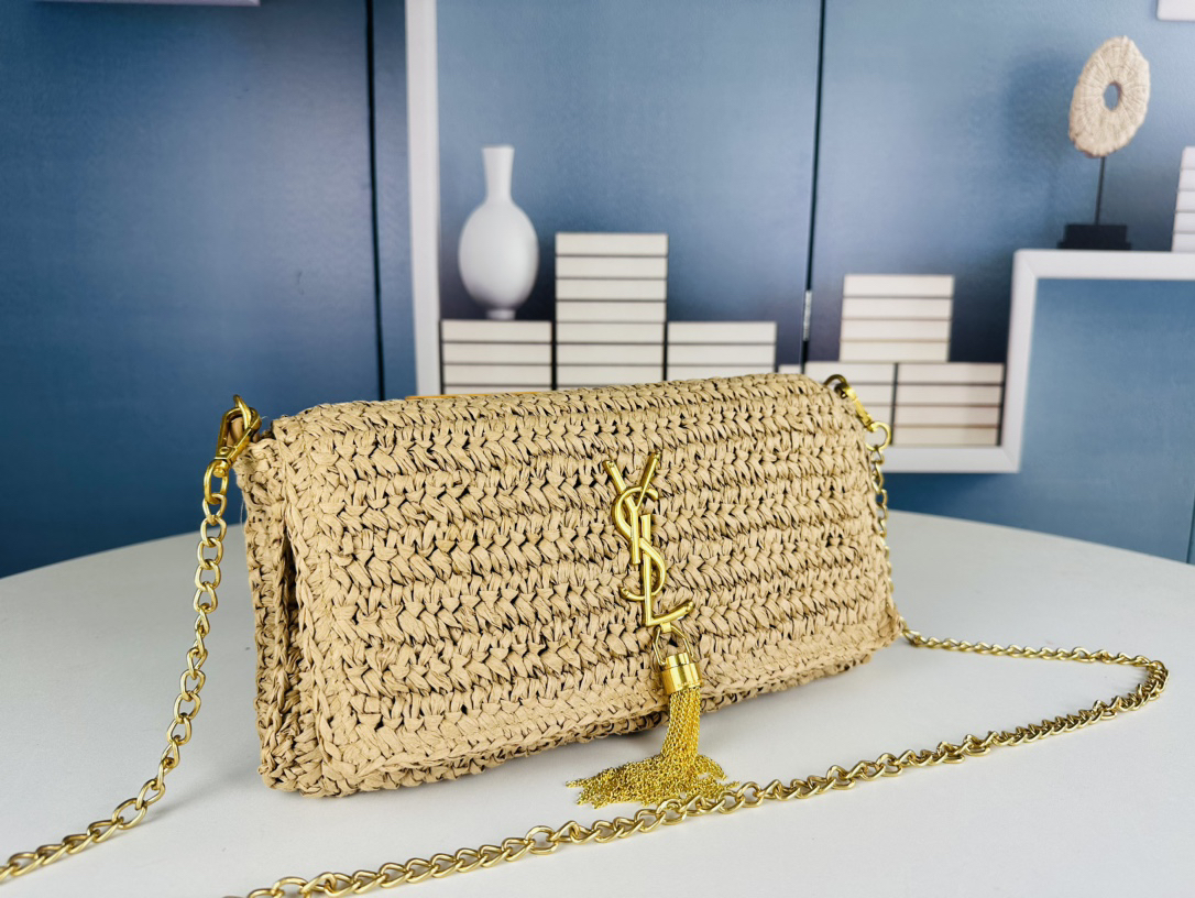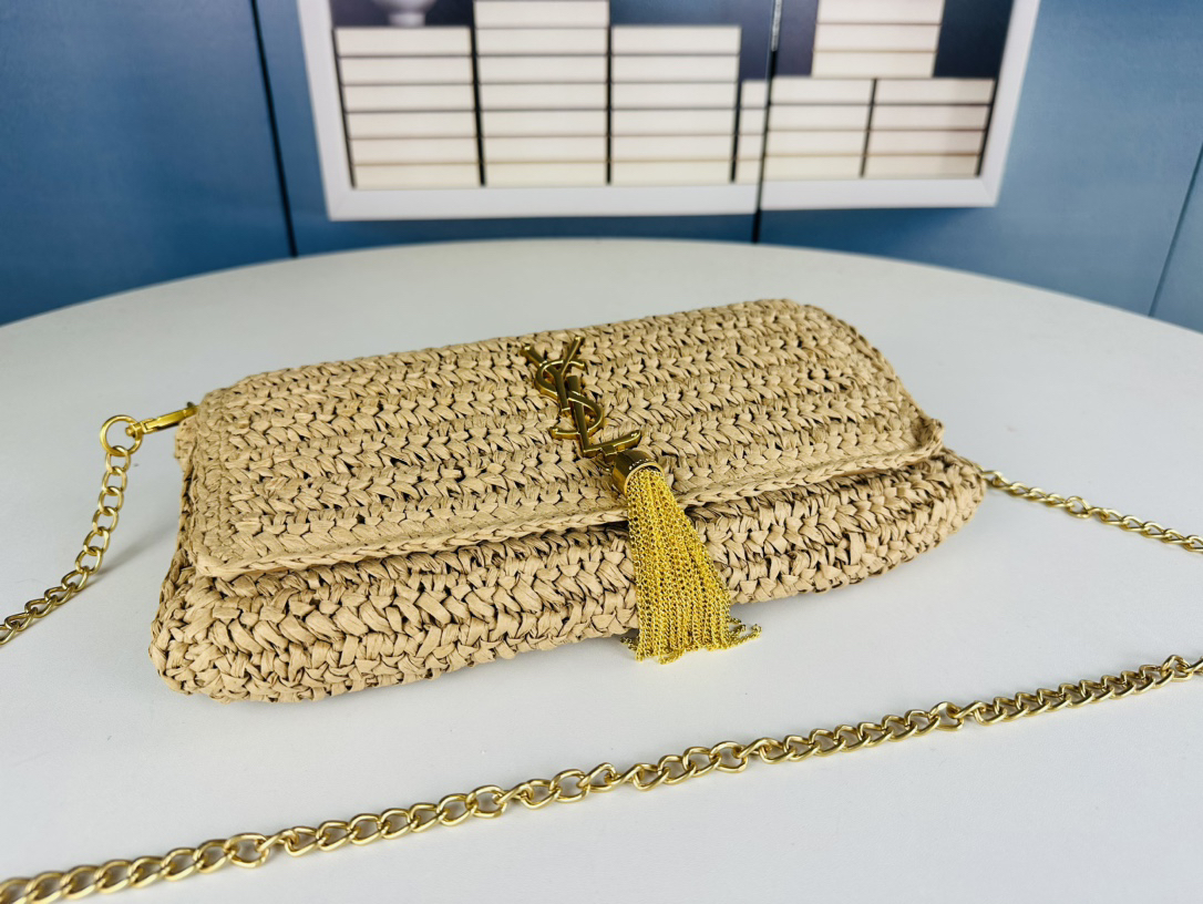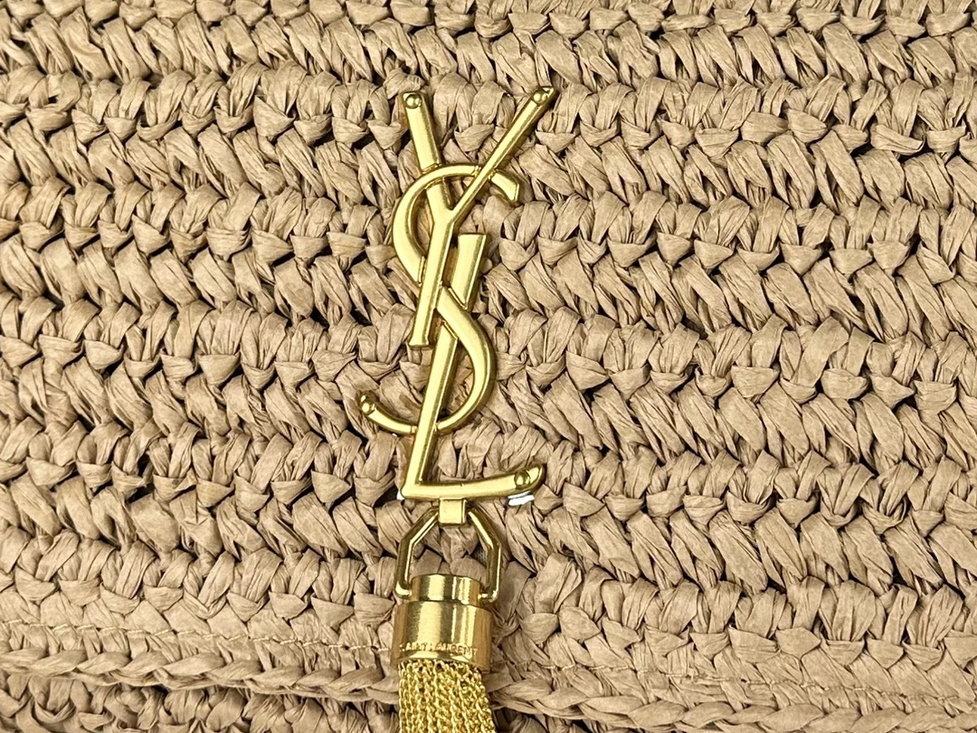 Saint Laurent Kate Woven Raffia Chain Shoulder Bag with Gold Metal Tassel