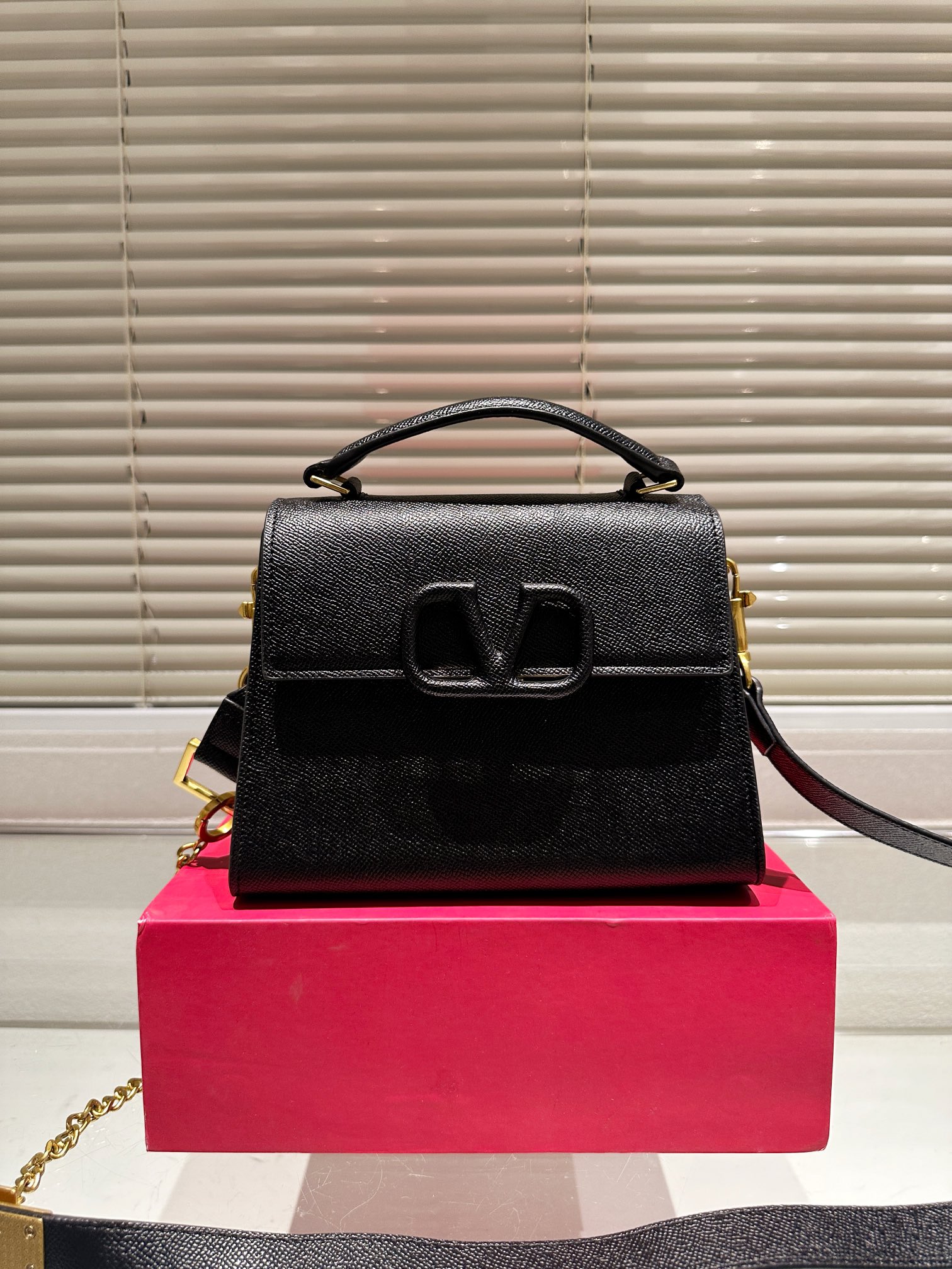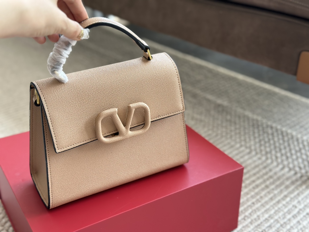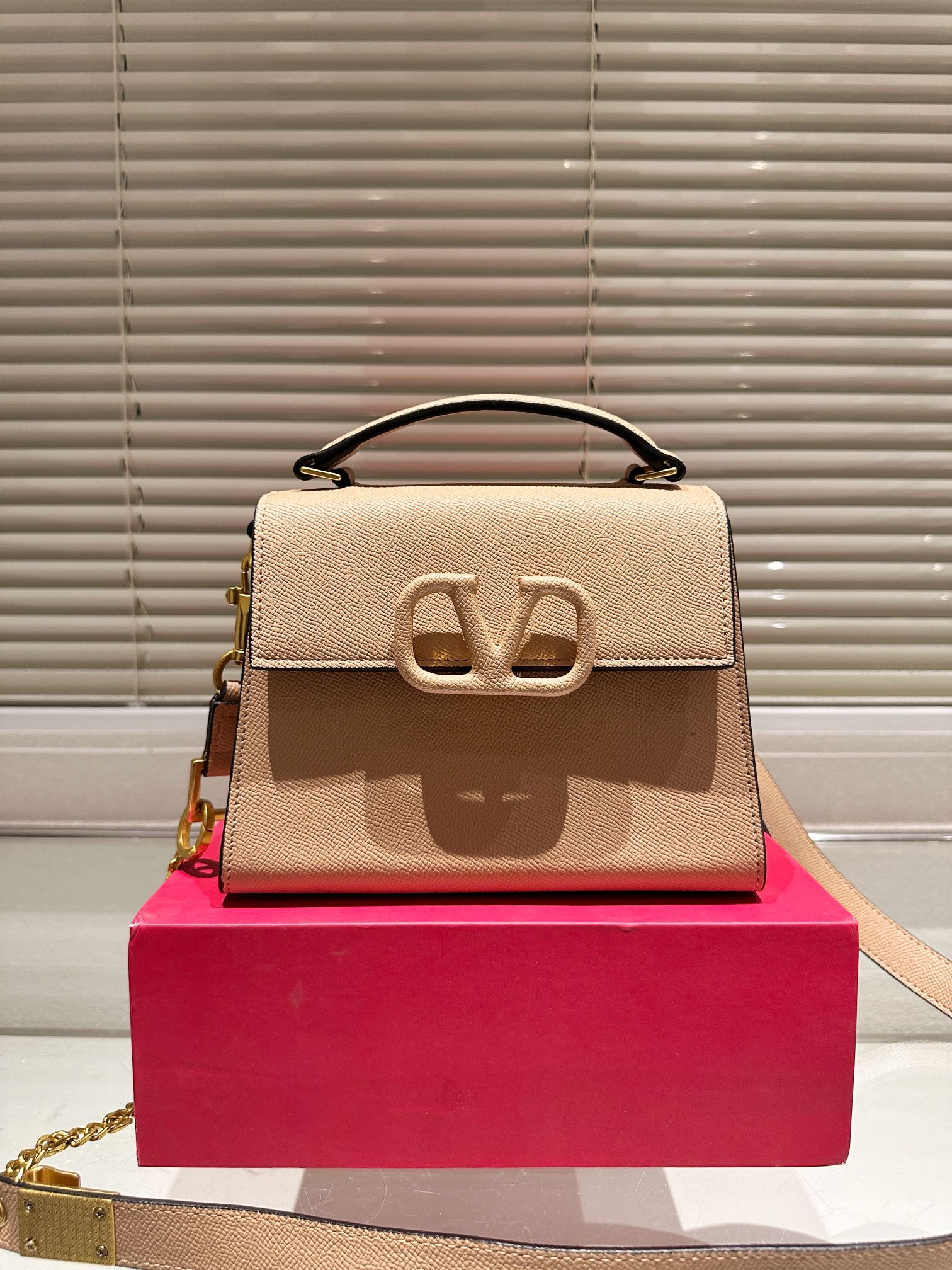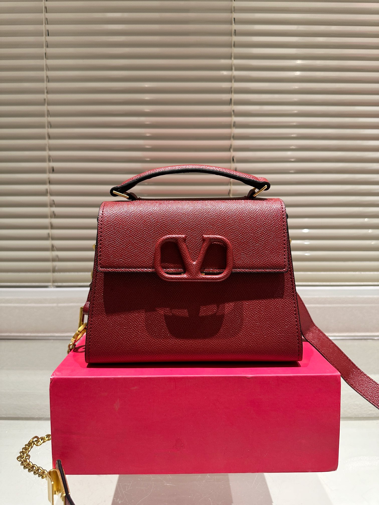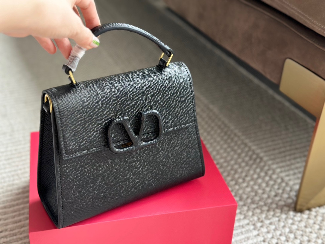 Valentino Grainy Leather Leather-Covered V-Logo Satchel Trapeze Handle Shoulder Bags