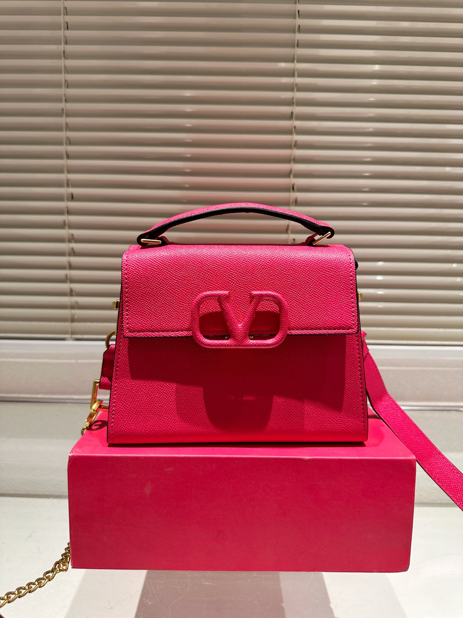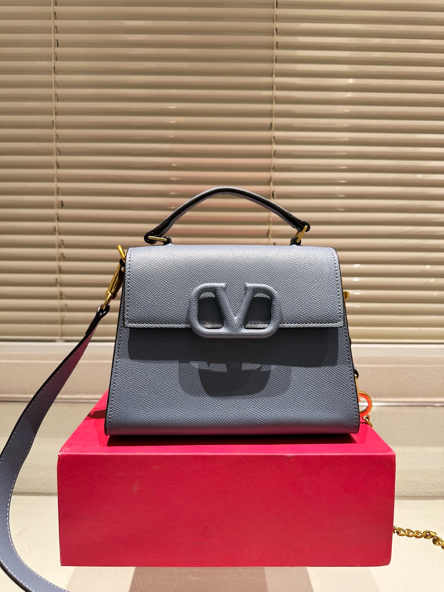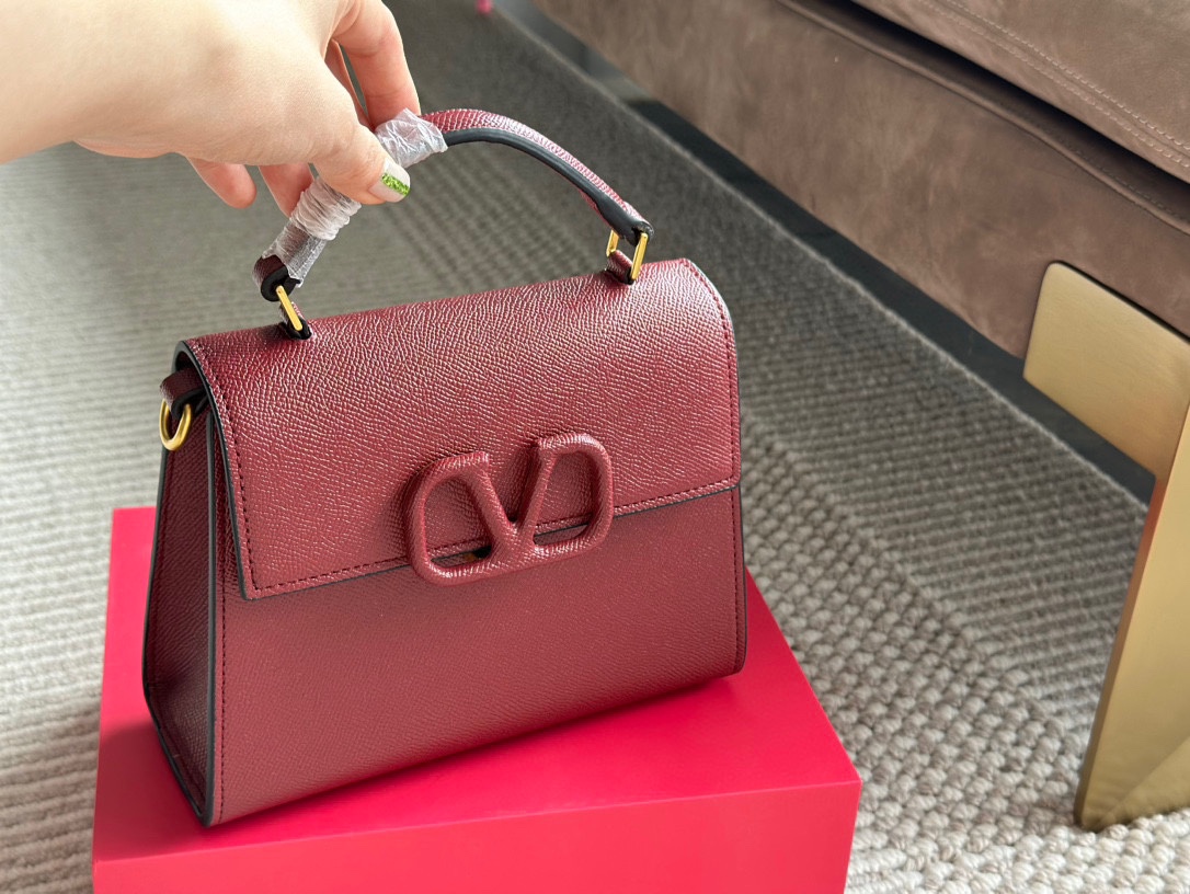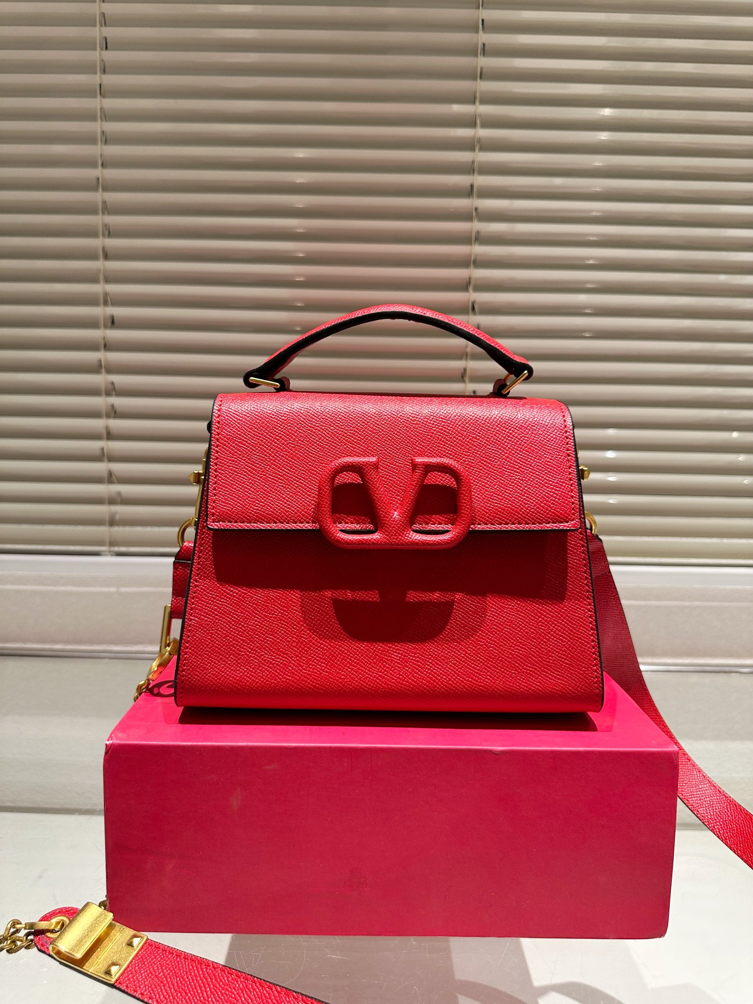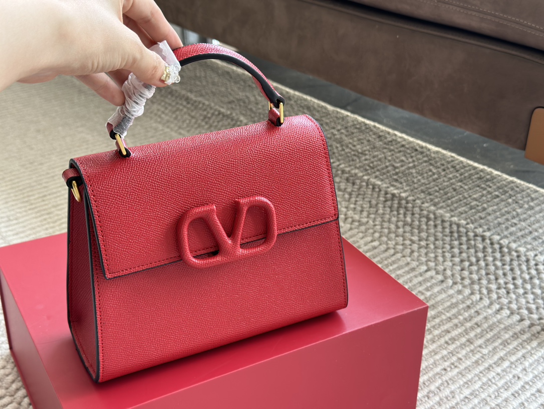 Valentino Grainy Leather Leather-Covered V-Logo Satchel Trapeze Handle Shoulder Bags