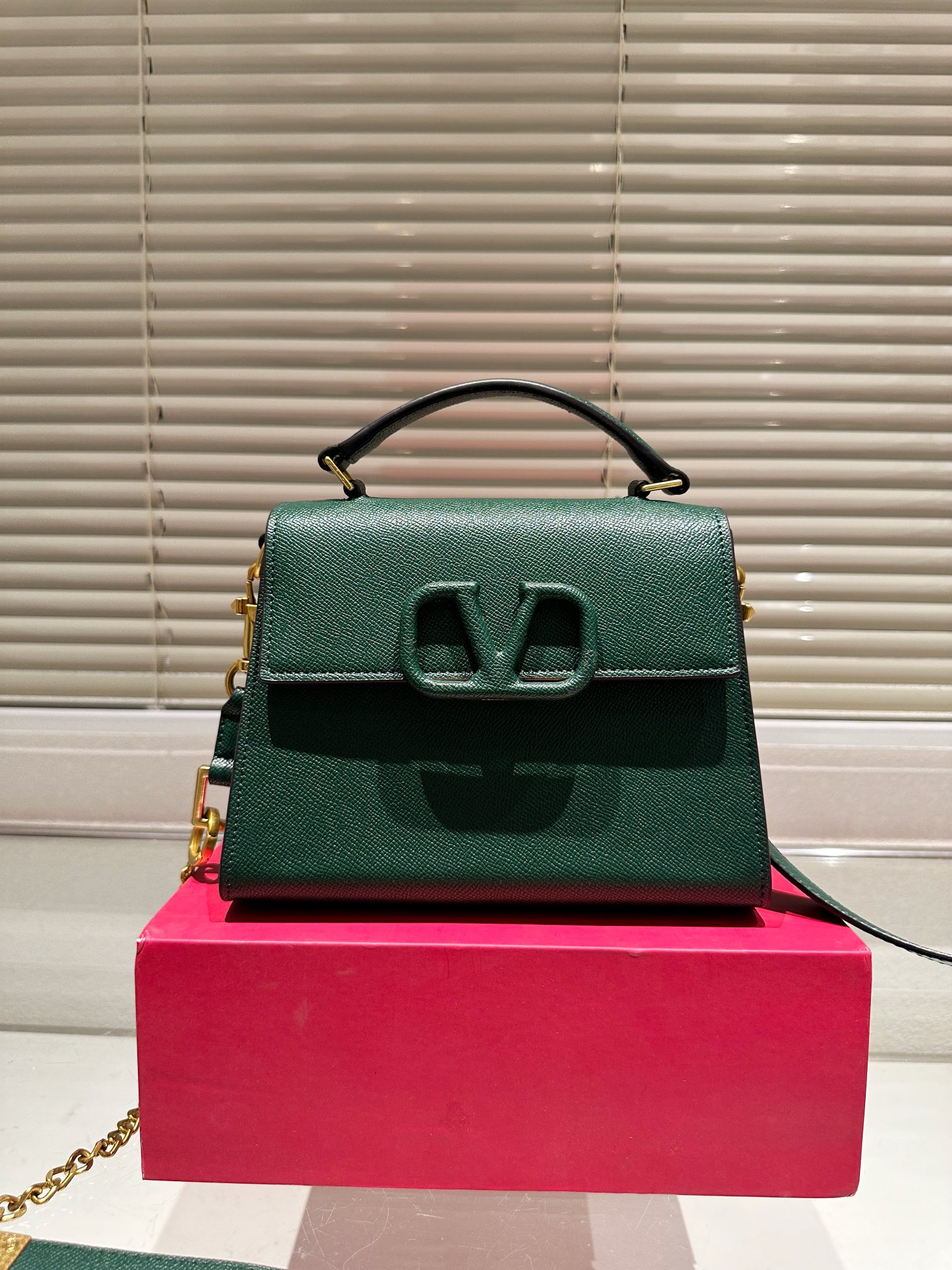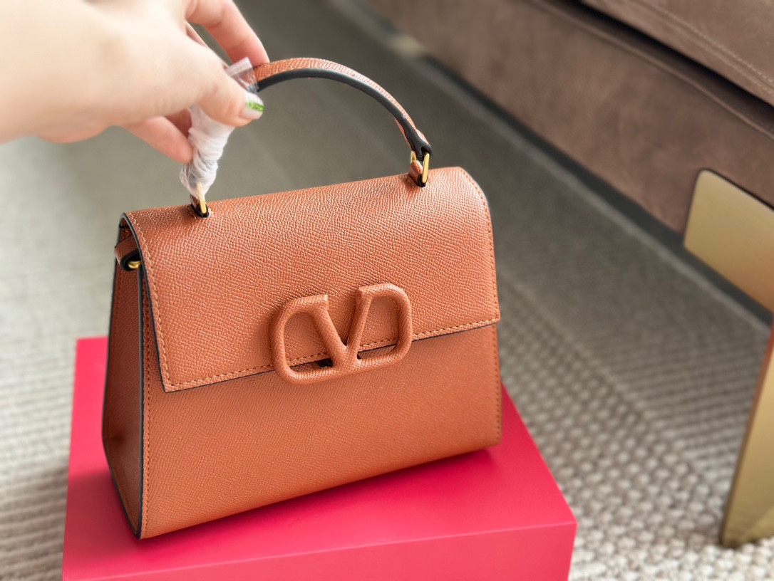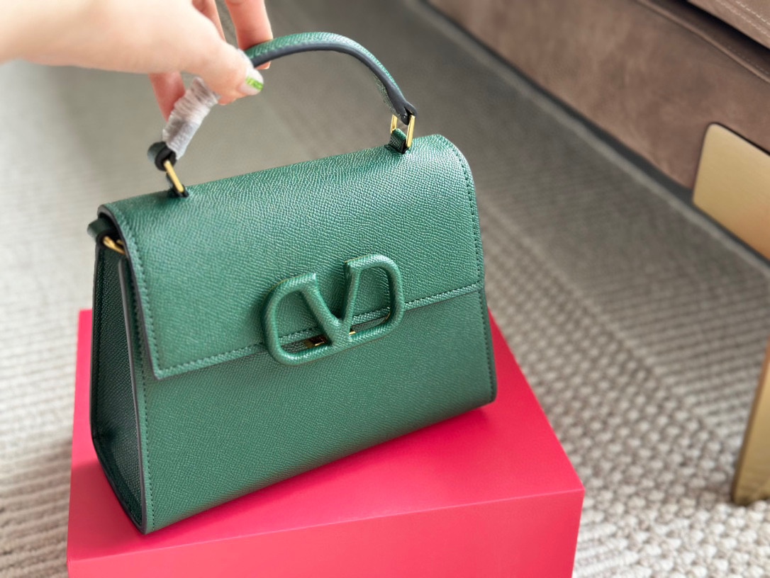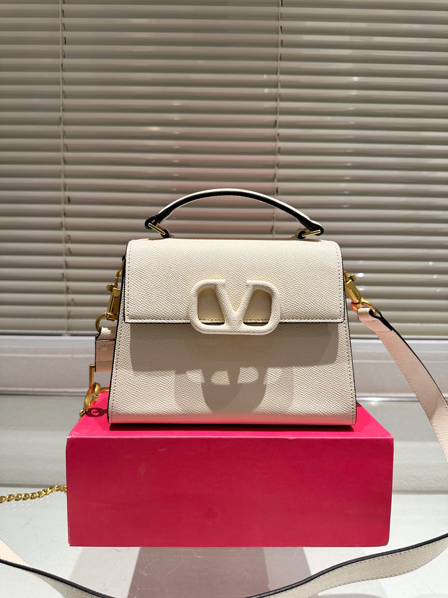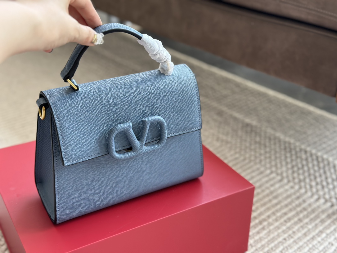 Valentino Grainy Leather Leather-Covered V-Logo Satchel Trapeze Handle Shoulder Bags