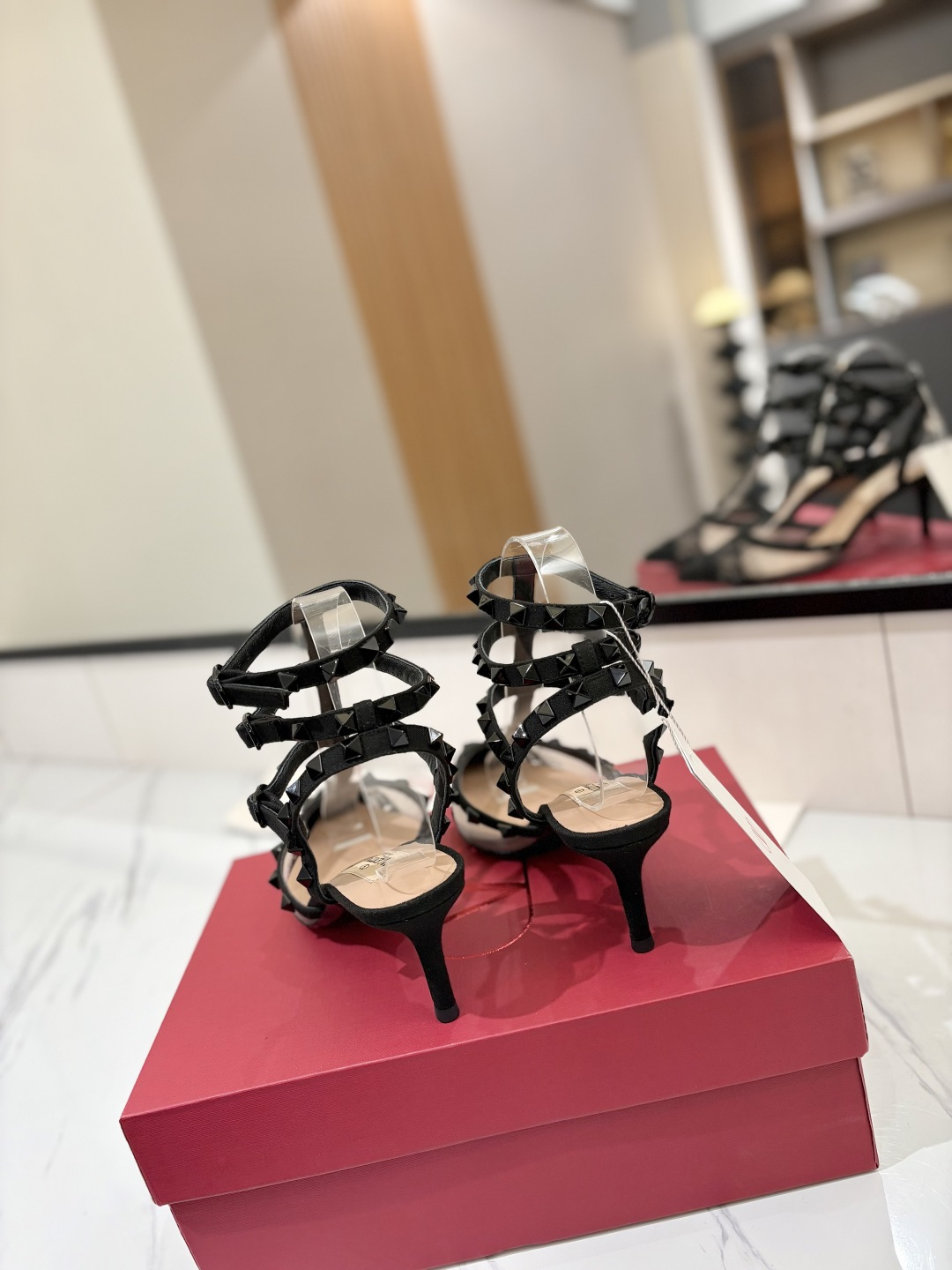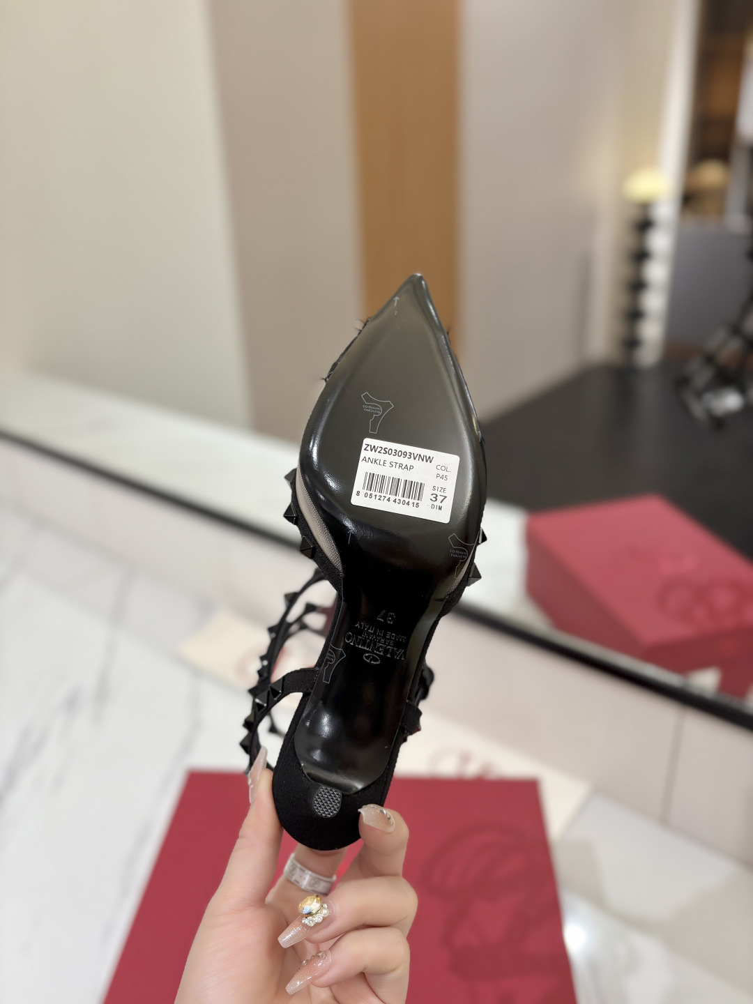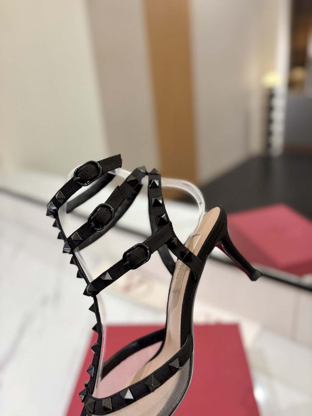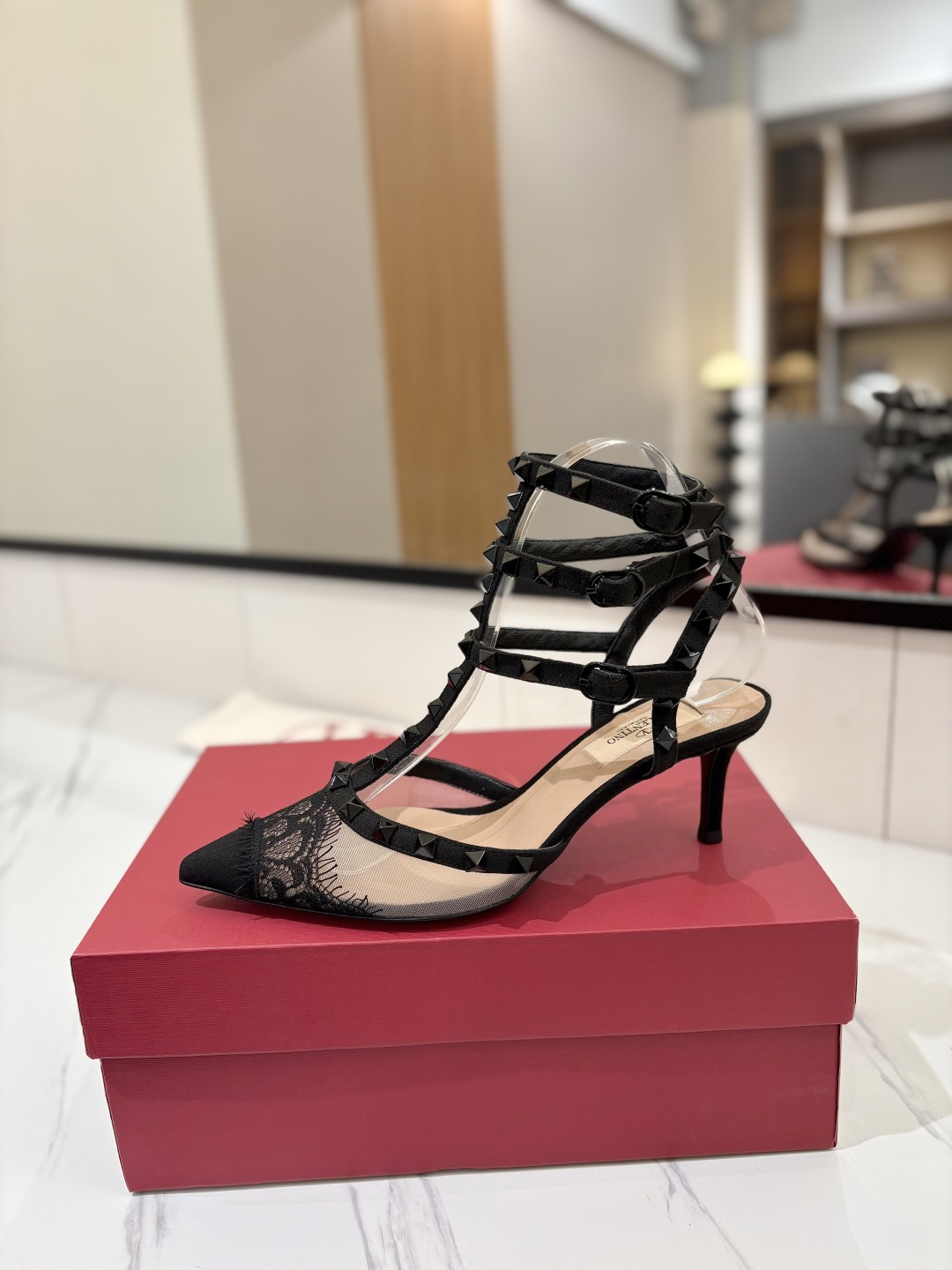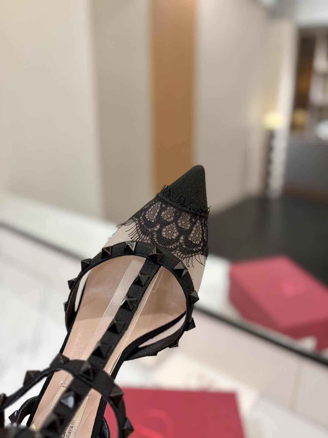 Valentino Rockstud Pointed Toe Triple Straps T-Strap Black Lace Mesh Pyramid Studded Pumps Heels