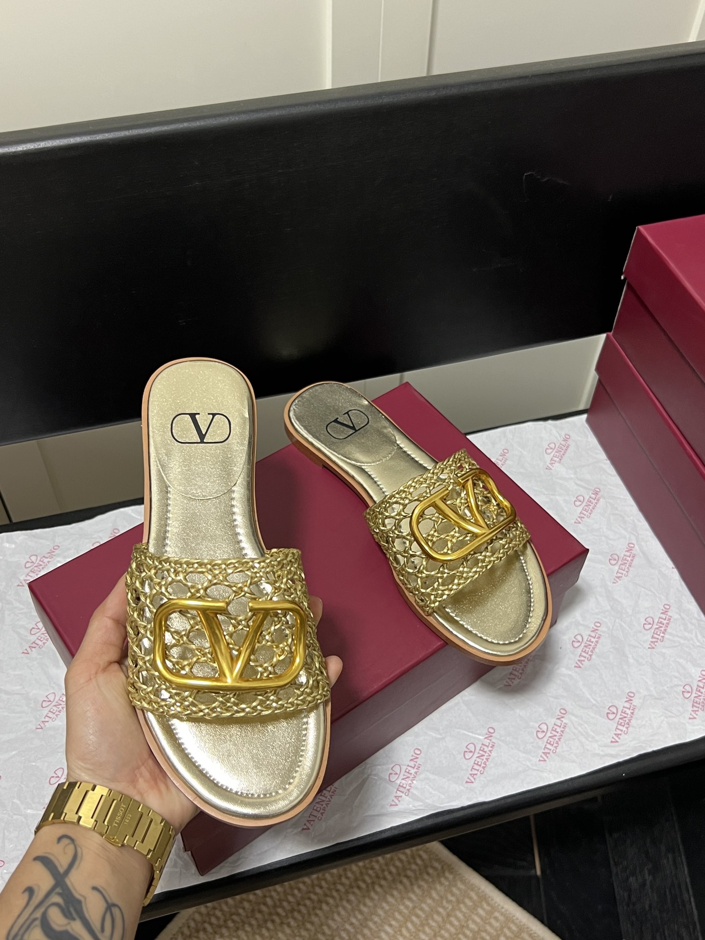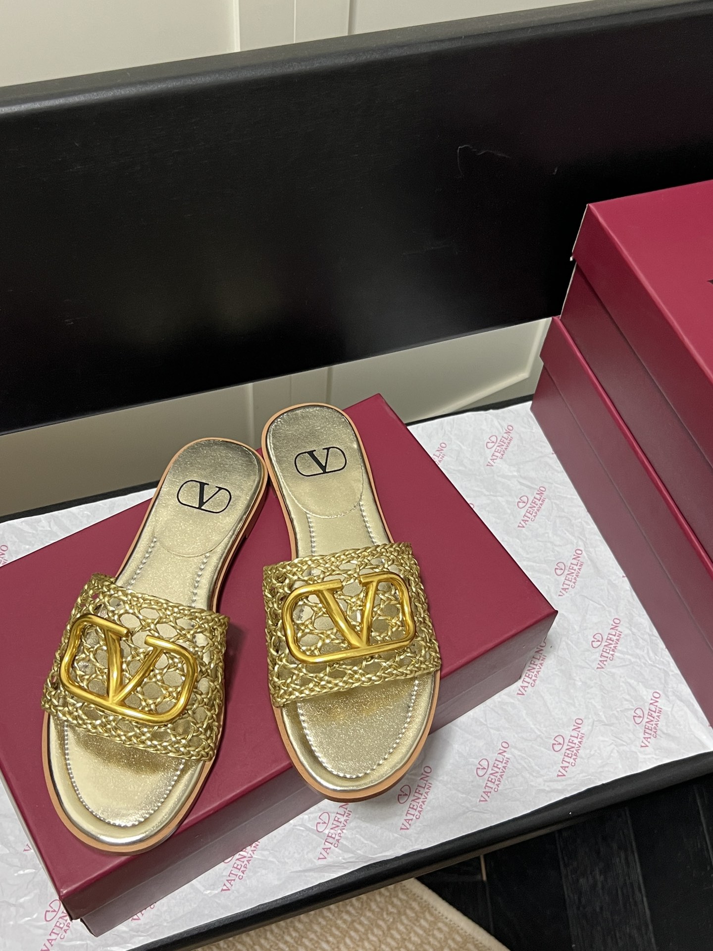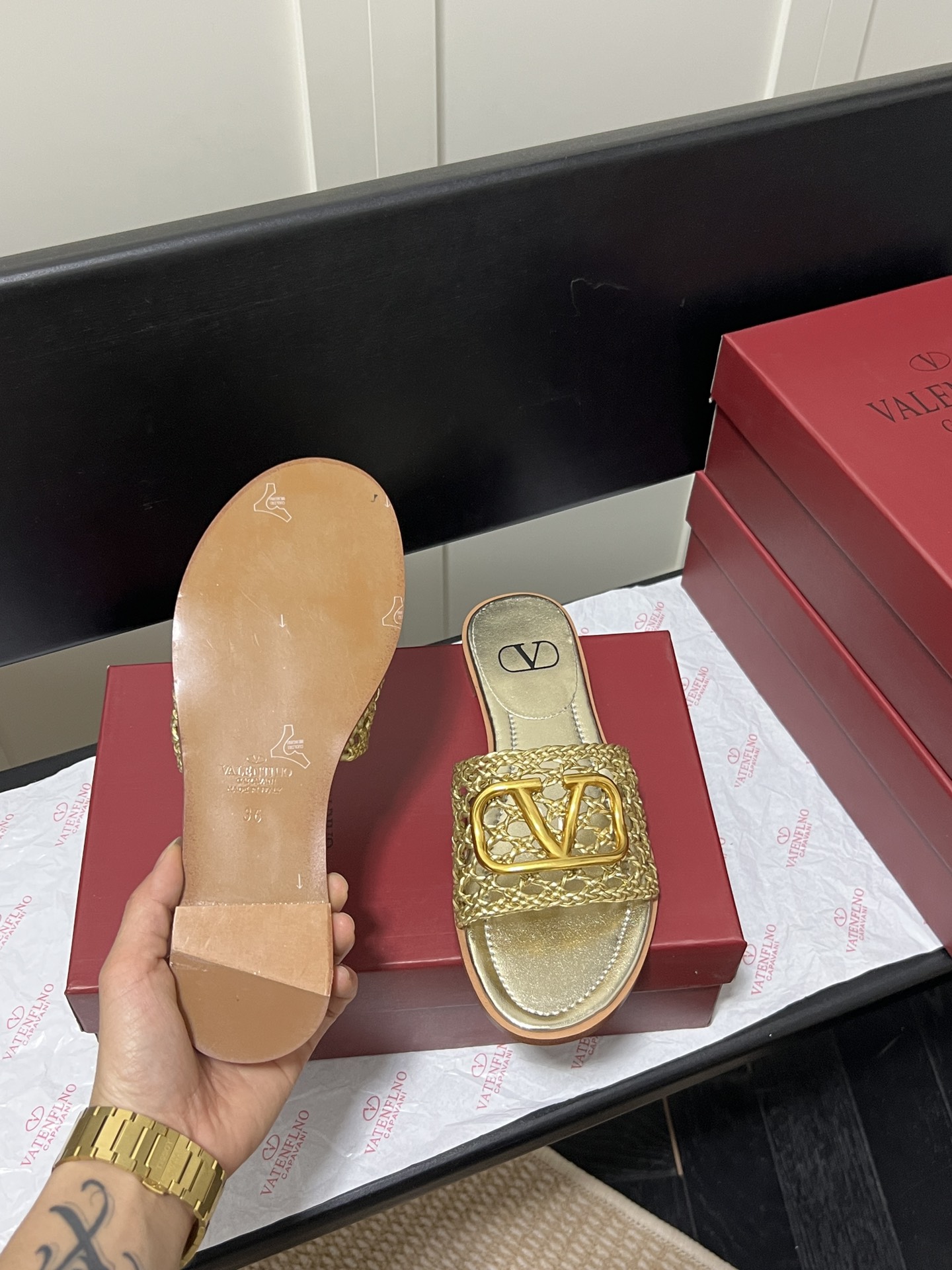 Valentino Garavani Gold VLogo Signature Woven Leather Sandals Flat Slippers