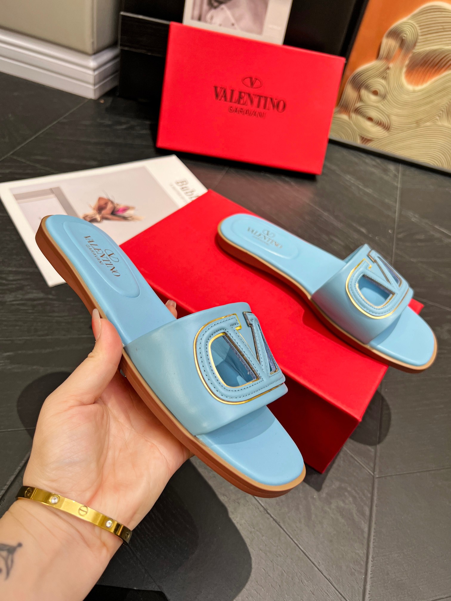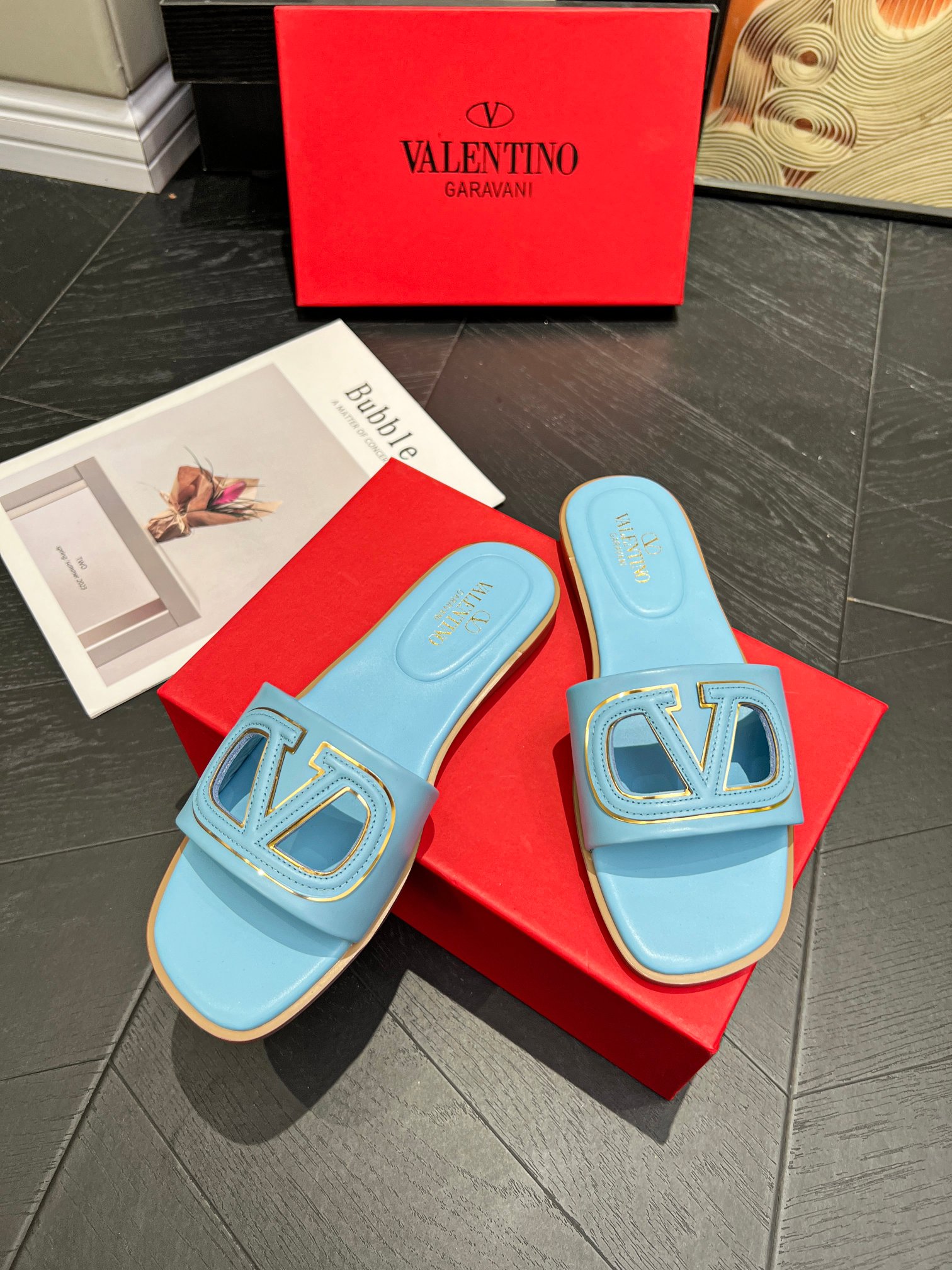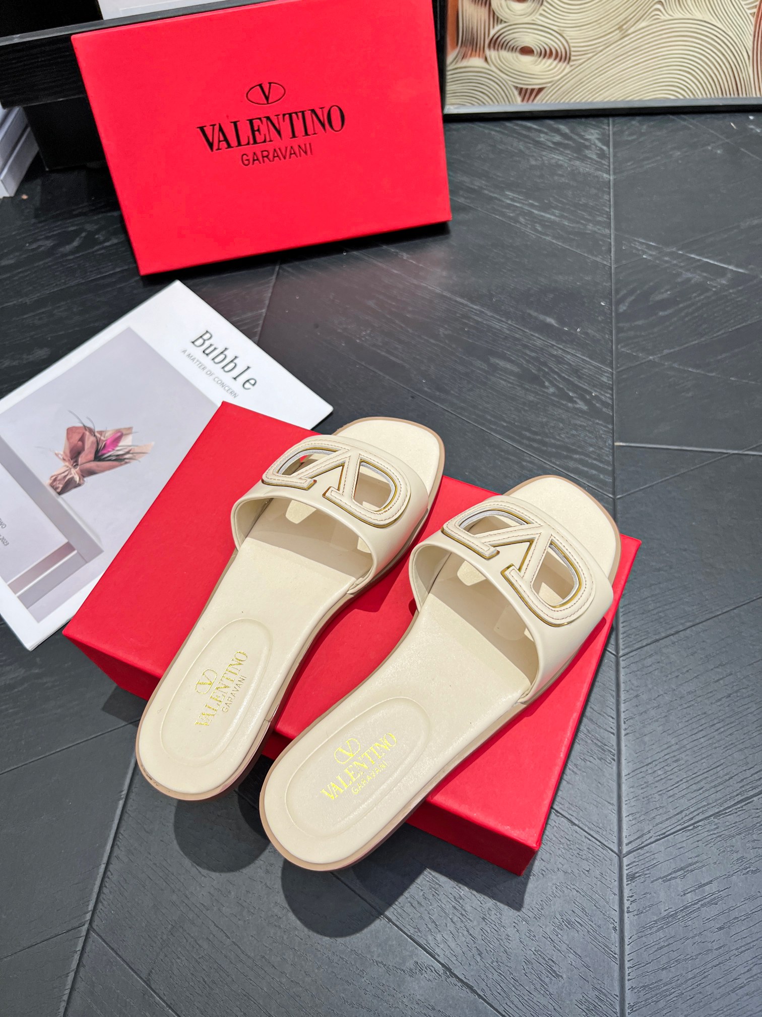 Valentino Garavani Cut-Out Large VLogo Signature Smooth Leather Gold-Trim Flat Slippers